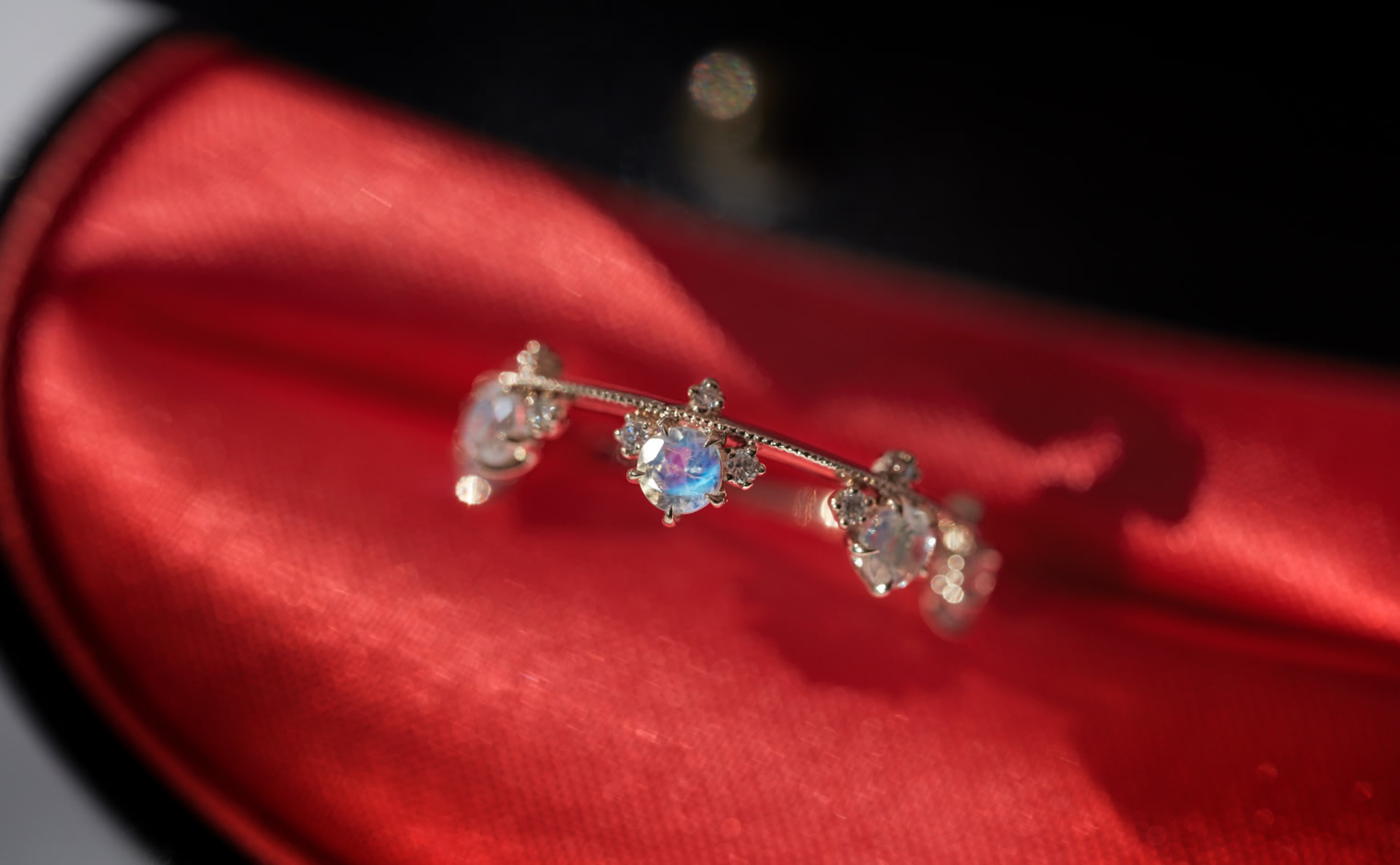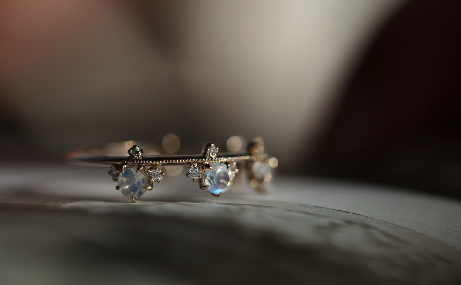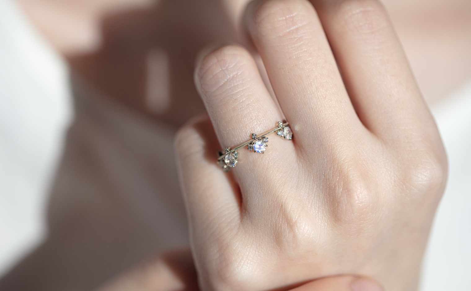 Set perched on top of an elegant, thin band of your choice of custom-blended metal, these Rainbow Moonstones seem to glow from within across your finger while smaller brilliant diamonds sparkle and play with the light. -