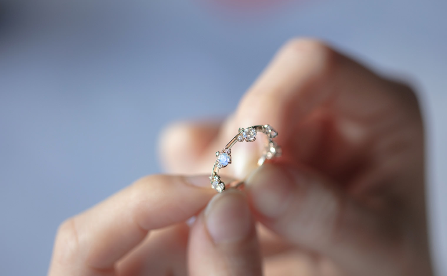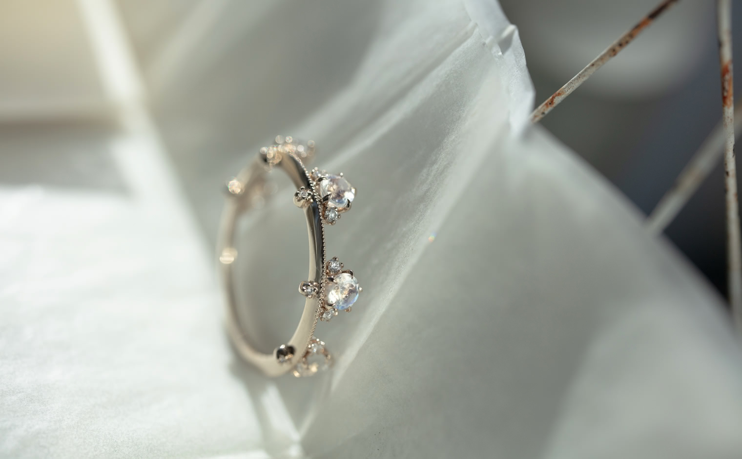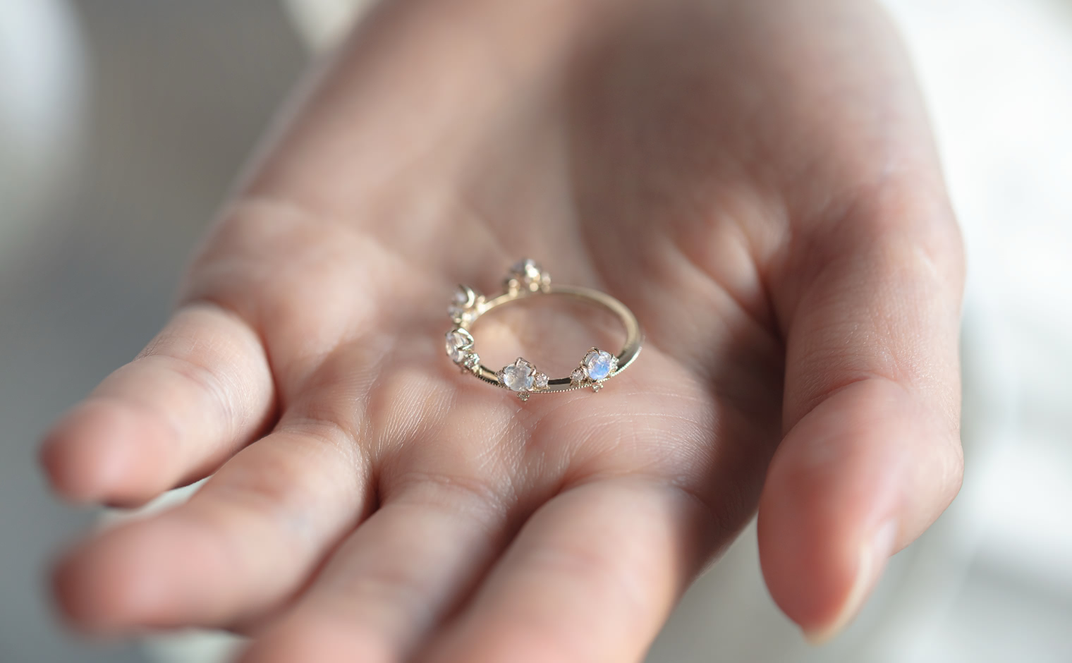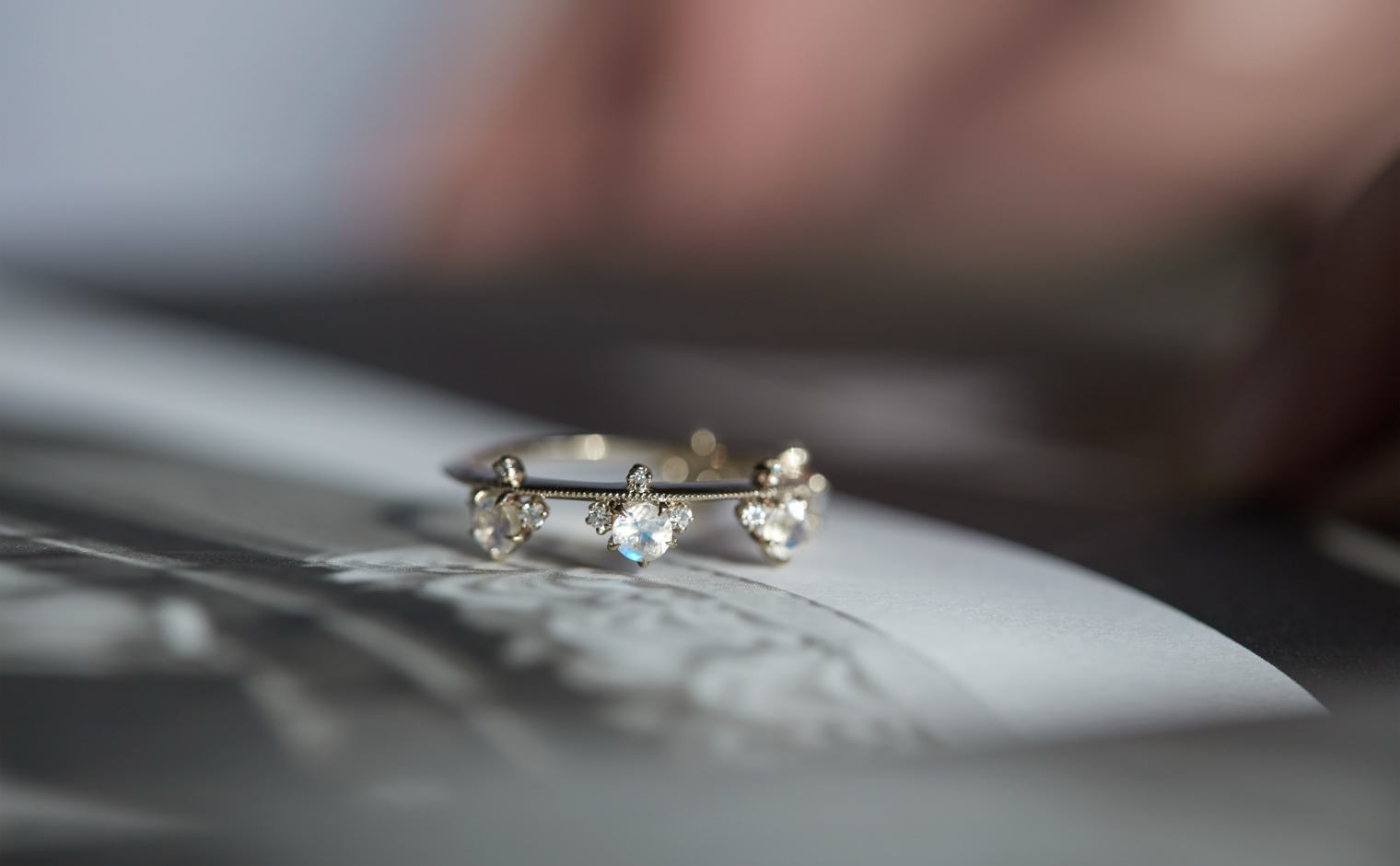 Set perched on top of an elegant, thin band of your choice of custom-blended metal, these Rainbow Moonstones seem to glow from within across your finger while smaller brilliant diamonds sparkle and play with the light. -