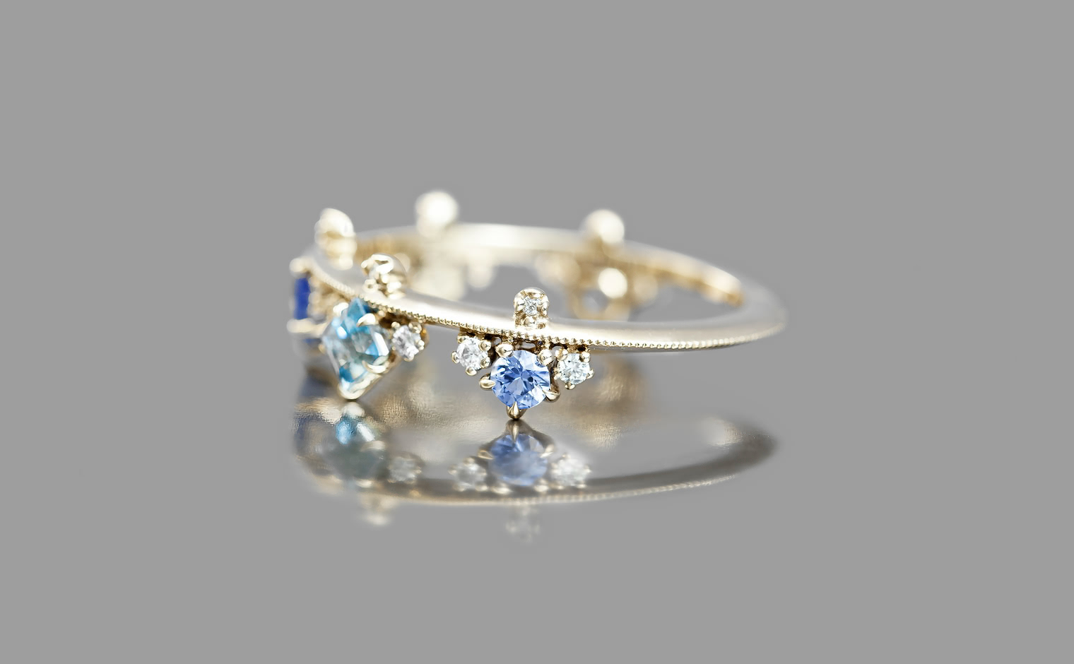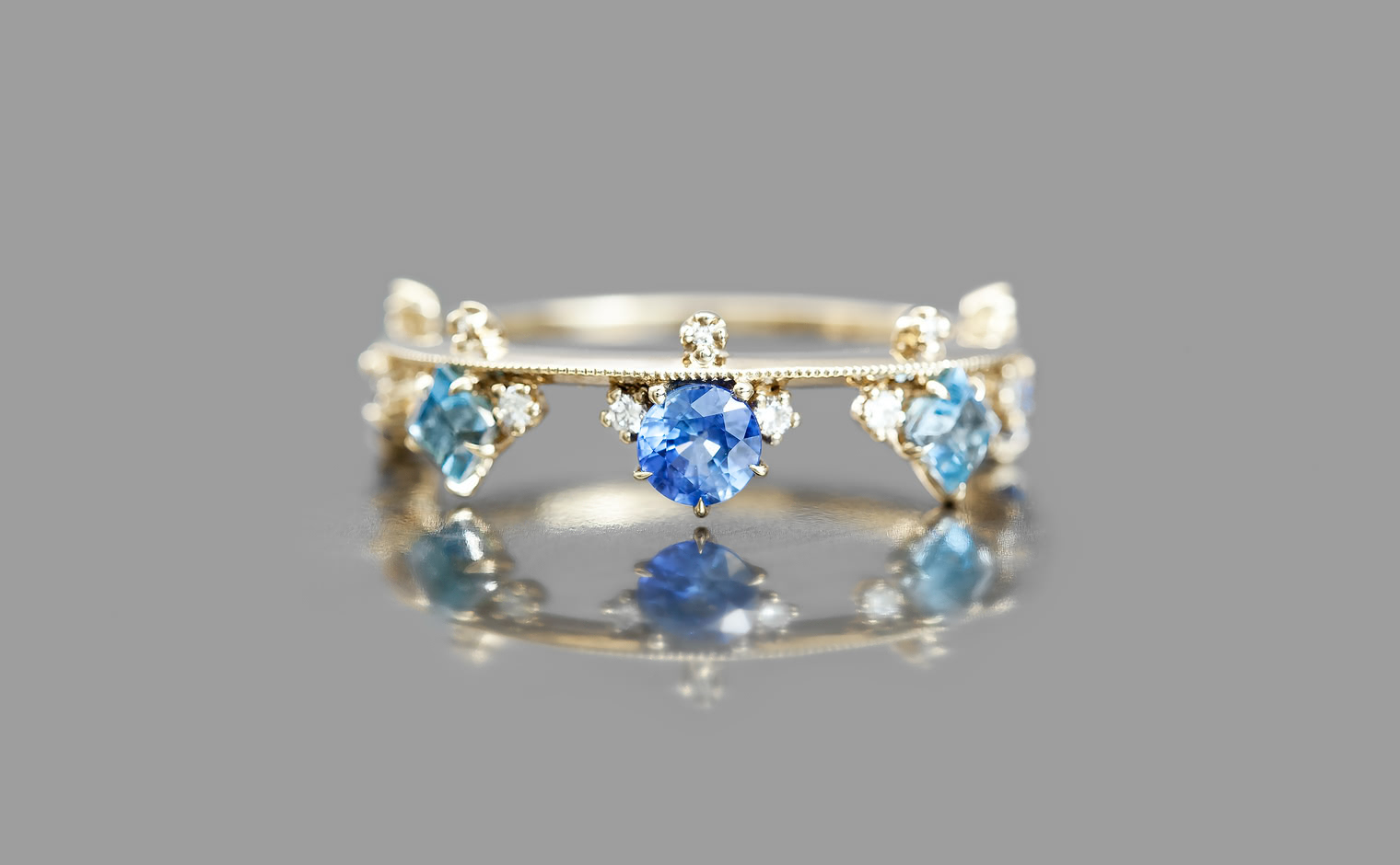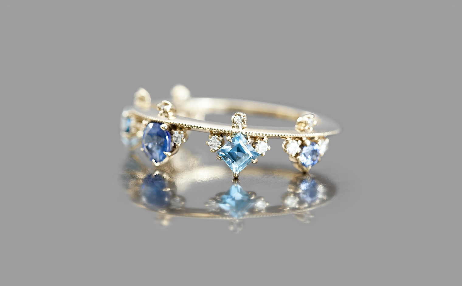 A kataoka staple, this ring combines the playful hues of sapphires and aquamarines to balance on a thin band of custom-blended gold.