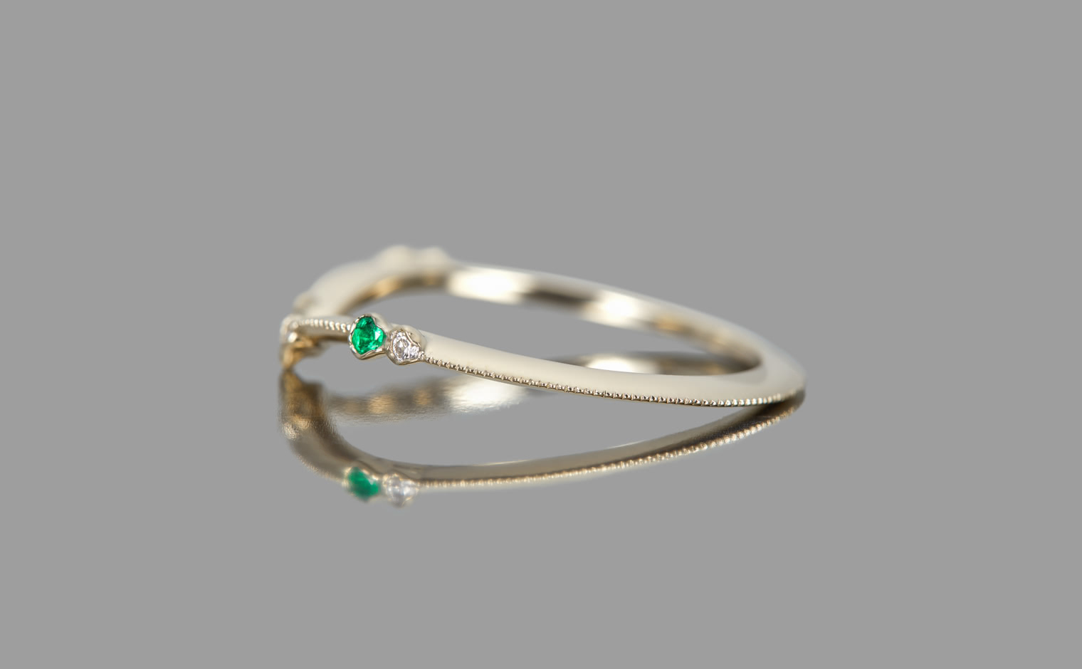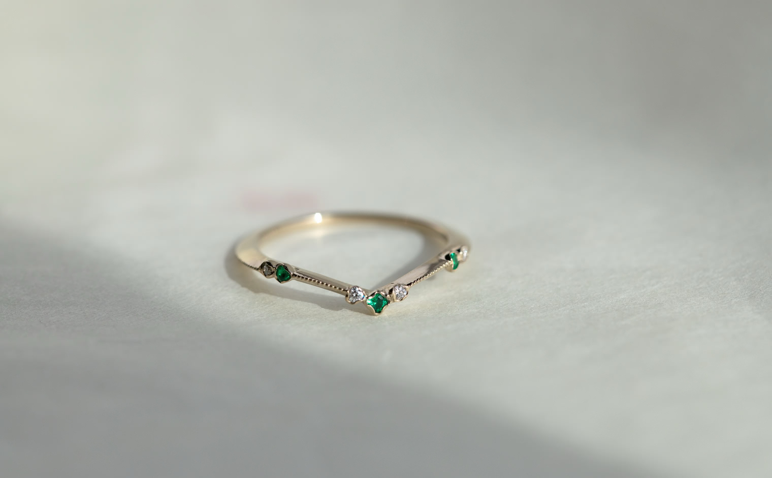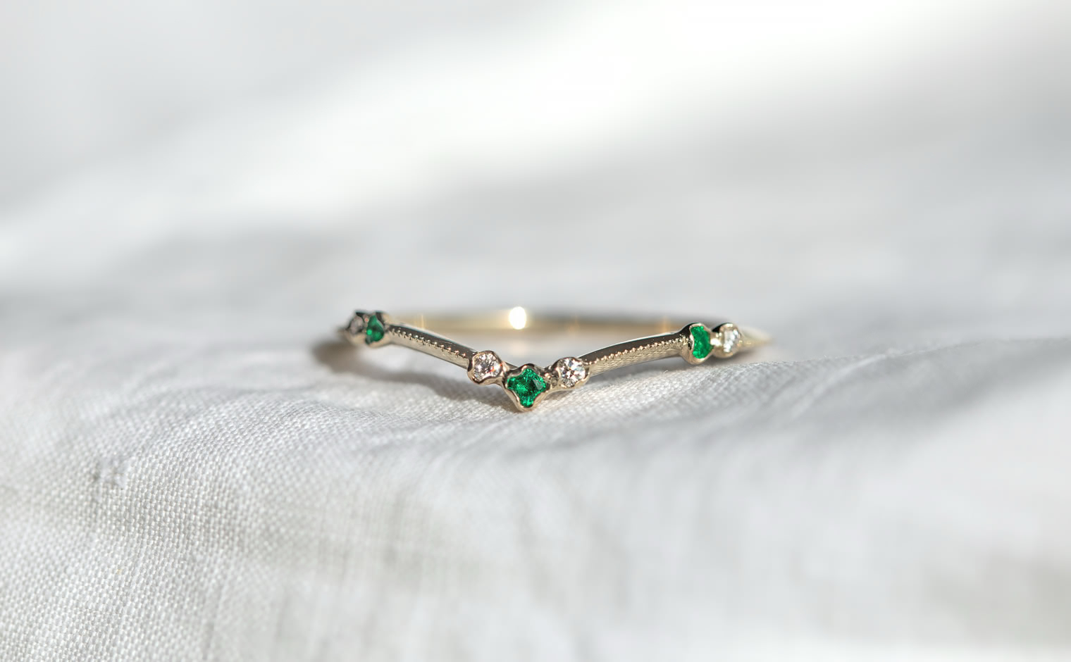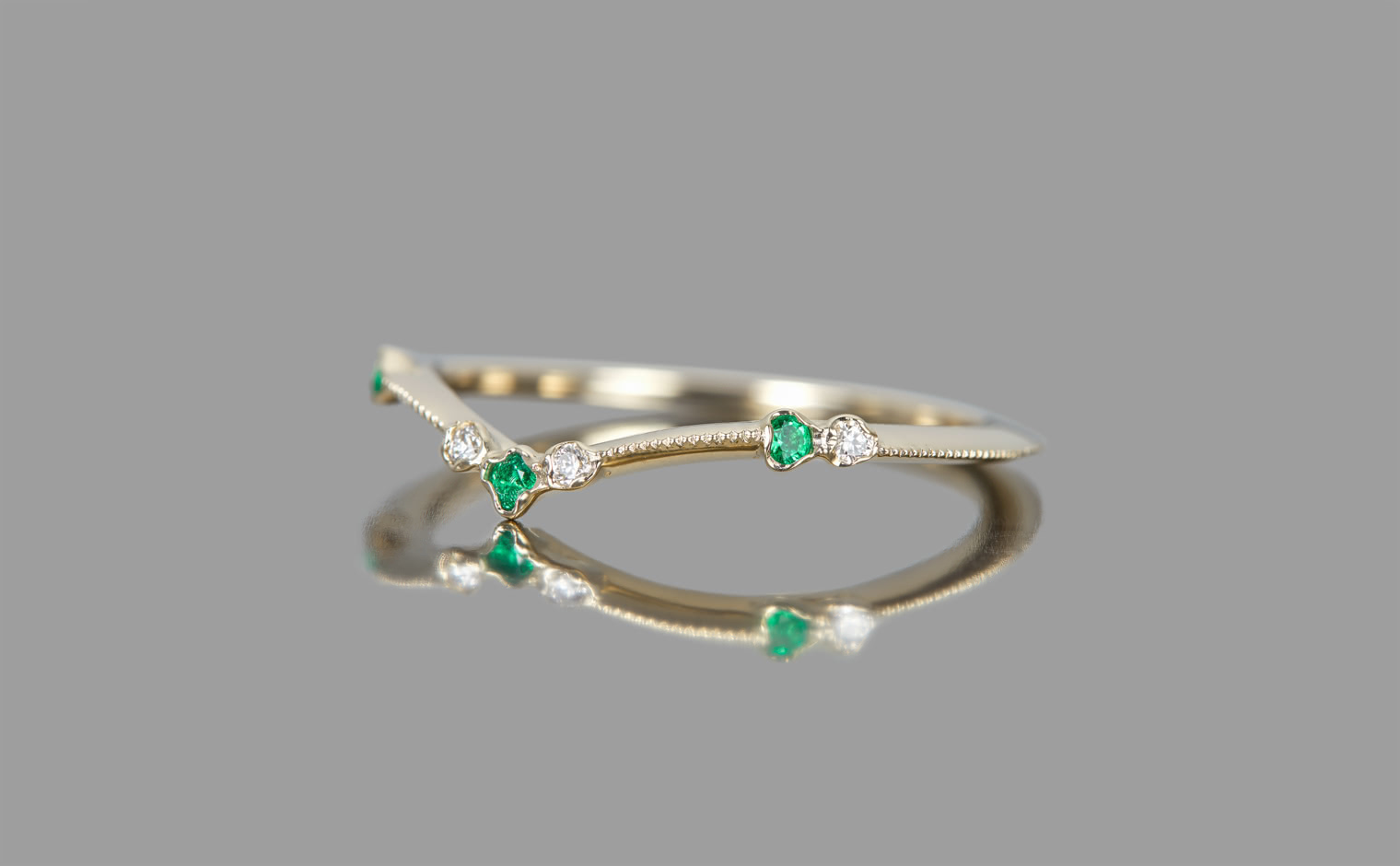 Emeralds and diamonds in quiet glow, their radiance flowing with natural elegance. The Curved Emerald Ring reflects delicate artistry, a lasting expression of sophistication—graceful, radiant, and enduring.