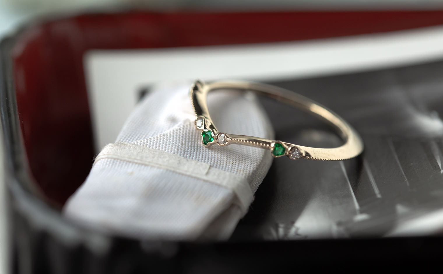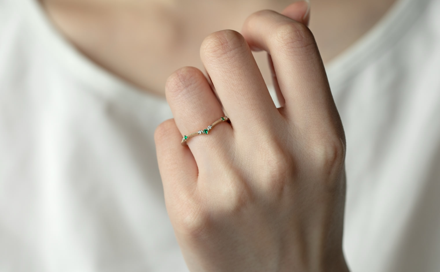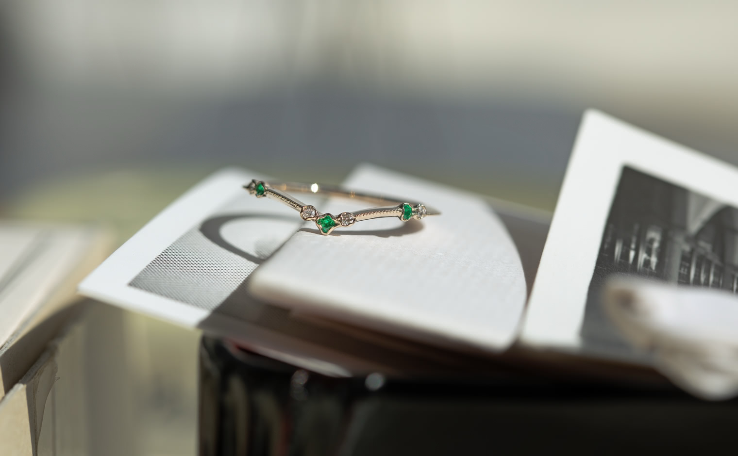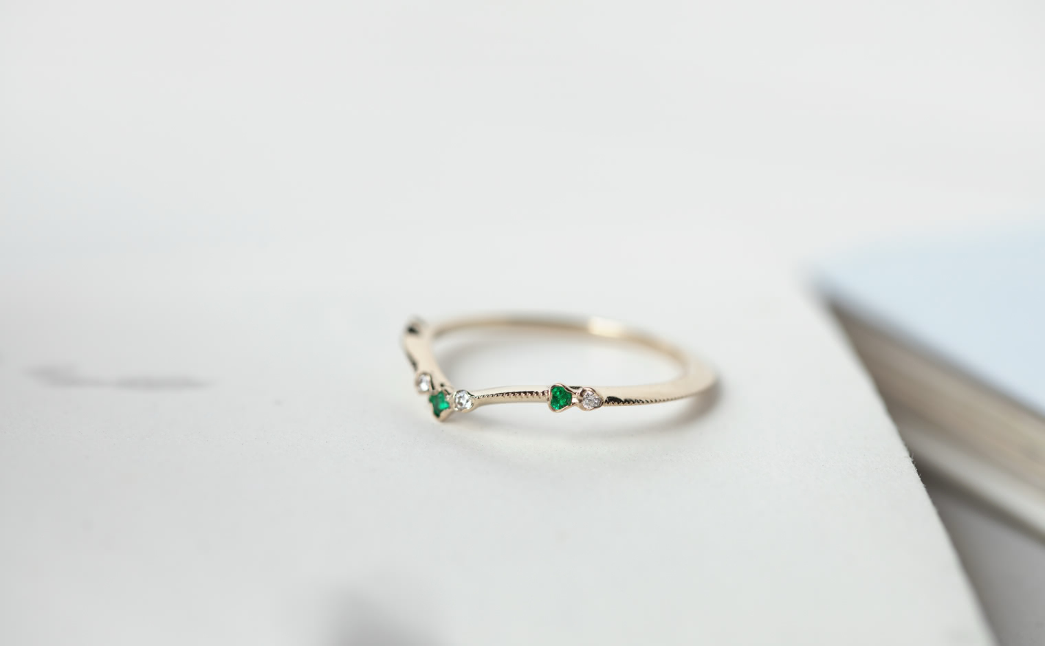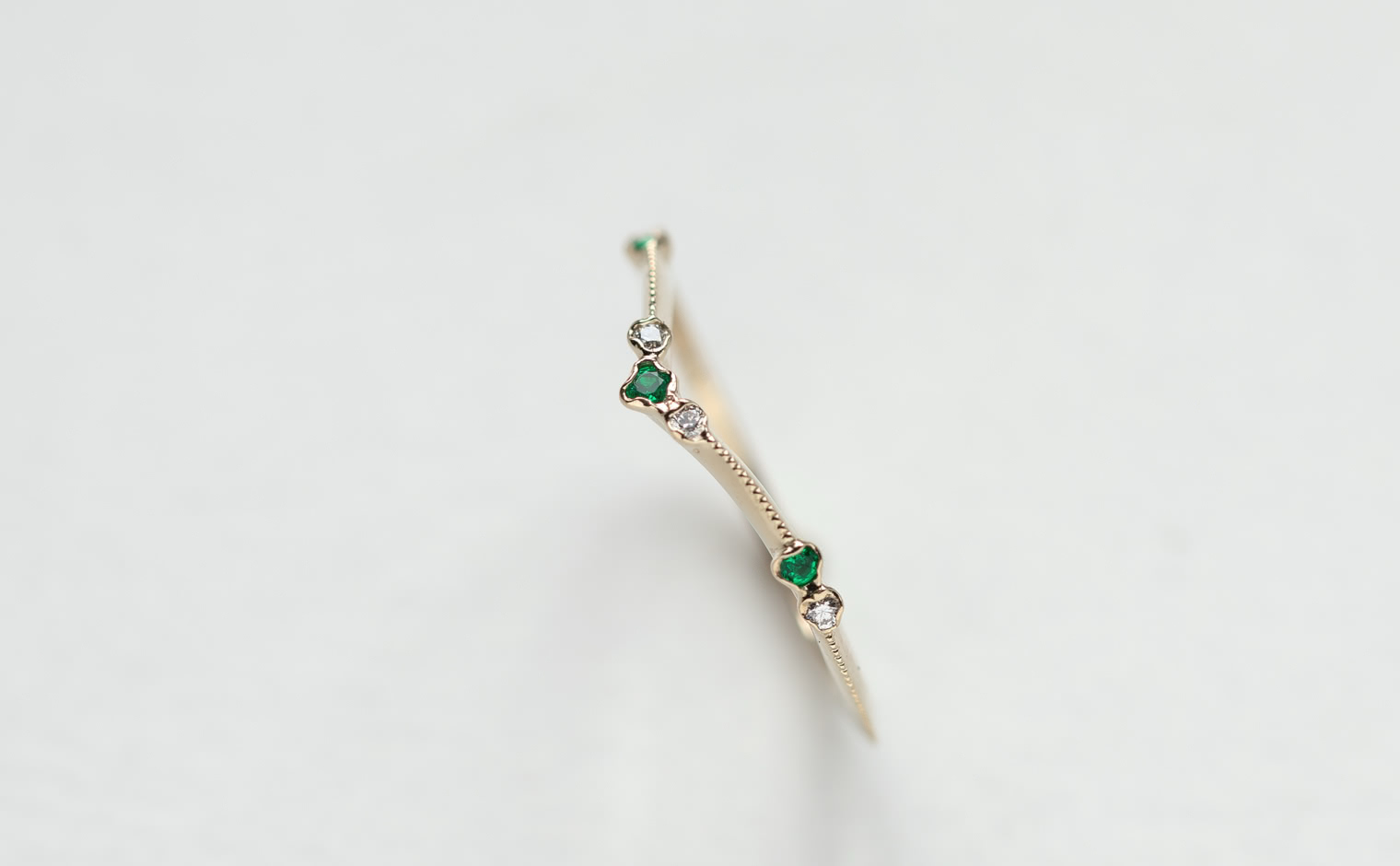Emeralds and diamonds in quiet glow, their radiance flowing with natural elegance. The Curved Emerald Ring reflects delicate artistry, a lasting expression of sophistication—graceful, radiant, and enduring.