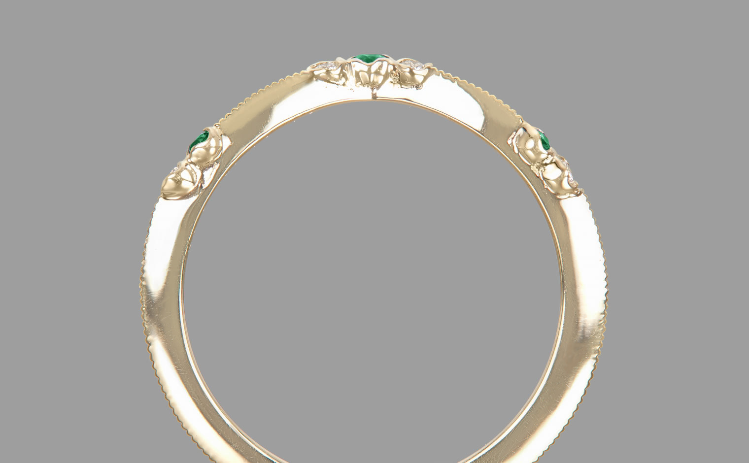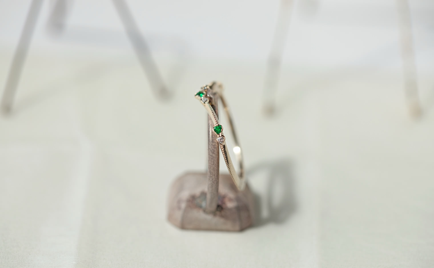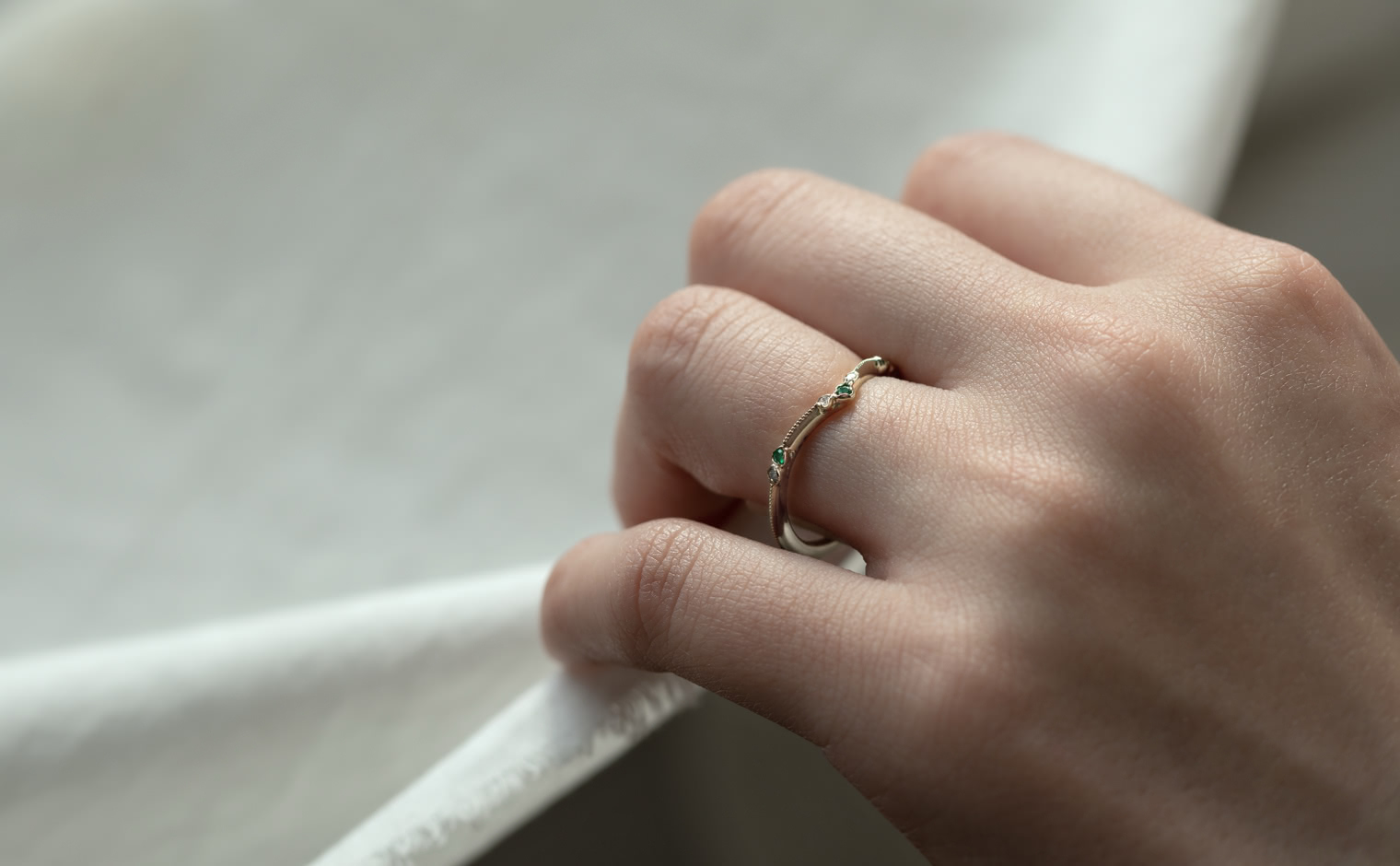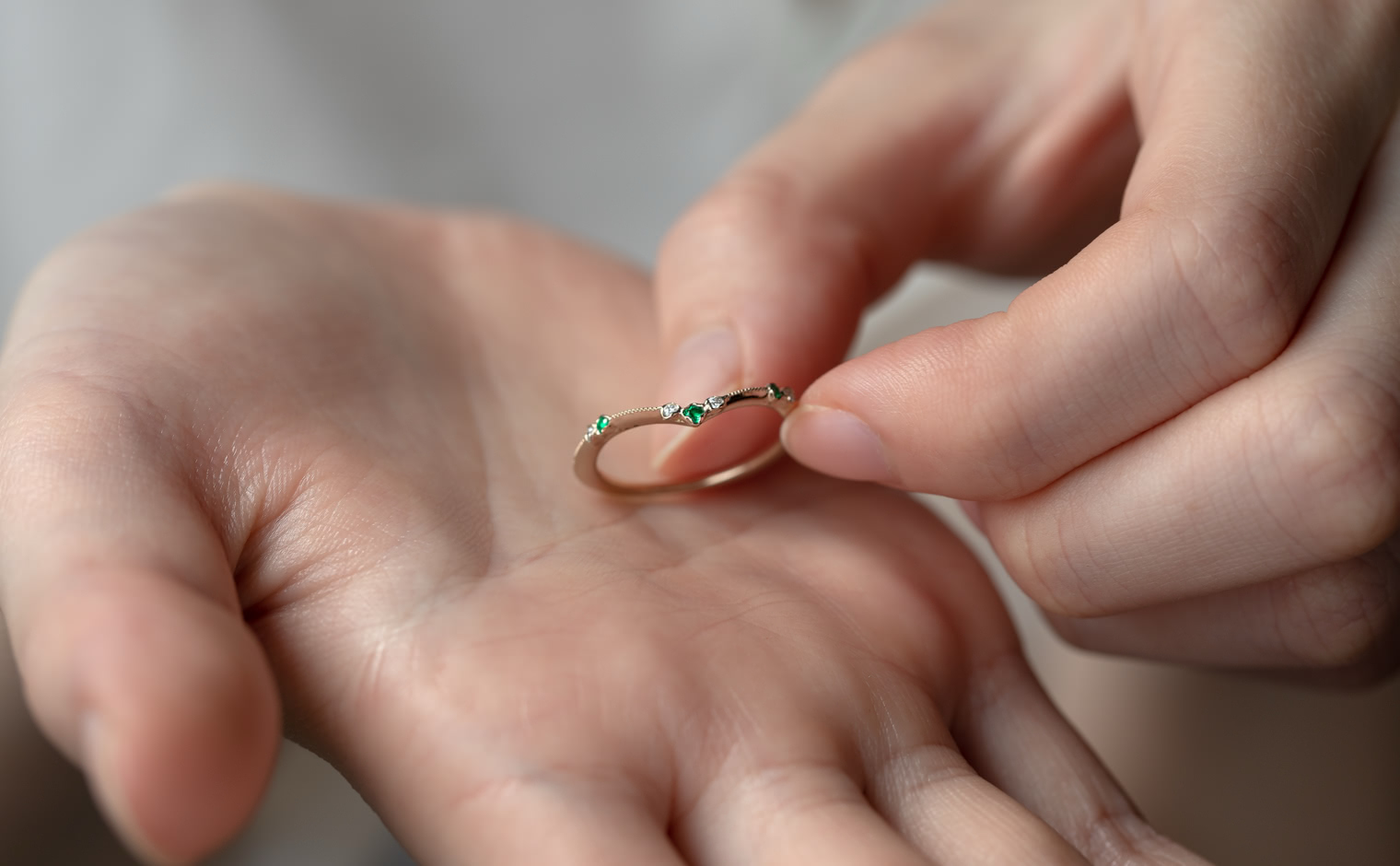 Emeralds and diamonds in quiet glow, their radiance flowing with natural elegance. The Curved Emerald Ring reflects delicate artistry, a lasting expression of sophistication—graceful, radiant, and enduring.