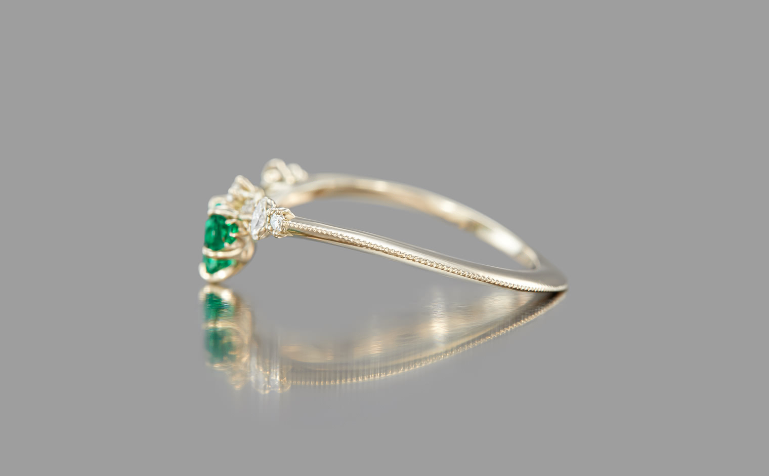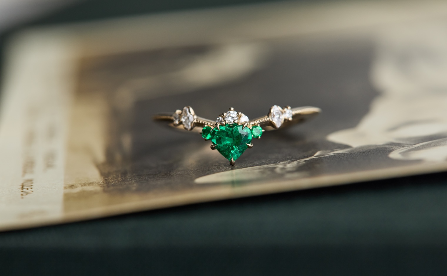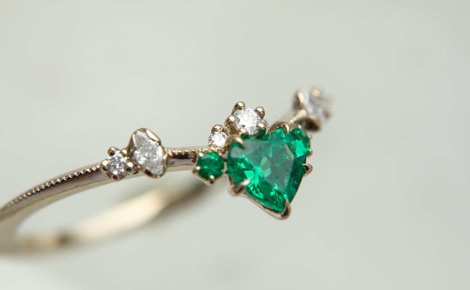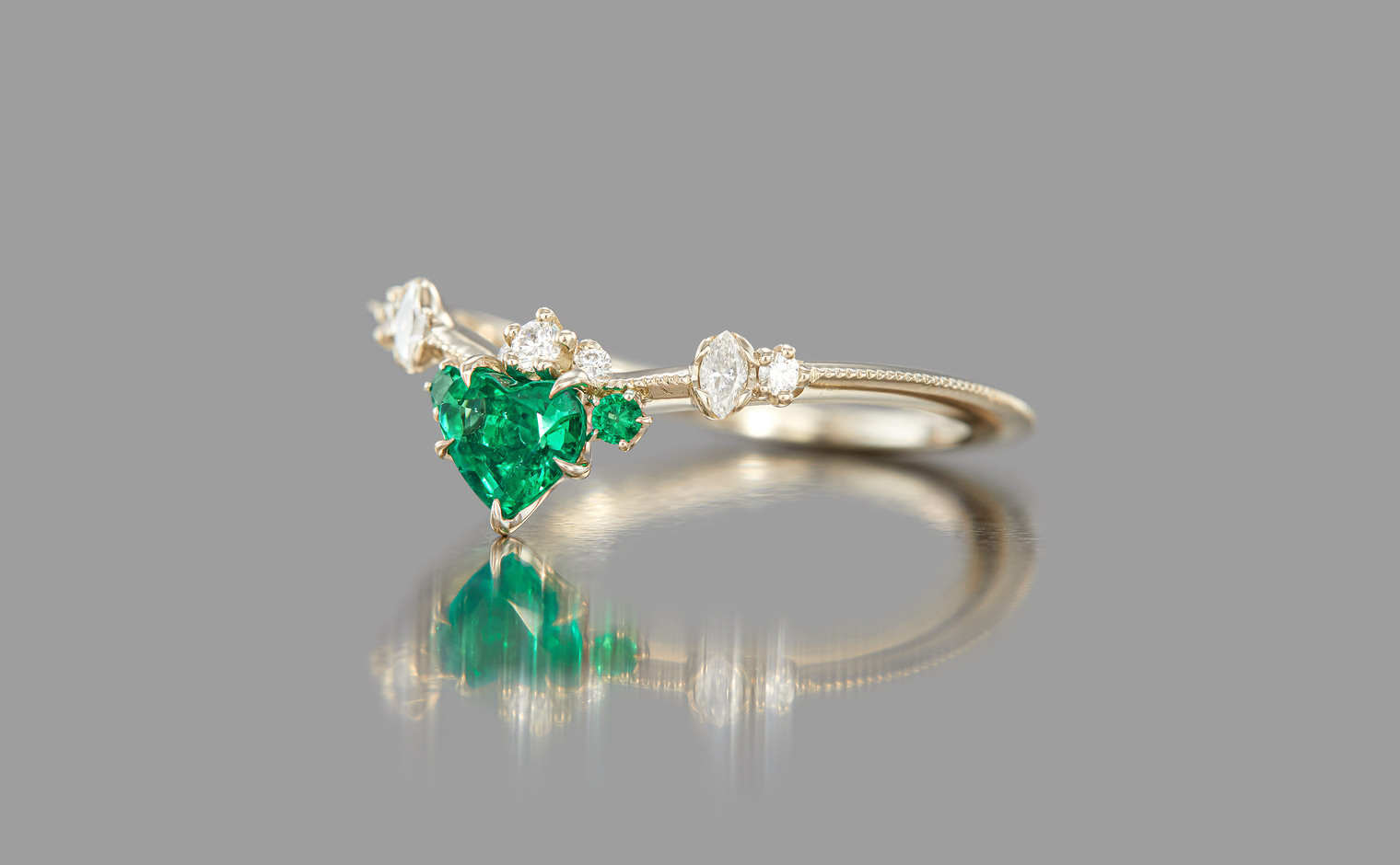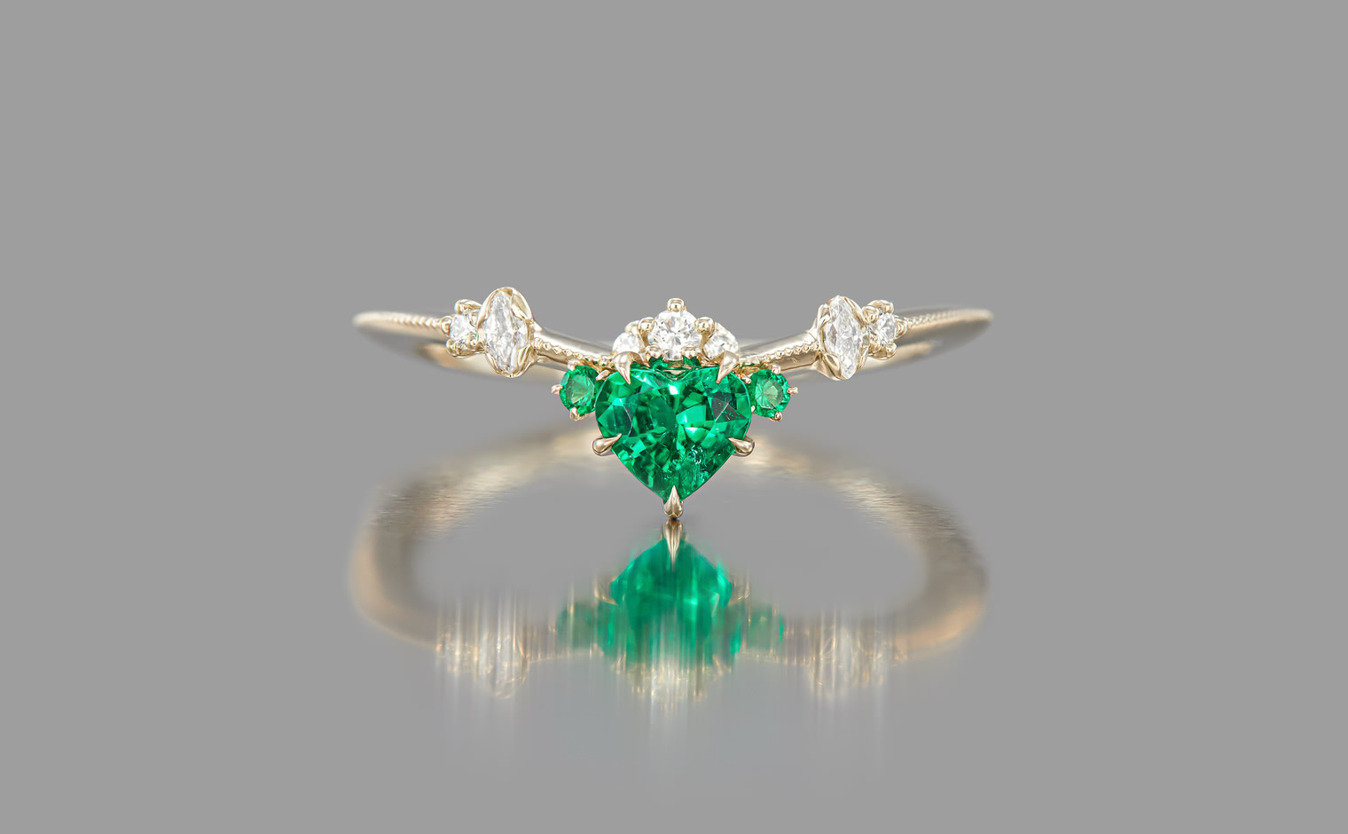 Let love endure until the end of time with its vibrant deep green heart-shaped emerald center stone accented by smaller emeralds and delectable diamonds set gracefully on a slim, curved milgrain-applied beige gold band. The Curved Heart Ring-Emerald is a testament to timelessness and beauty that shall inspire evermore.