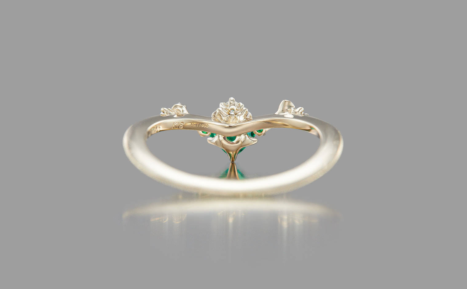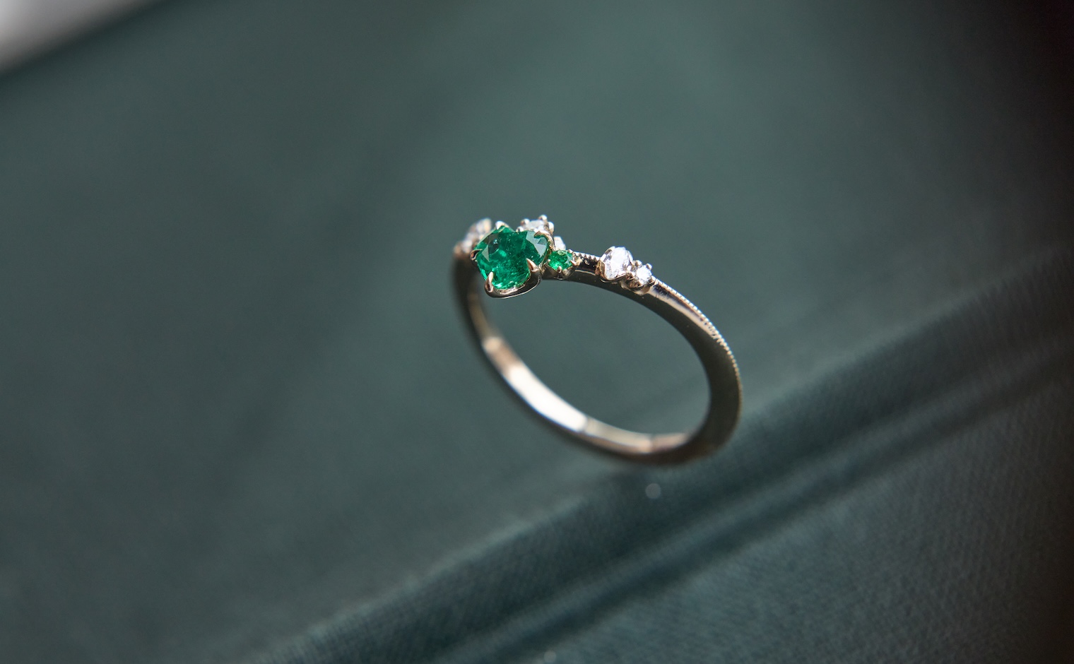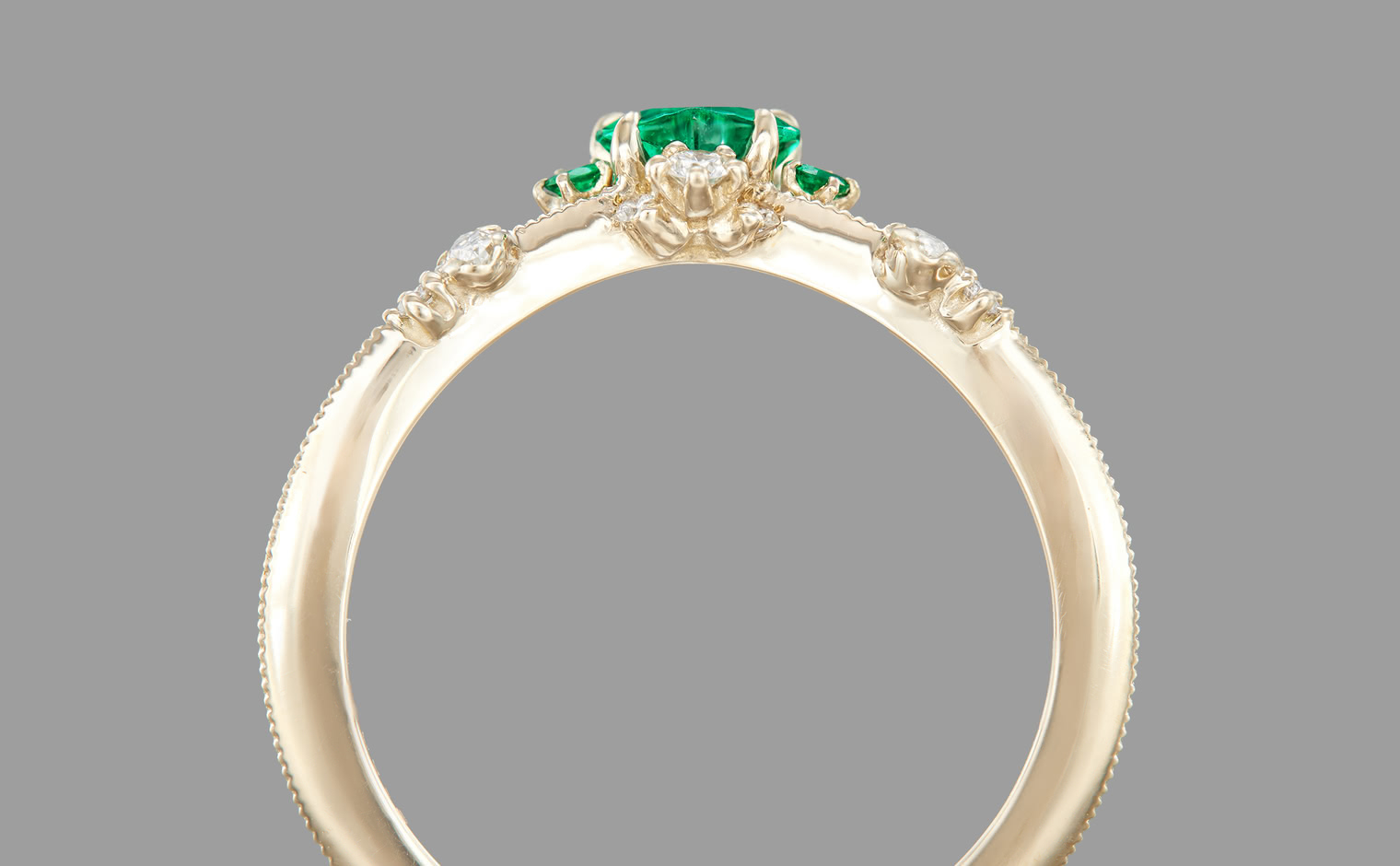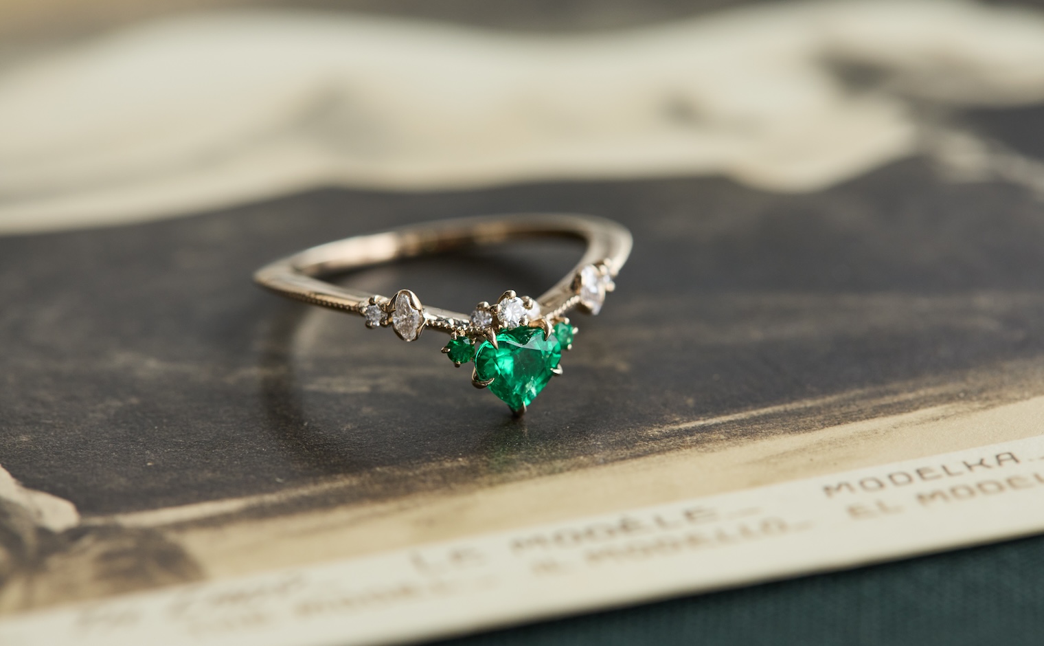 Let love endure until the end of time with its vibrant deep green heart-shaped emerald center stone accented by smaller emeralds and delectable diamonds set gracefully on a slim, curved milgrain-applied beige gold band. The Curved Heart Ring-Emerald is a testament to timelessness and beauty that shall inspire evermore.