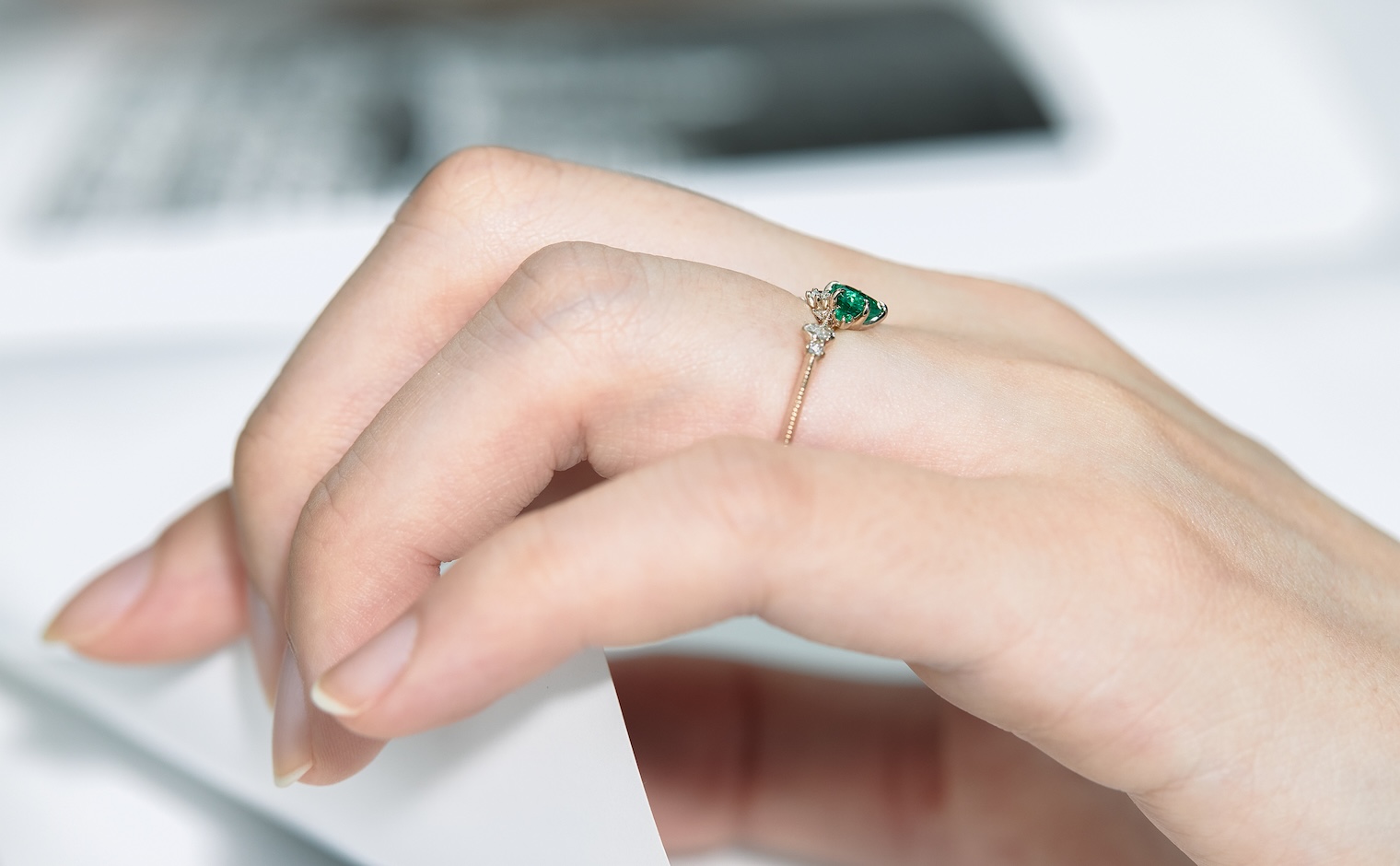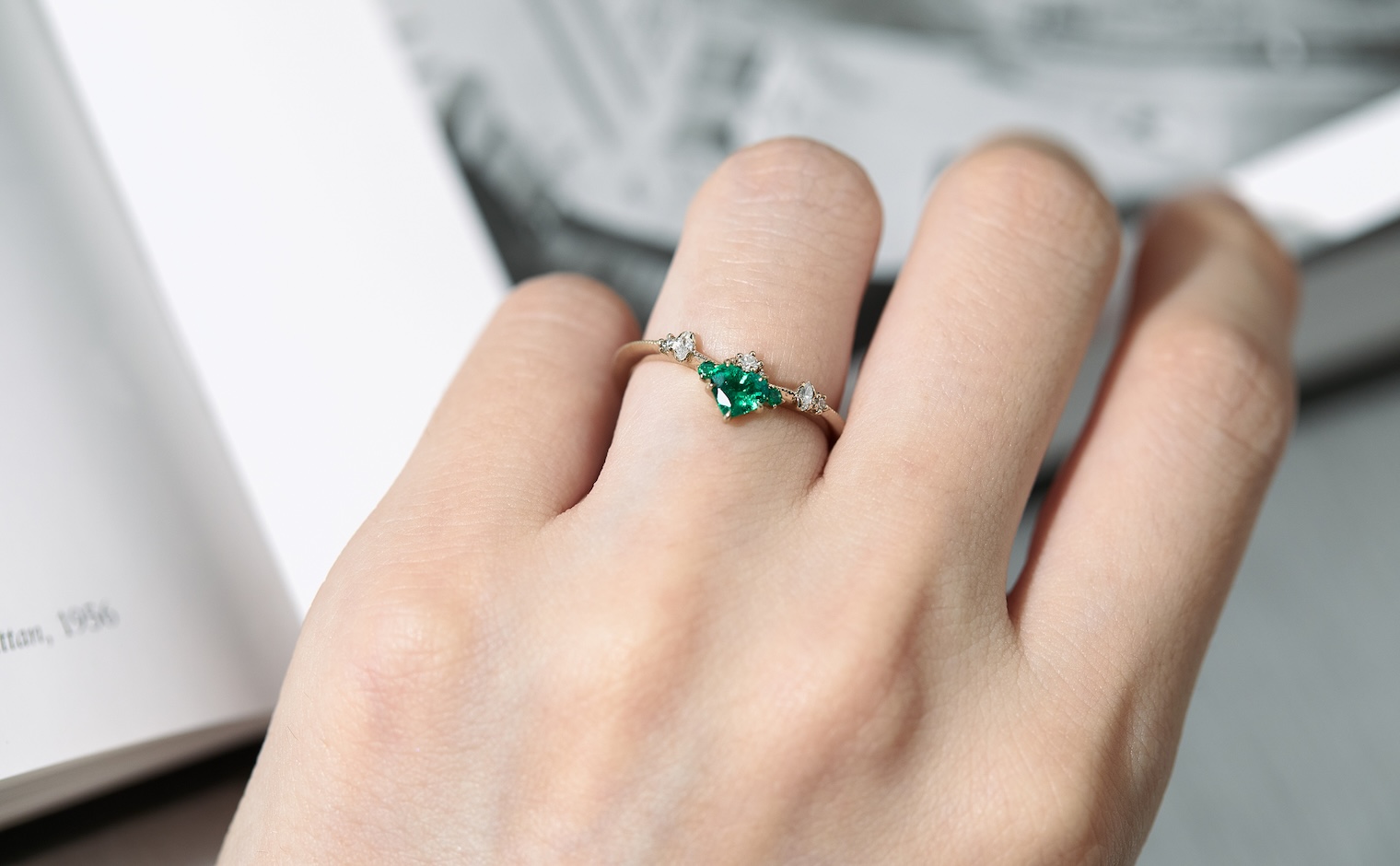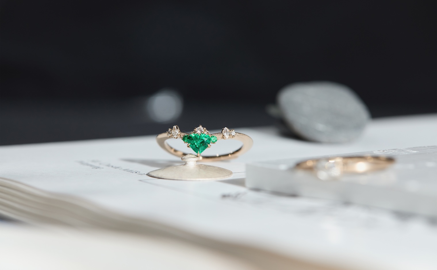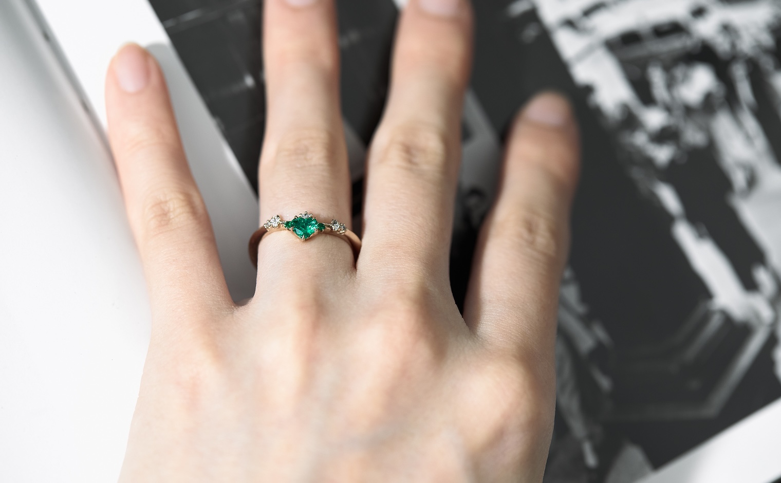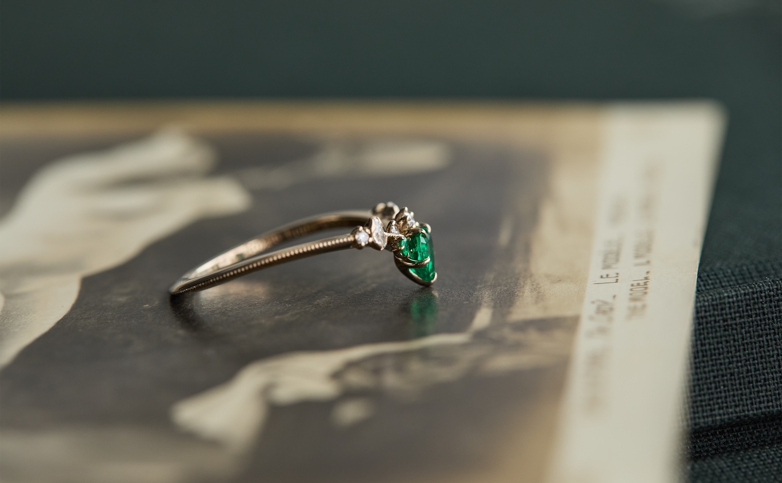 Let love endure until the end of time with its vibrant deep green heart-shaped emerald center stone accented by smaller emeralds and delectable diamonds set gracefully on a slim, curved milgrain-applied beige gold band. The Curved Heart Ring-Emerald is a testament to timelessness and beauty that shall inspire evermore.