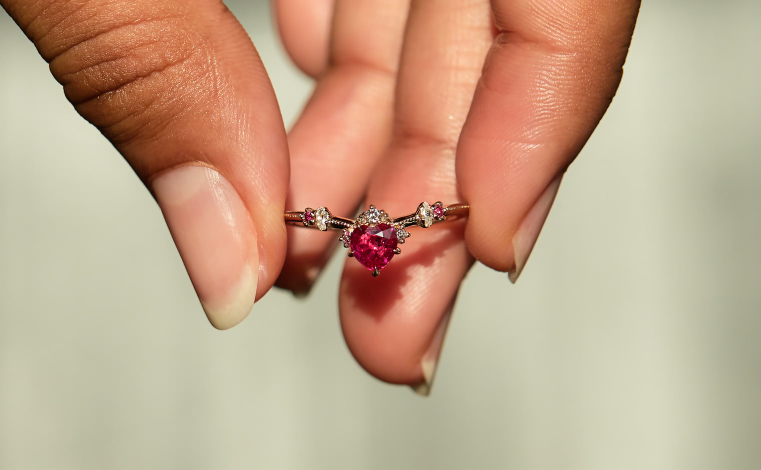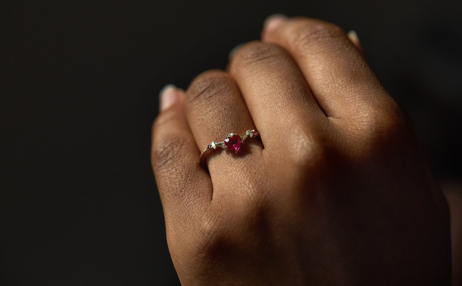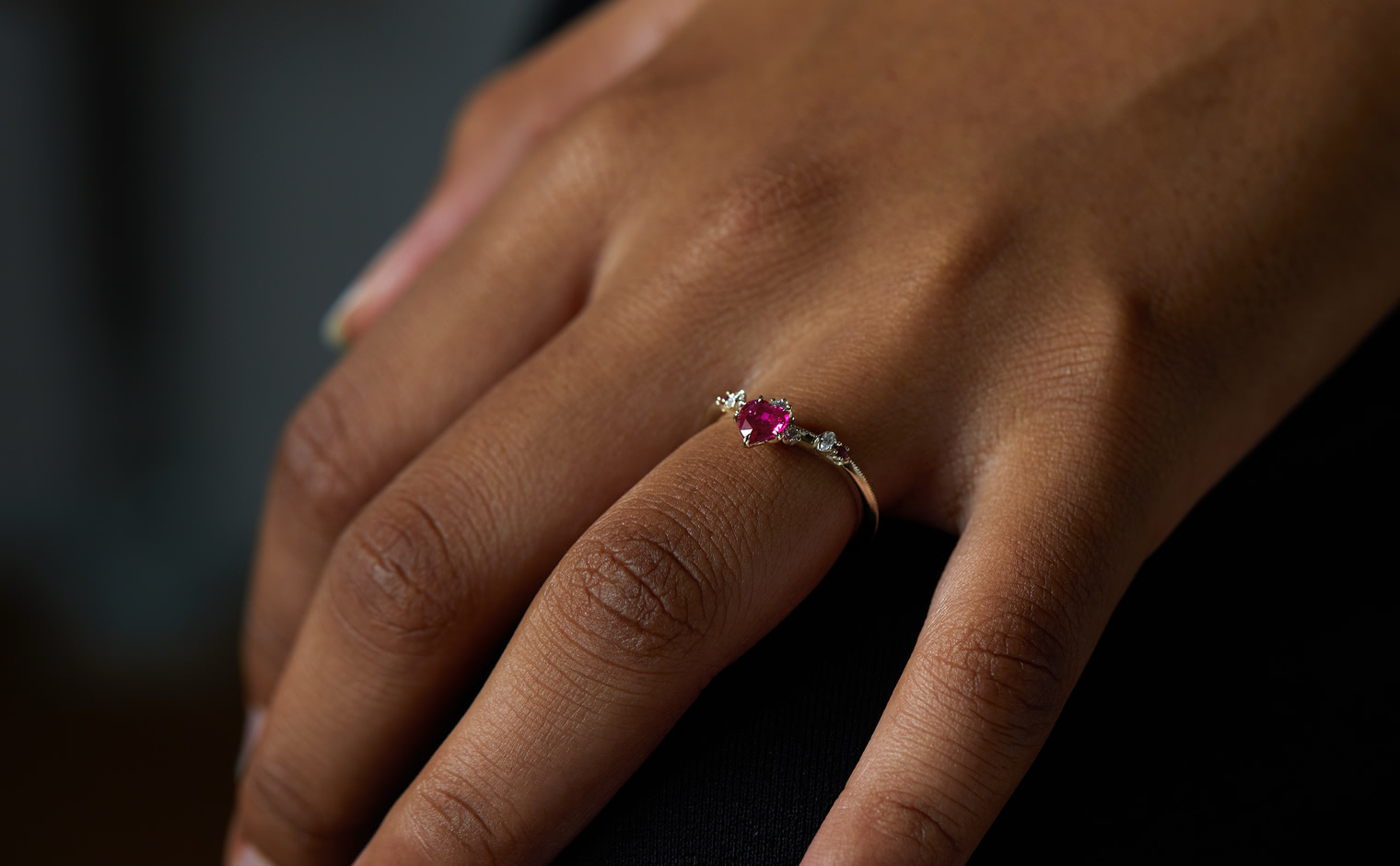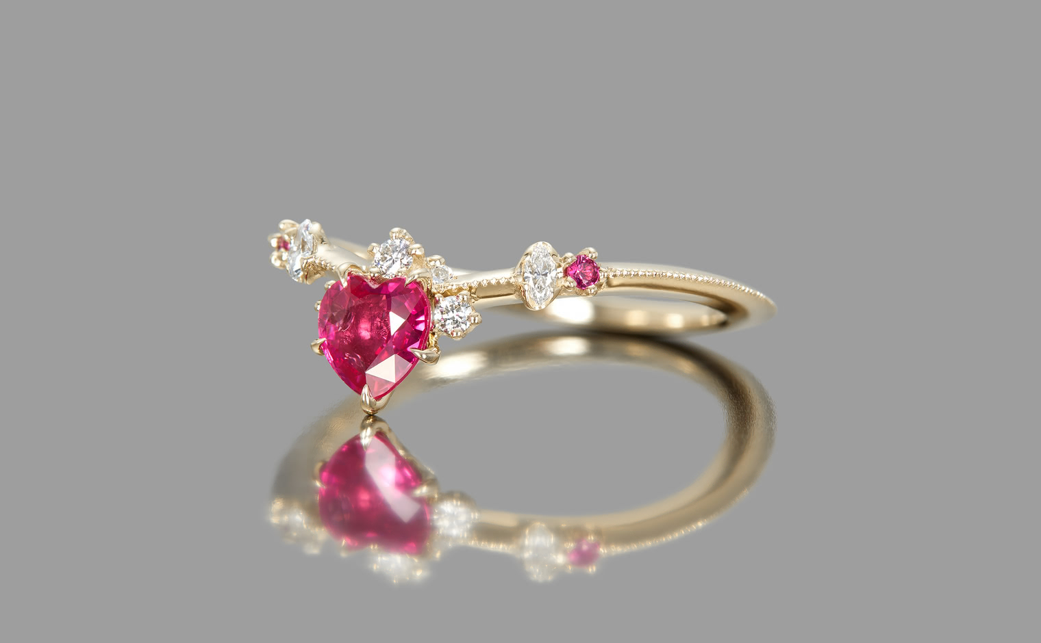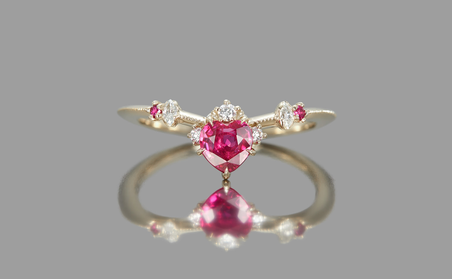 This intense, heart-shaped, vivid ruby smolders next to brilliantly sparkling white diamonds that crown the top and sweep out from the sides along an elegantly thin band which has been expertly and gracefully hand-textured to make this ring your new head-turner.