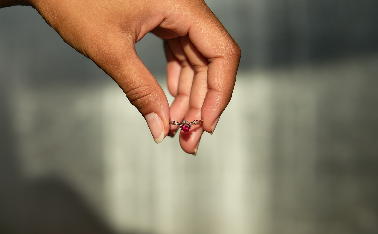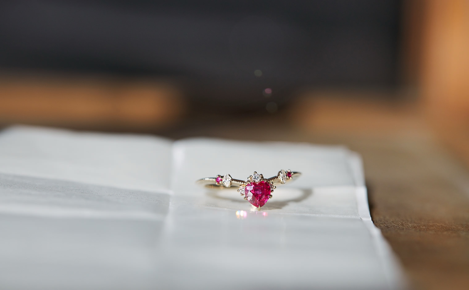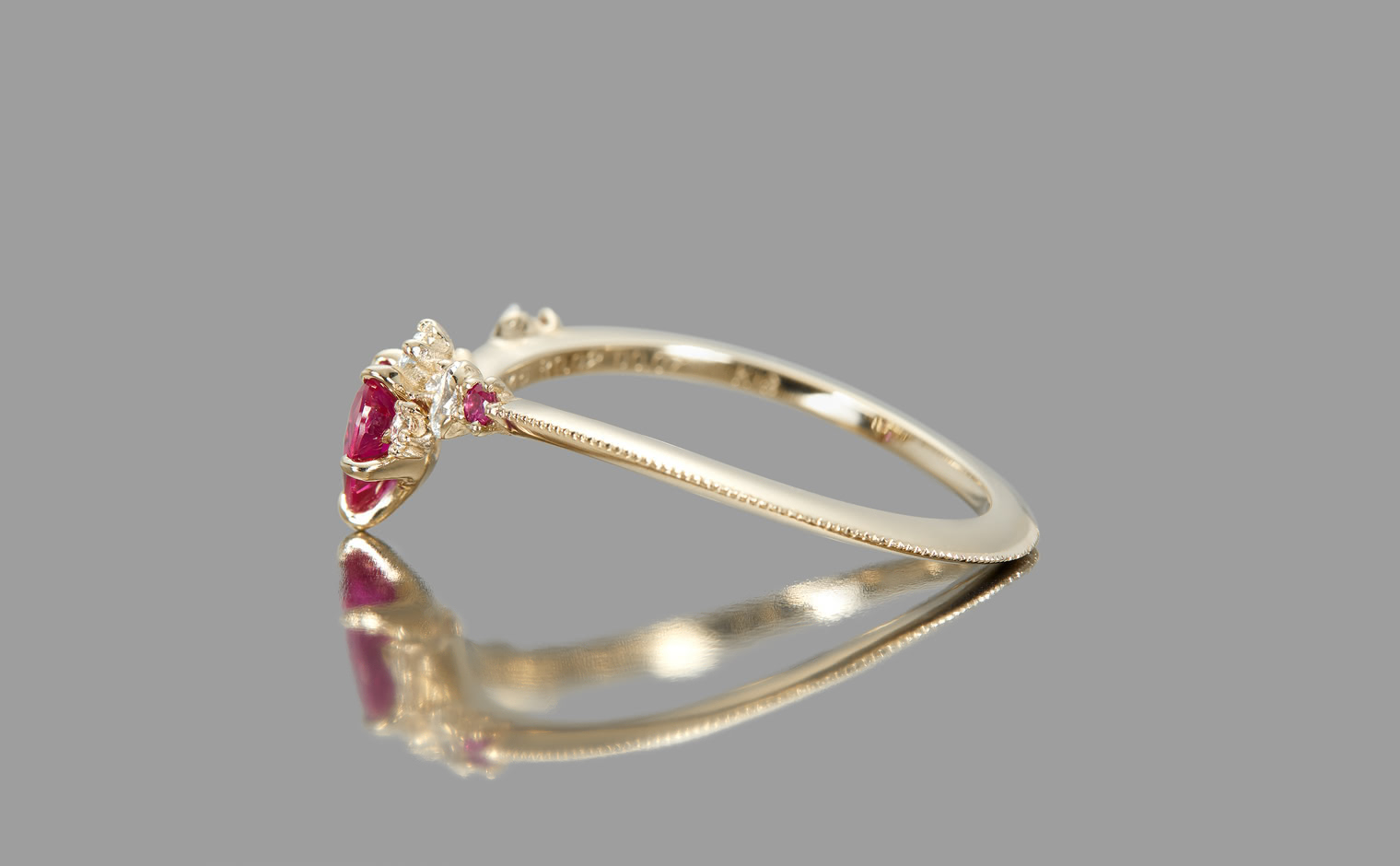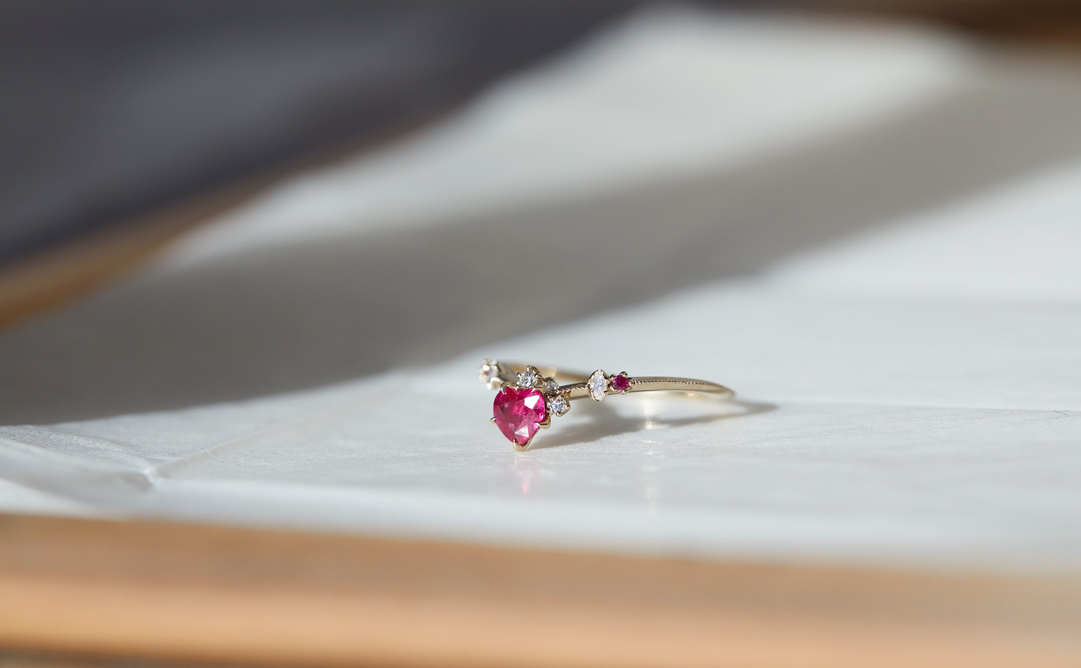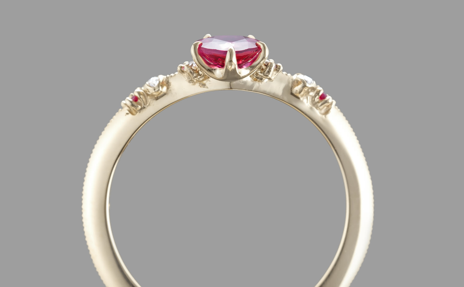 This intense, heart-shaped, vivid ruby smolders next to brilliantly sparkling white diamonds that crown the top and sweep out from the sides along an elegantly thin band which has been expertly and gracefully hand-textured to make this ring your new head-turner.