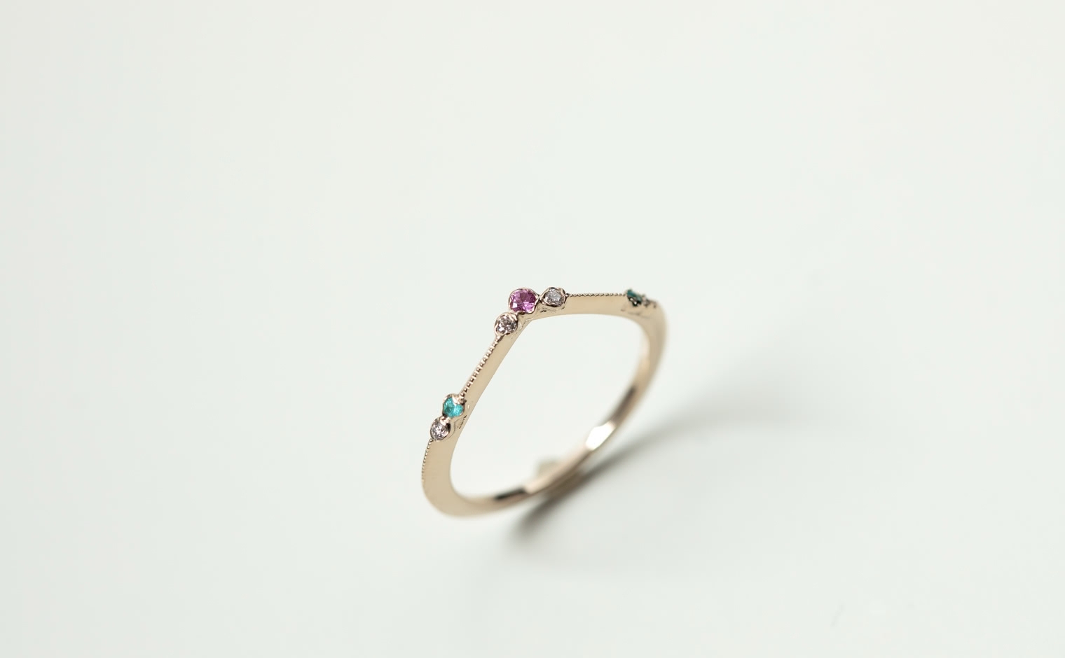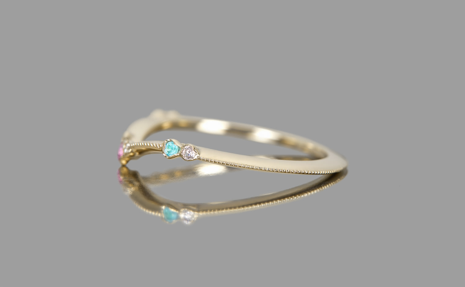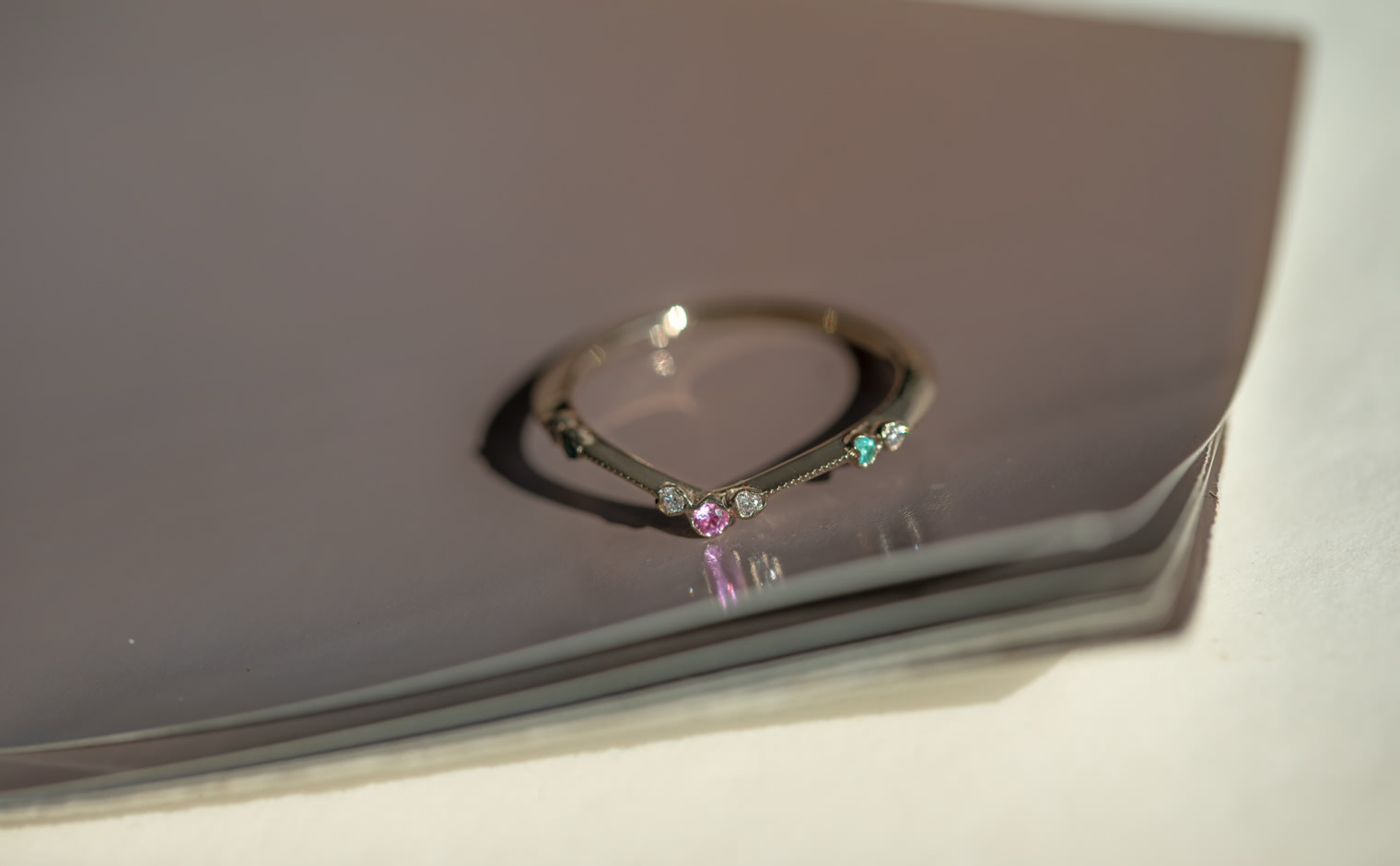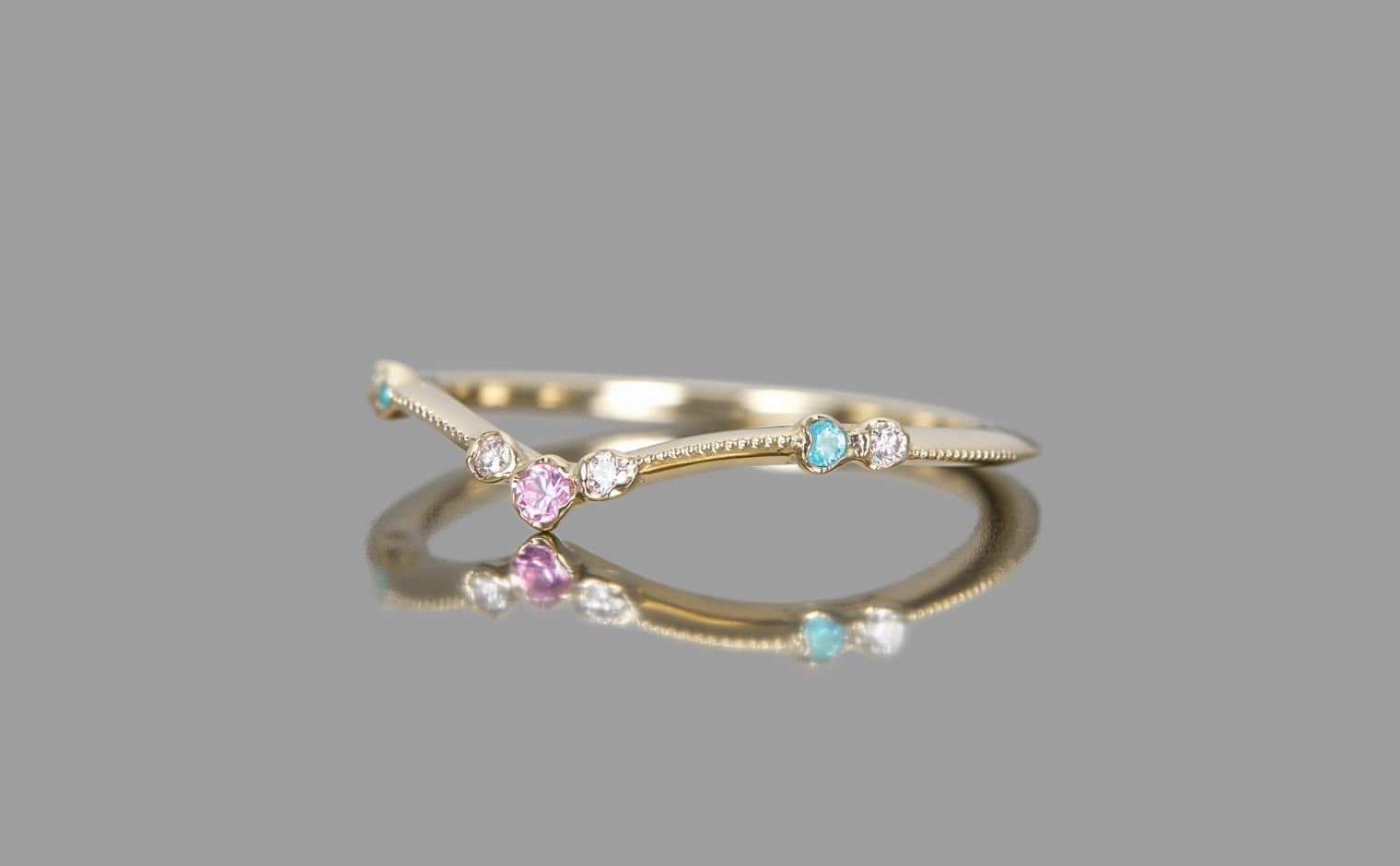 A delicate harmony of light and hue, where sapphire and Paraiba tourmalines unveil their luminous glow. The Curved Sapphire & Paraiba Ring reflects subtle sophistication, a whispered expression of grace and enduring charm.
