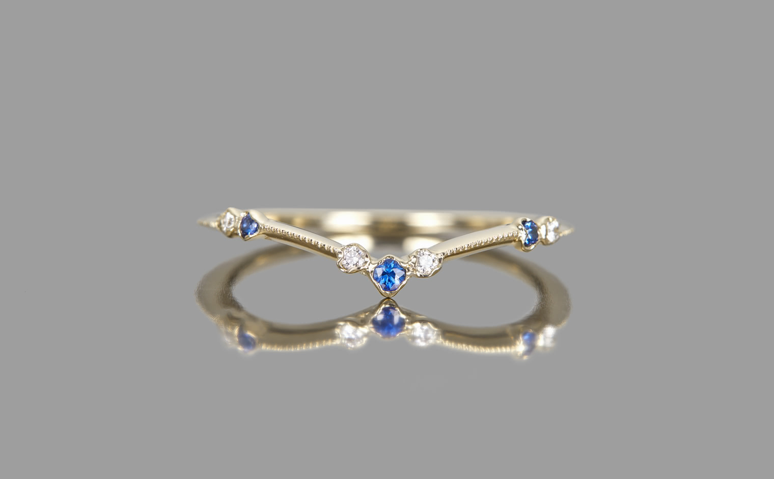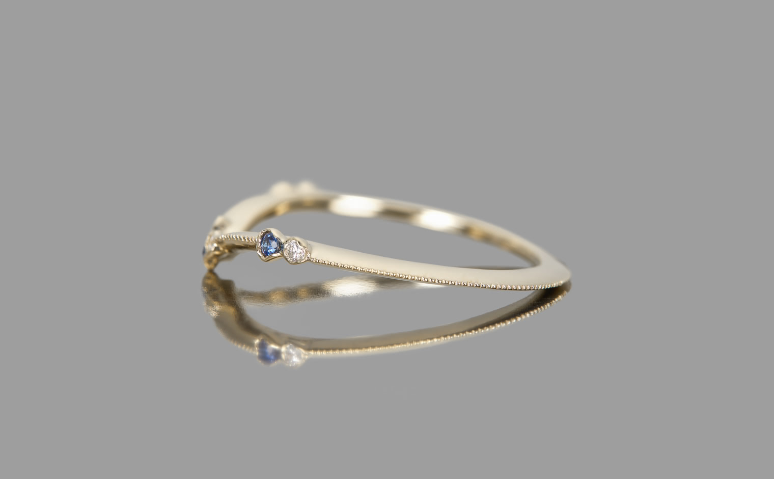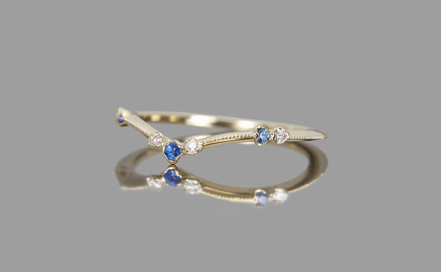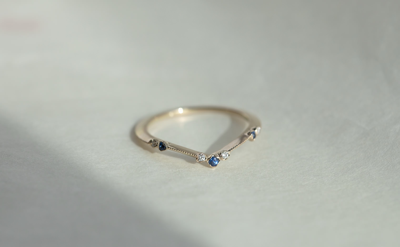 A flowing shimmer of hue, where sapphires and diamonds unveil soft radiance. The Curved Sapphire Ring reflects refined elegance, a delicate balance of tradition and modern grace.