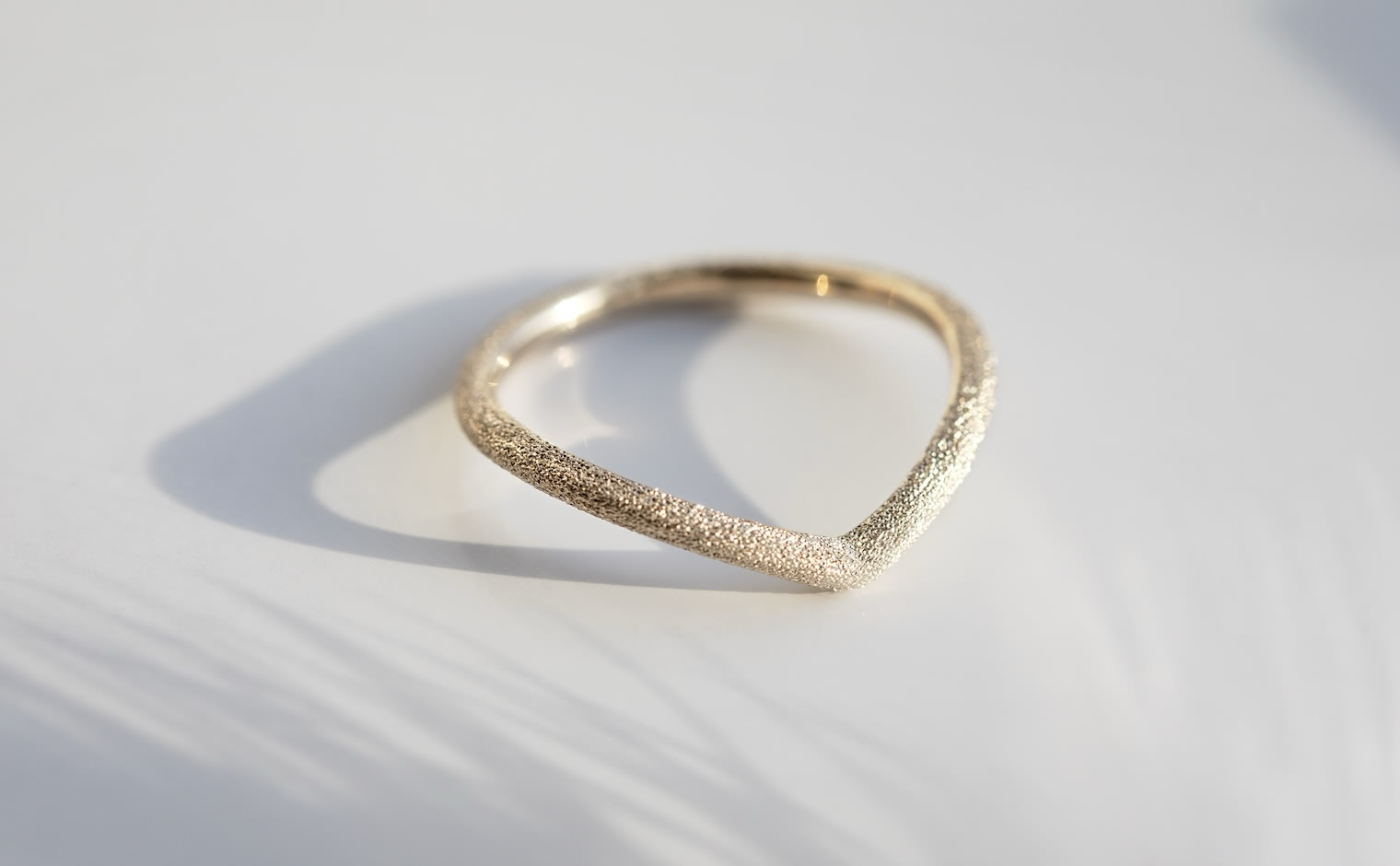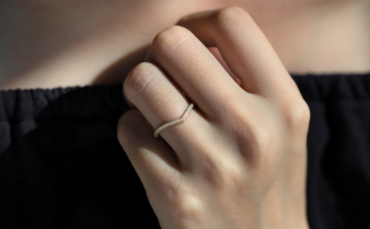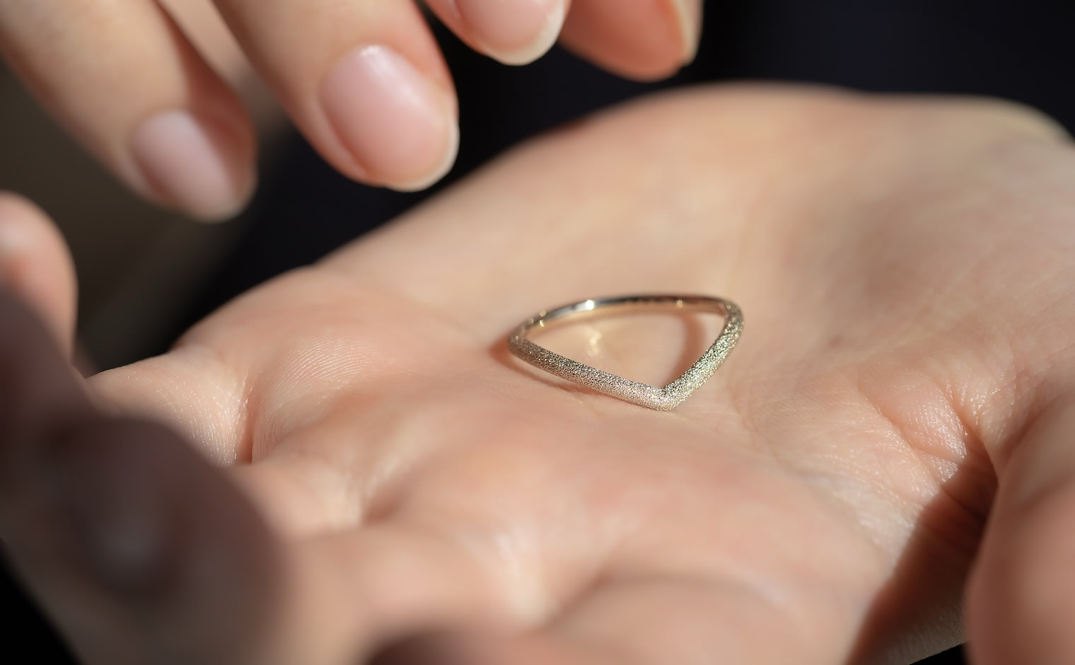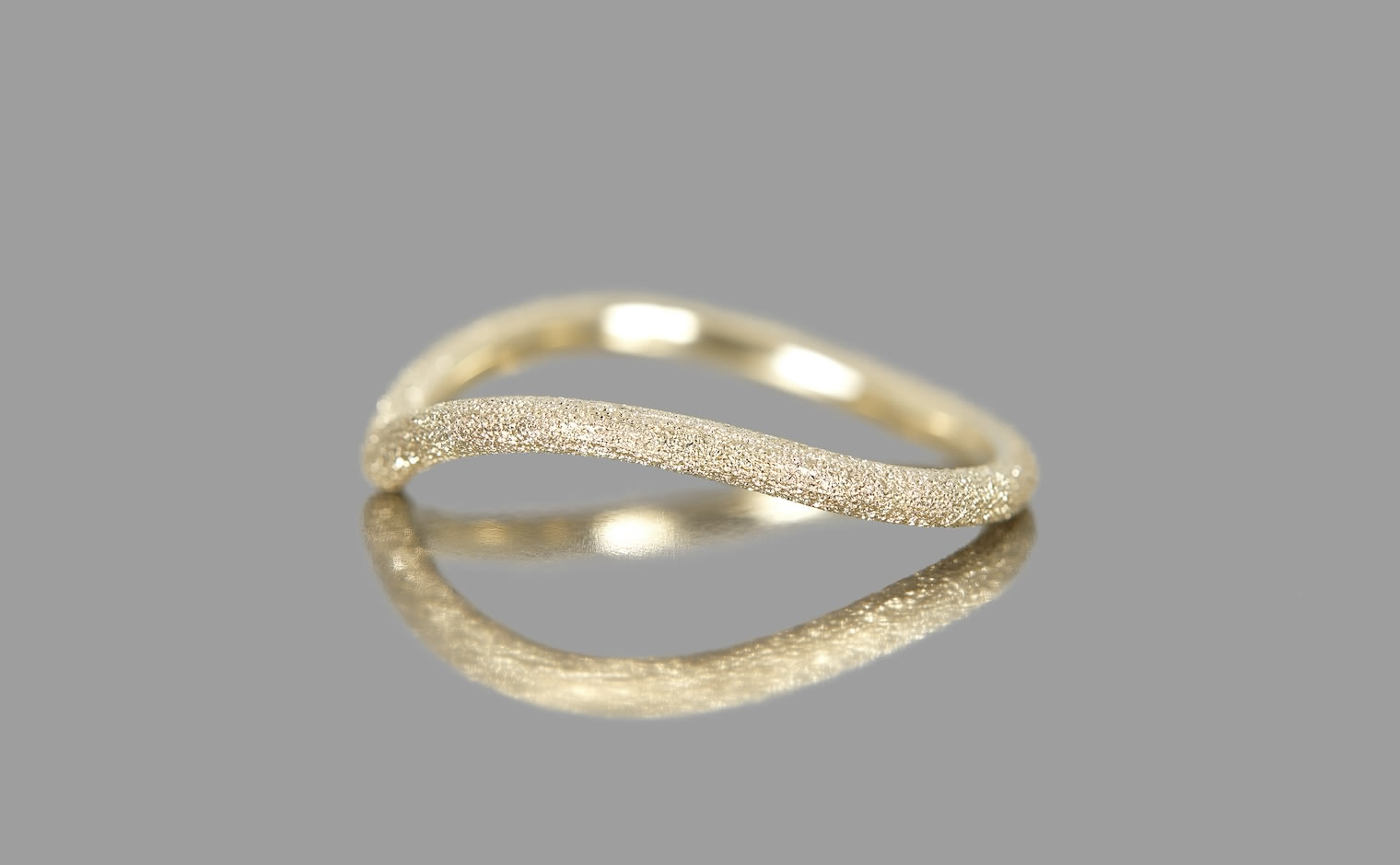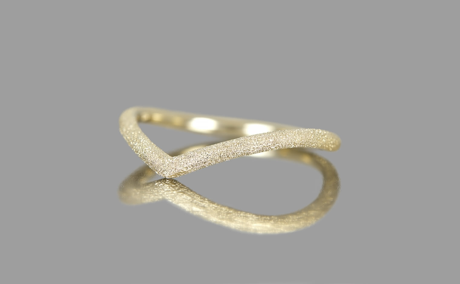 A celestial shimmer, where light dances in delicate motion. The Curved Stardust Ring reflects luminous grace, a whispered trace of infinite beauty.