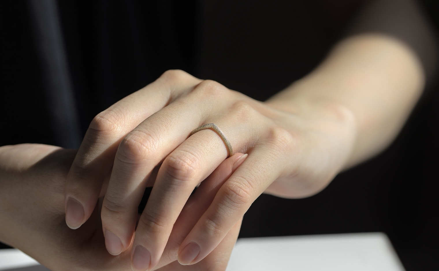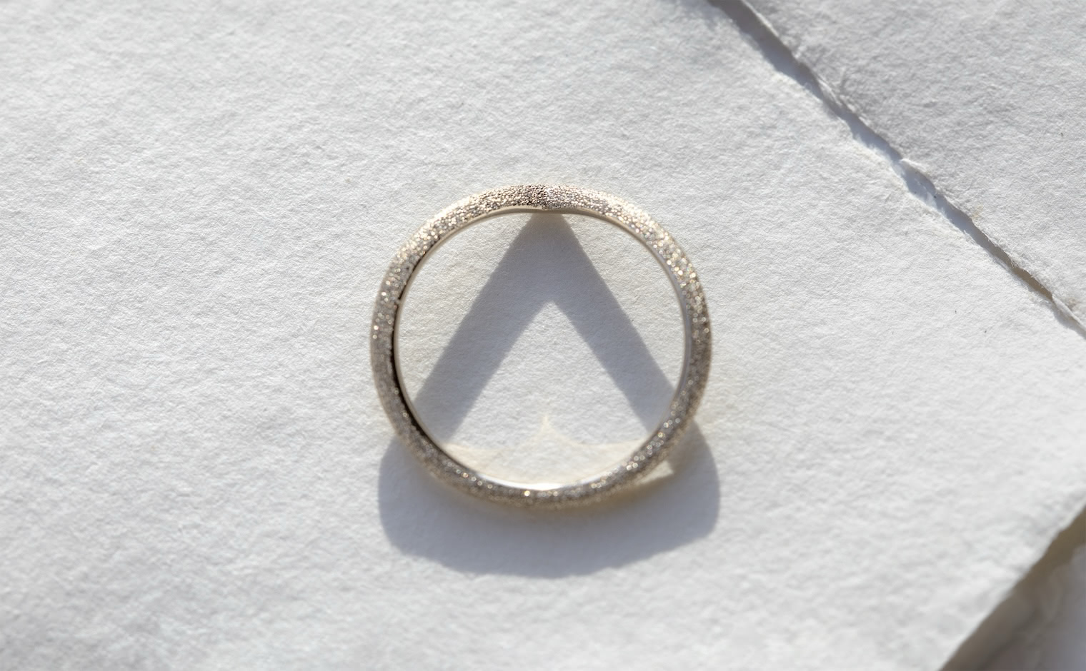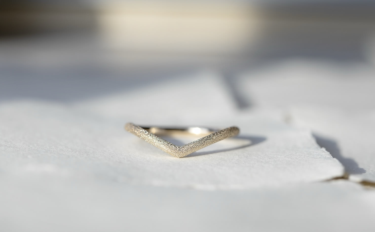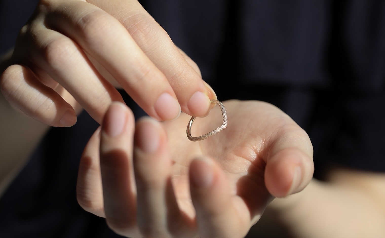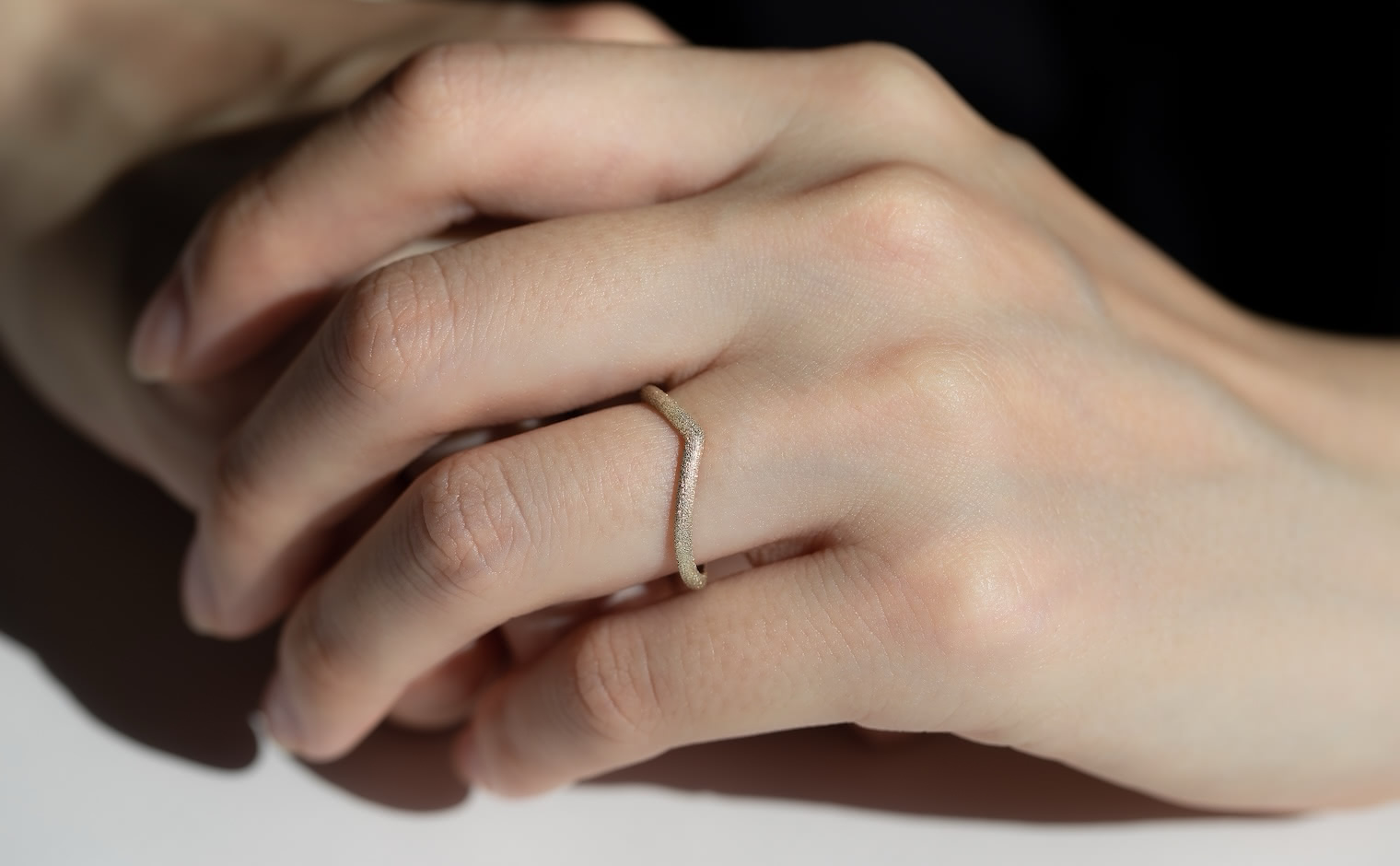 A celestial shimmer, where light dances in delicate motion. The Curved Stardust Ring reflects luminous grace, a whispered trace of infinite beauty.