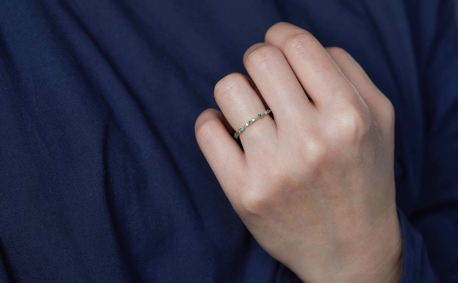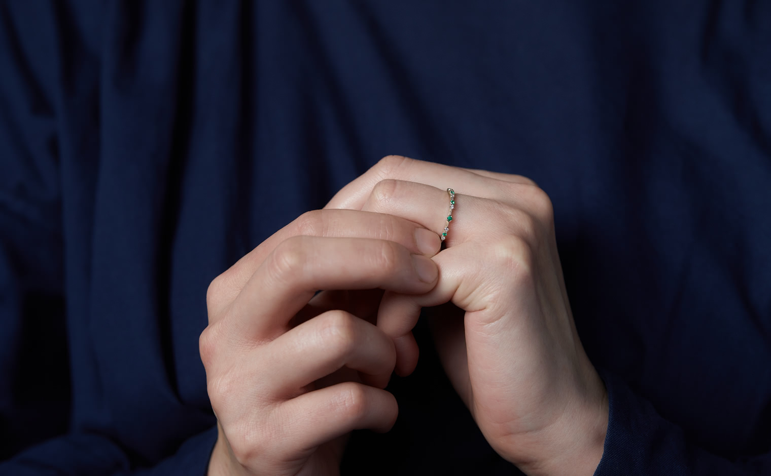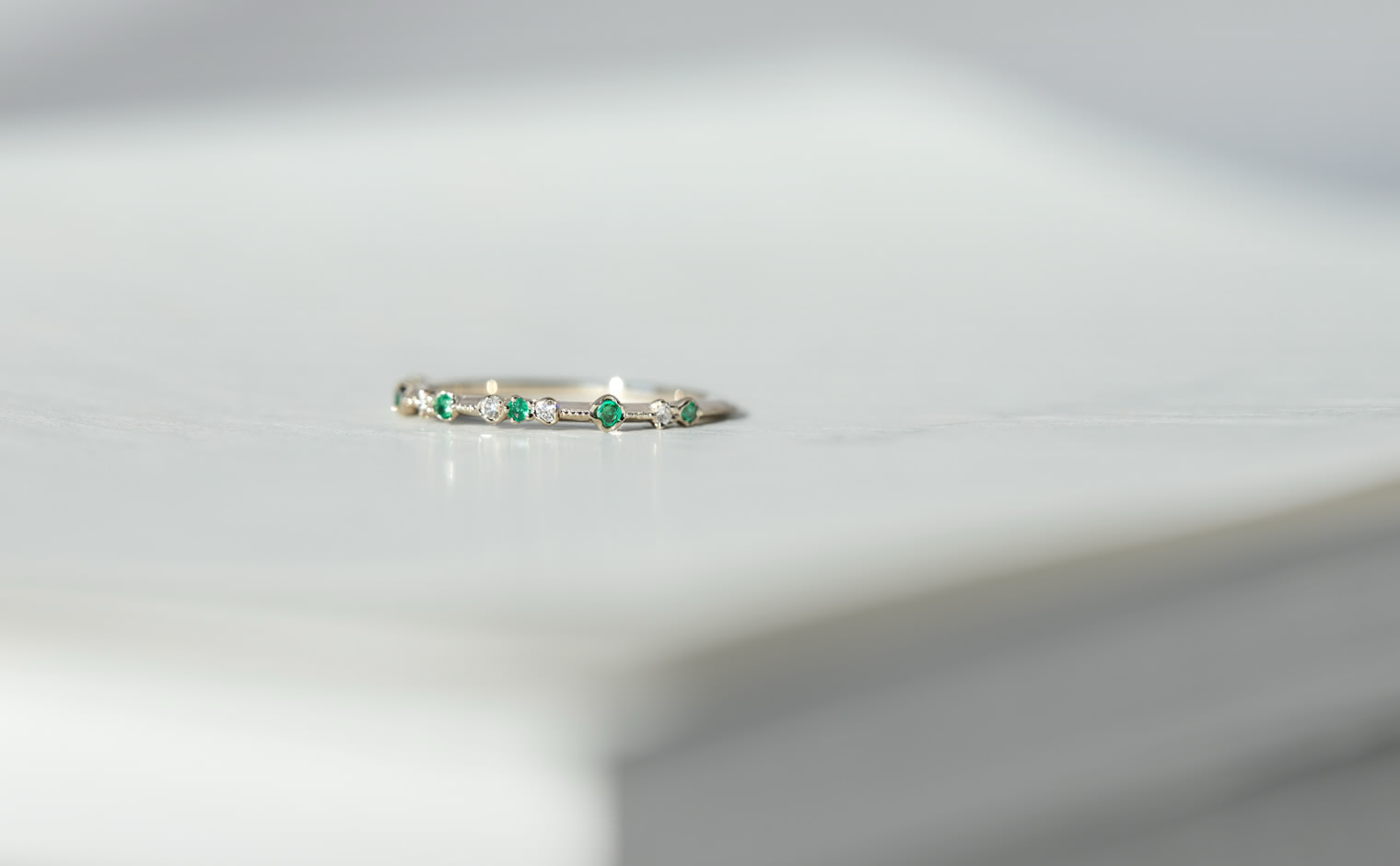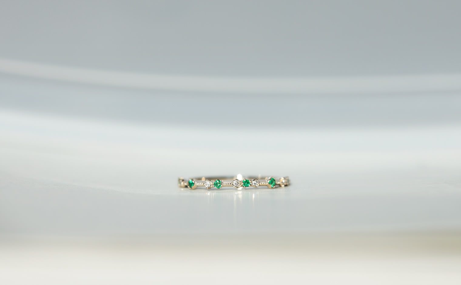A glistening cadence, where diamonds and emeralds shimmer with vibrant radiance. The Dotted Ring–Diamond & Emerald exudes effortless elegance, a delicate expression of renewal—refined, luminous, and enduring.