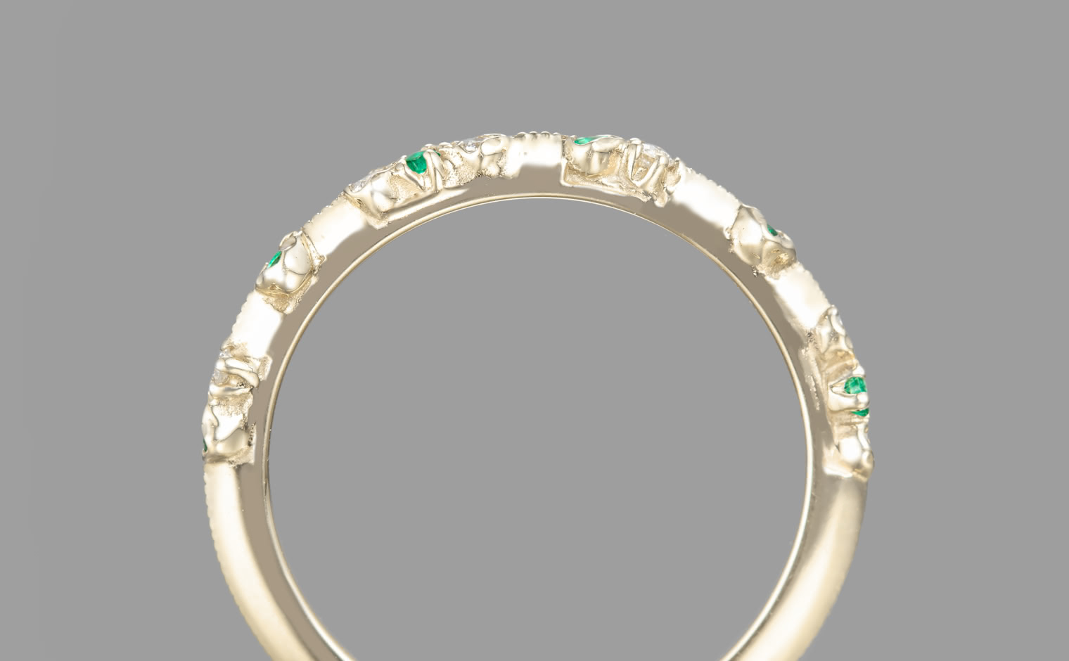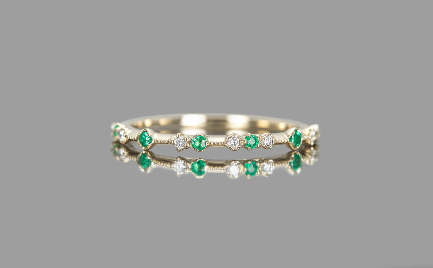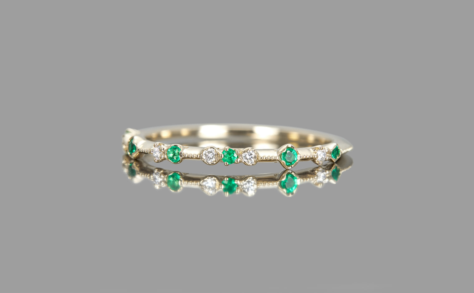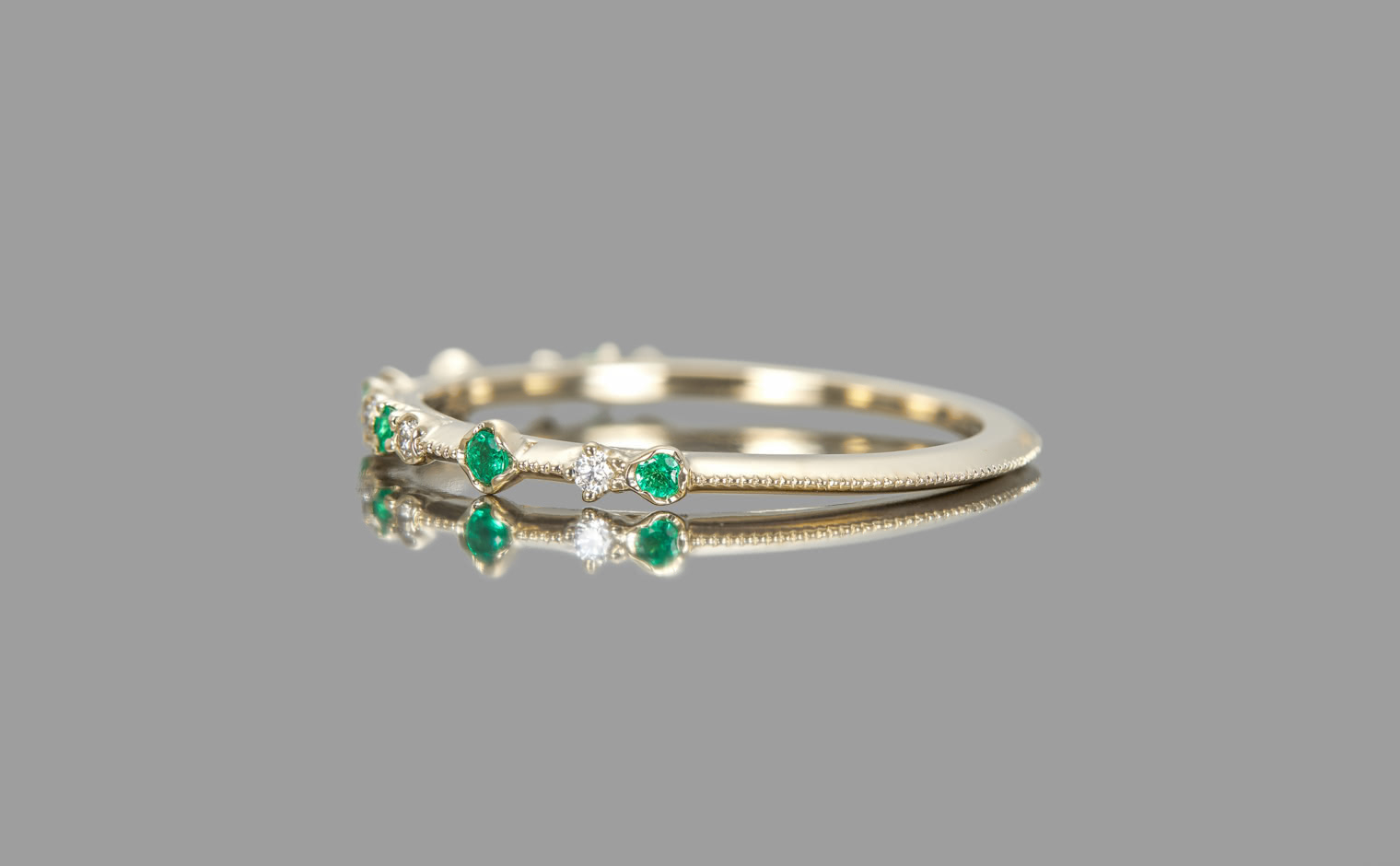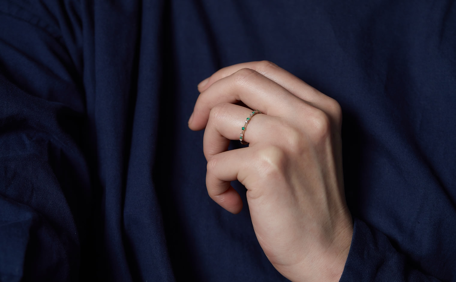 A glistening cadence, where diamonds and emeralds shimmer with vibrant radiance. The Dotted Ring–Diamond & Emerald exudes effortless elegance, a delicate expression of renewal—refined, luminous, and enduring.
