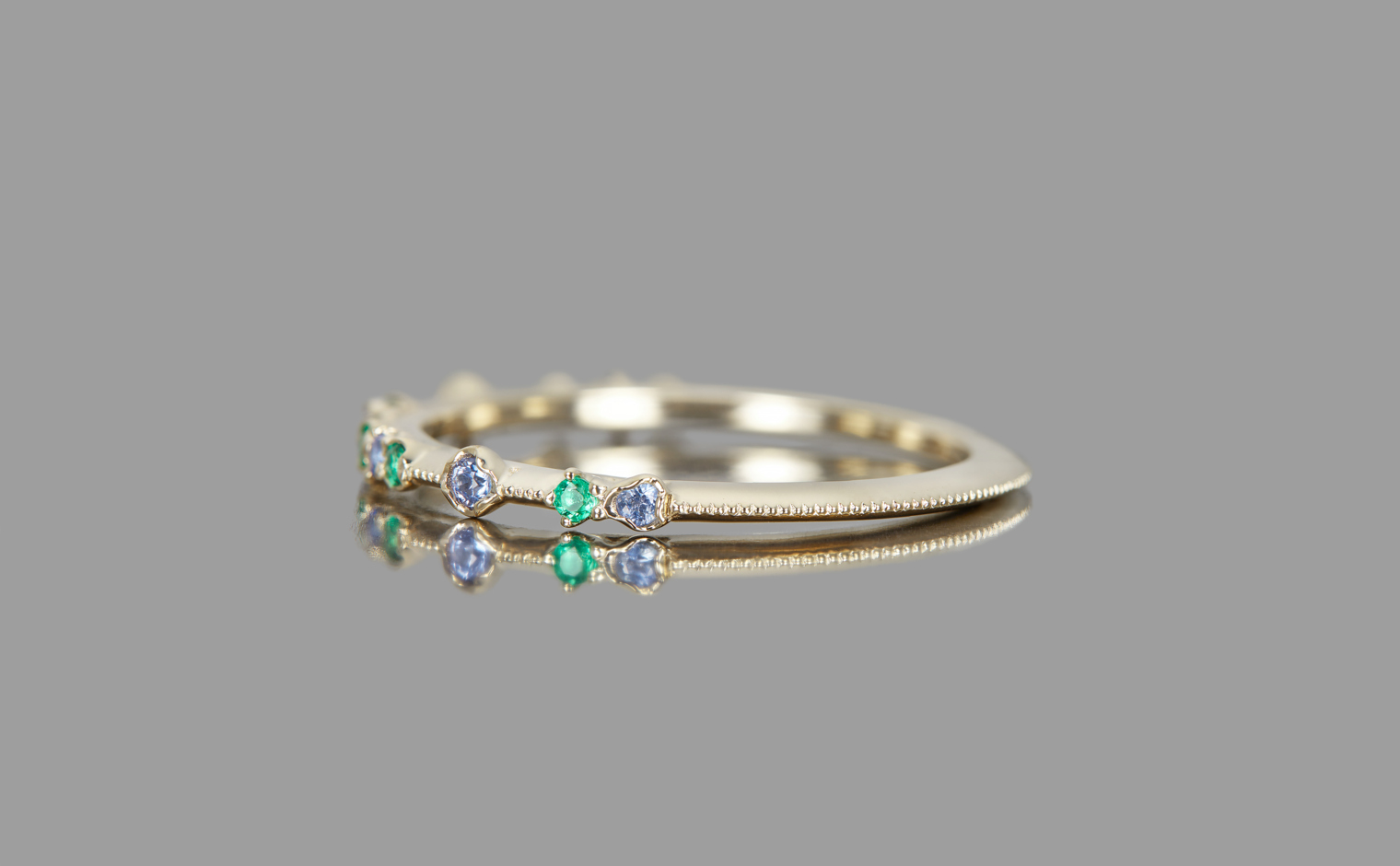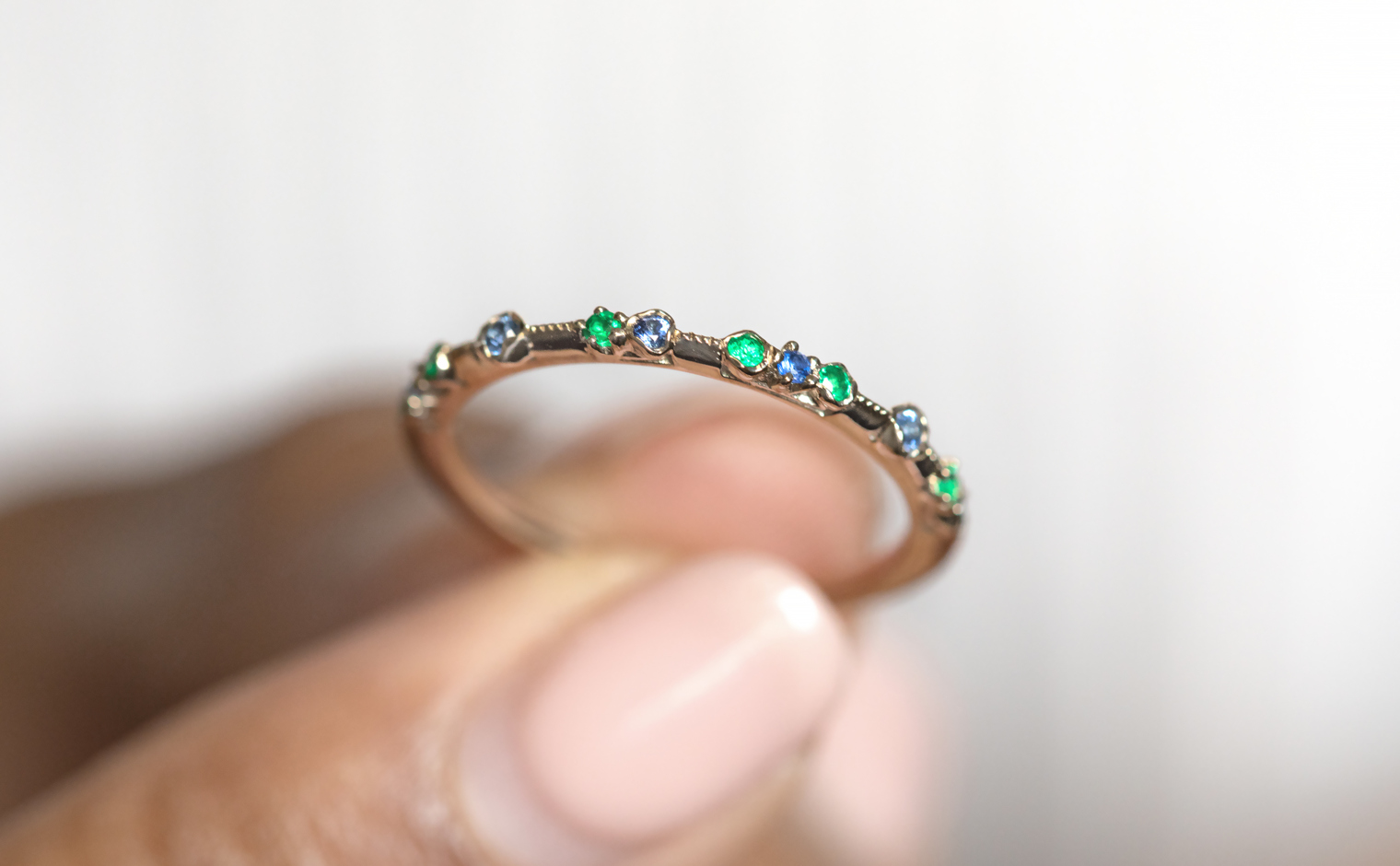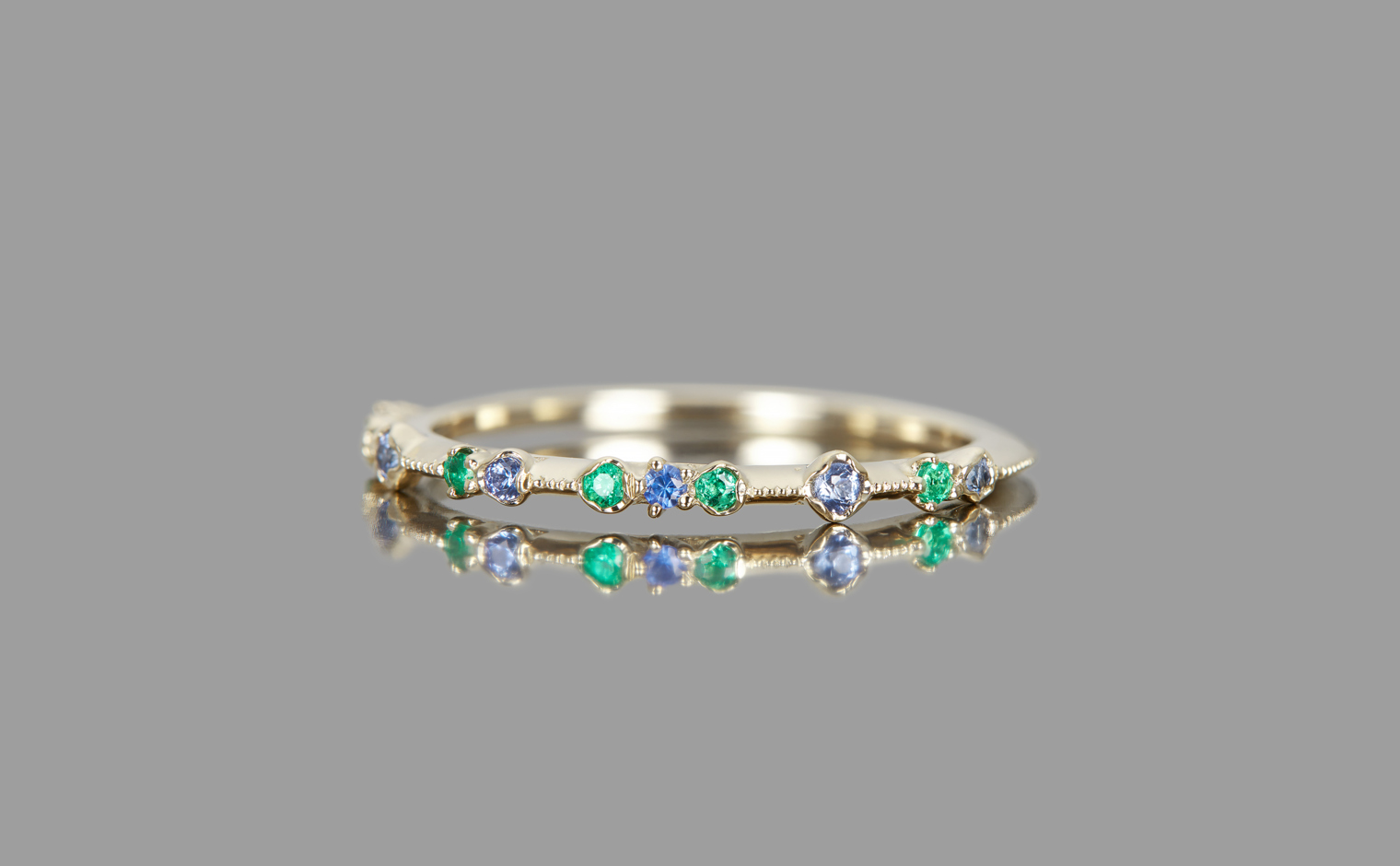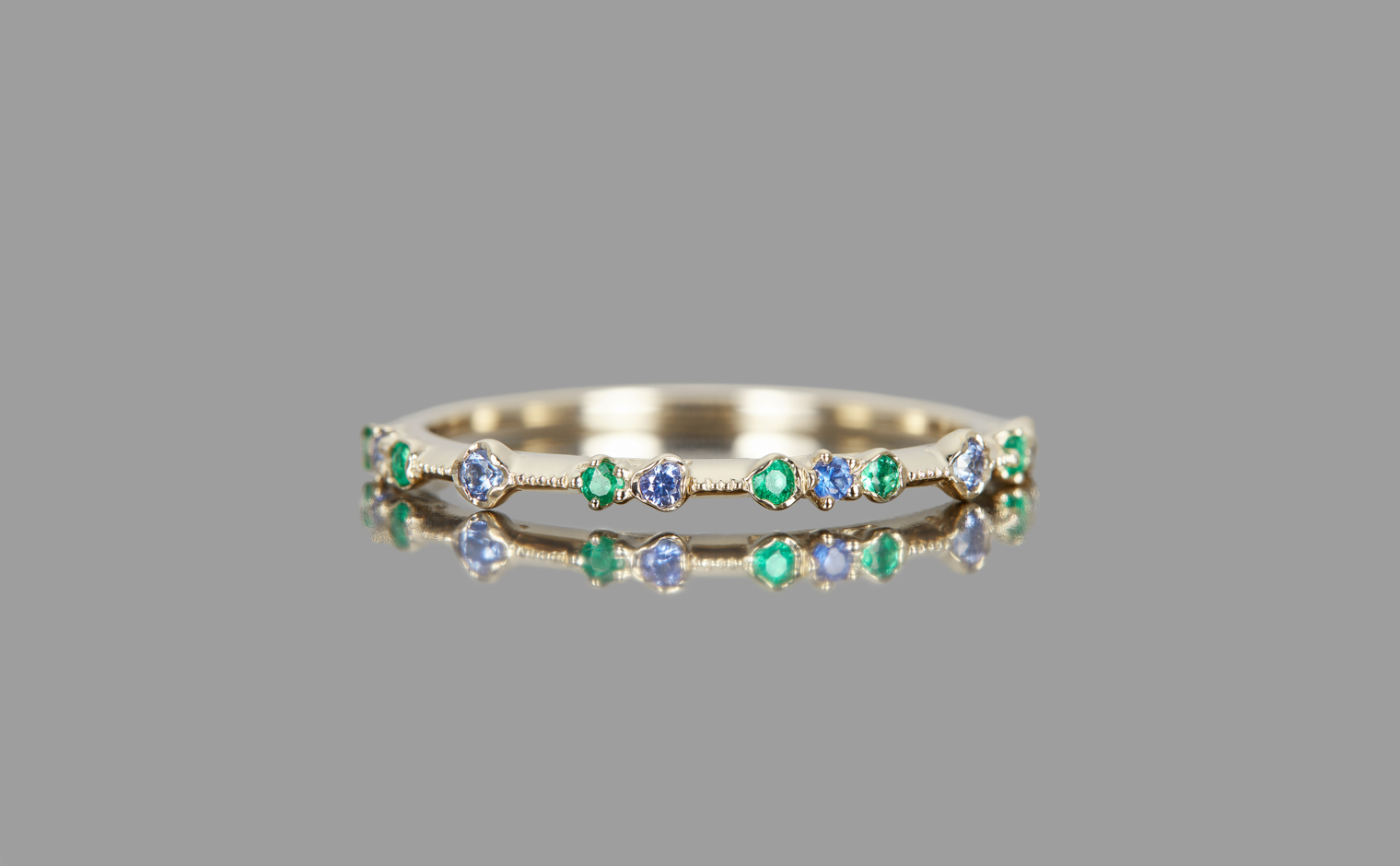 A soft radiance unfolds in quiet harmony. The Dotted Ring–Sapphire & Emerald embodies playful sophistication, a lasting expression of timeless beauty.