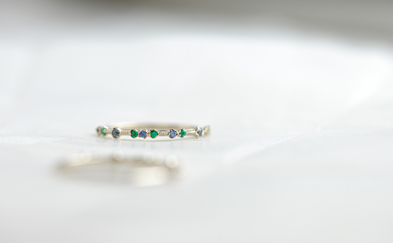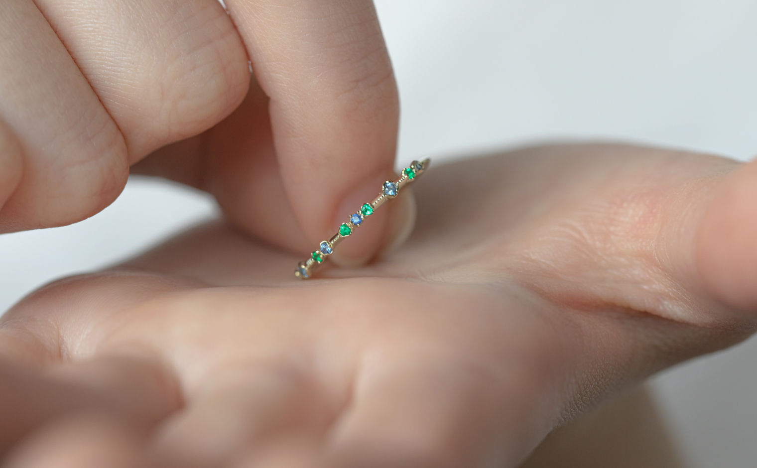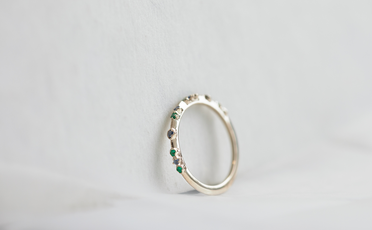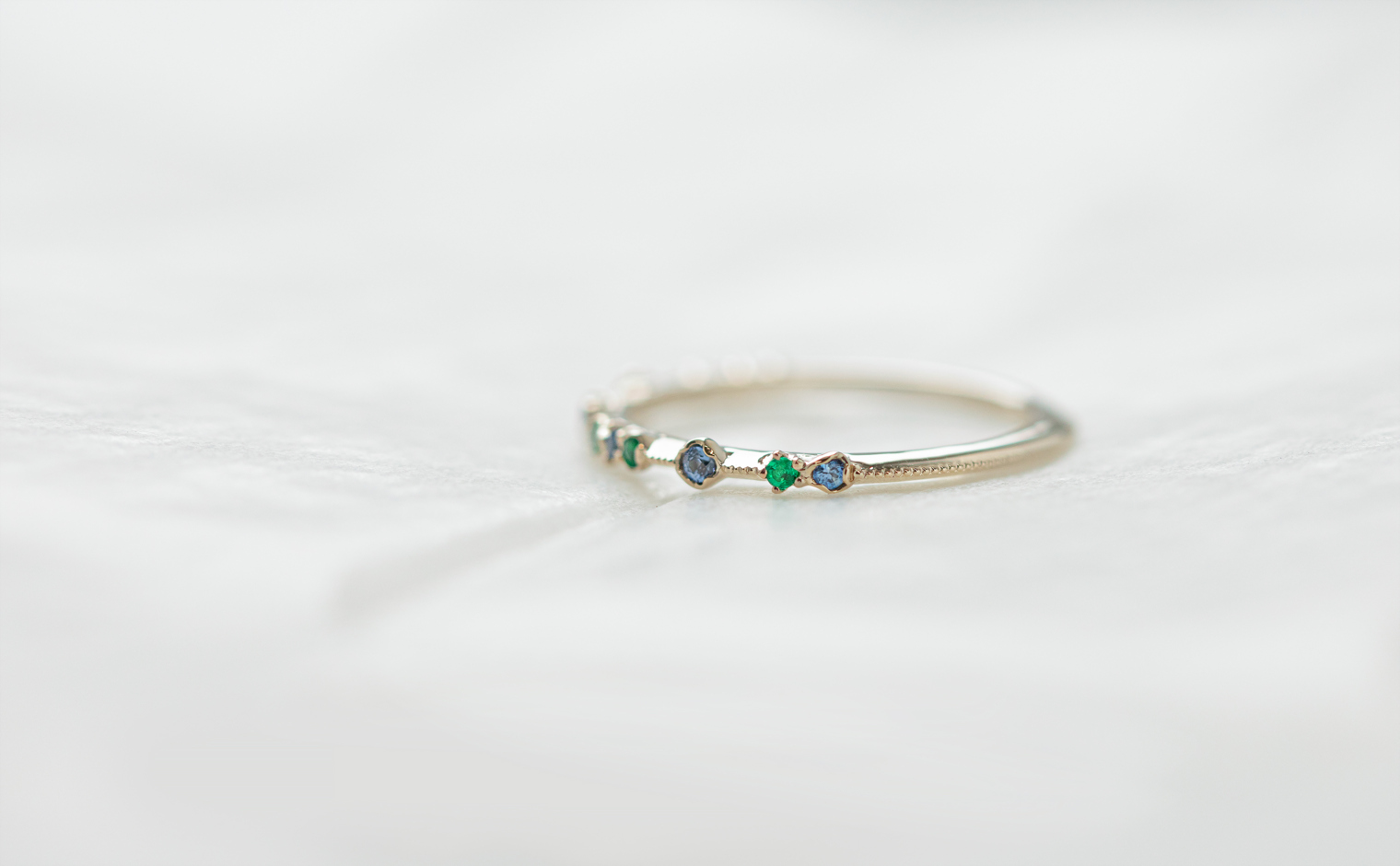 A soft radiance unfolds in quiet harmony. The Dotted Ring–Sapphire & Emerald embodies playful sophistication, a lasting expression of timeless beauty.