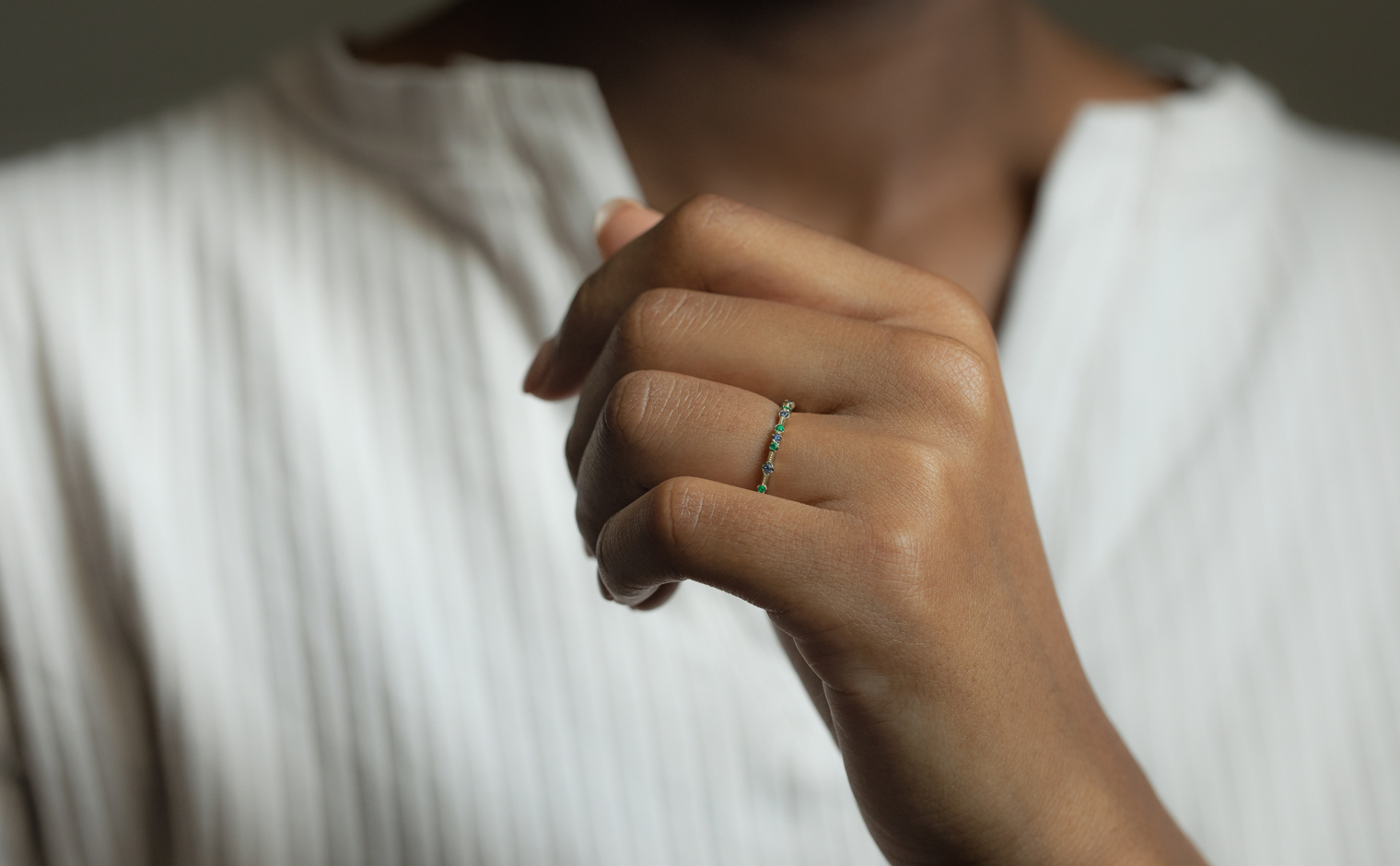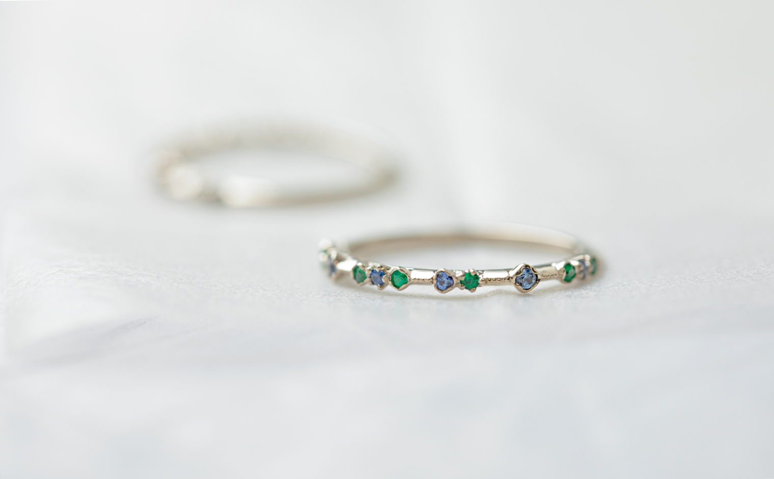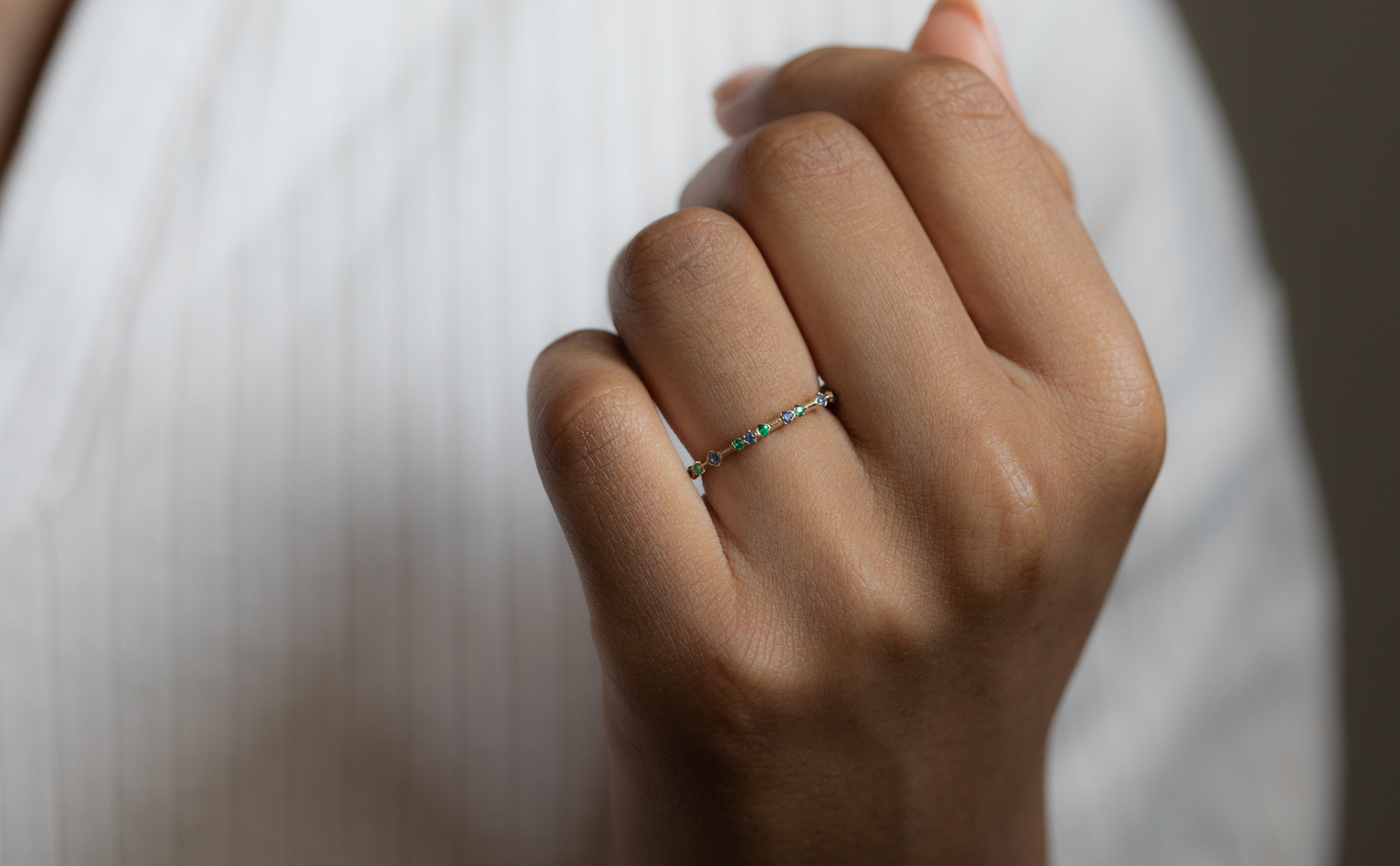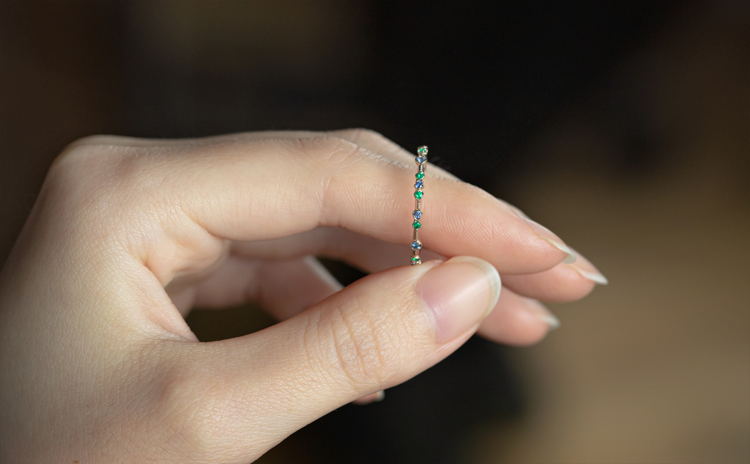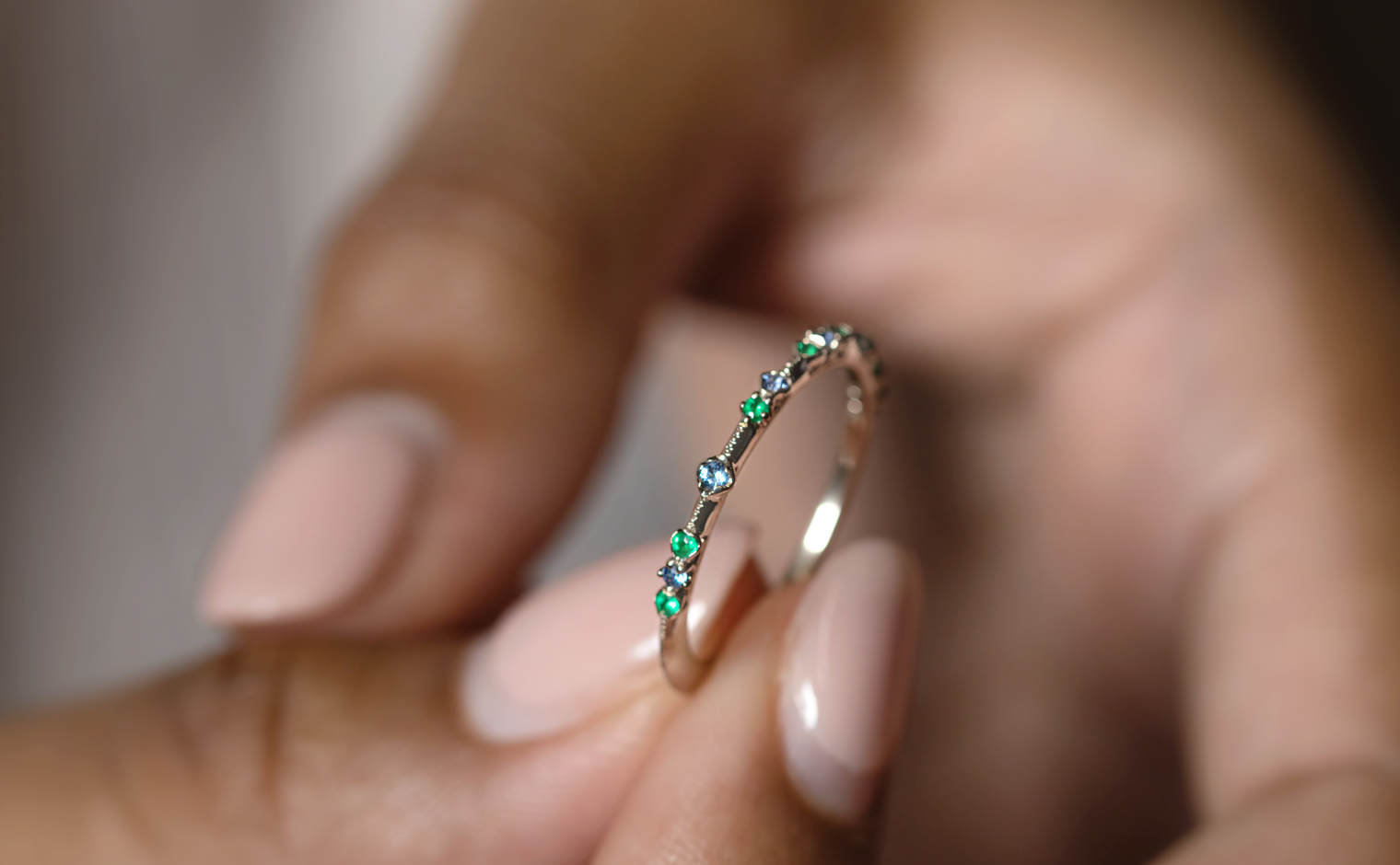 A soft radiance unfolds in quiet harmony. The Dotted Ring–Sapphire & Emerald embodies playful sophistication, a lasting expression of timeless beauty.
