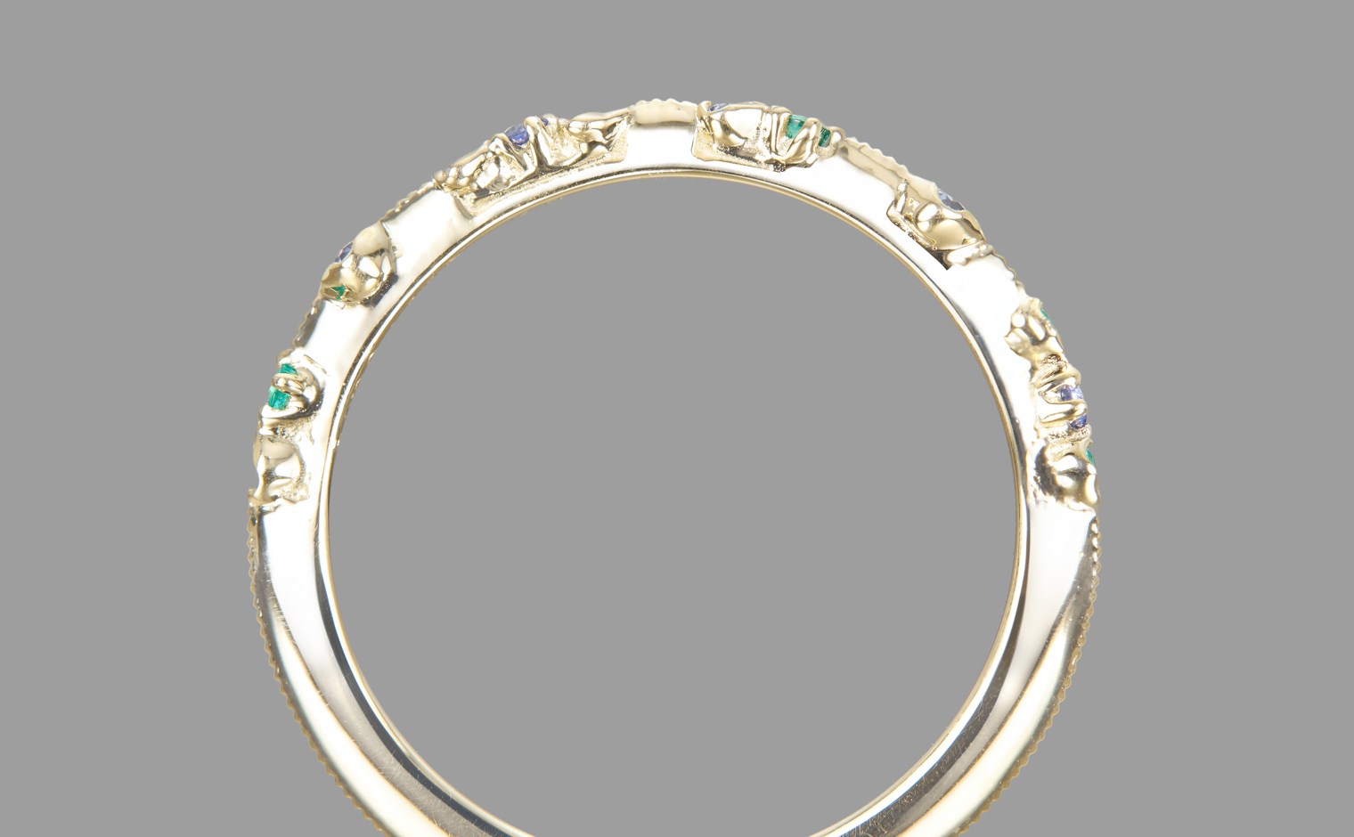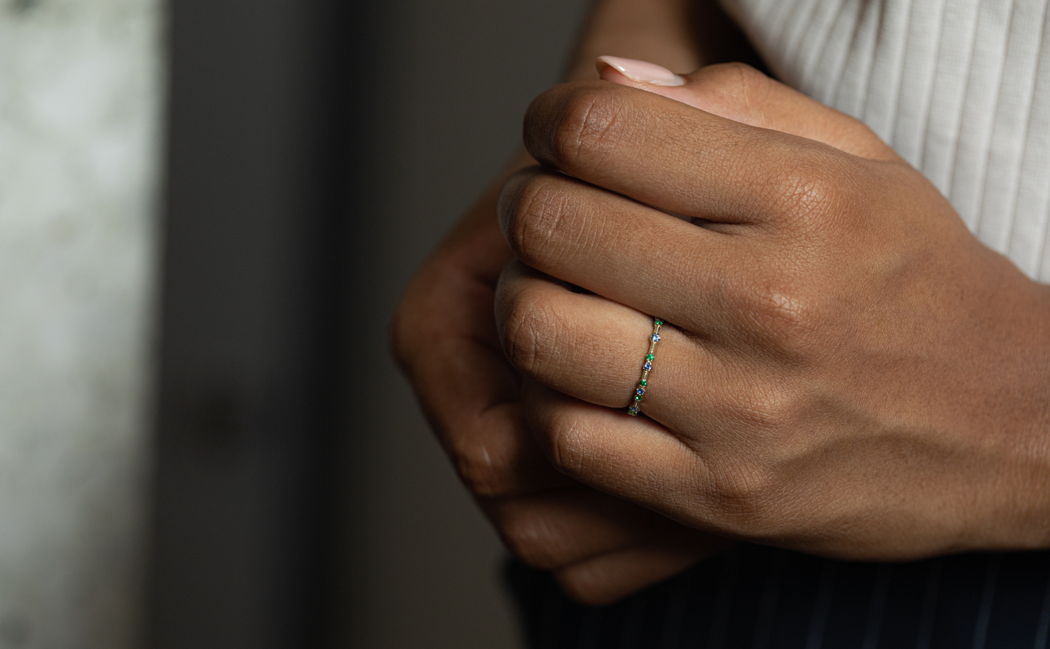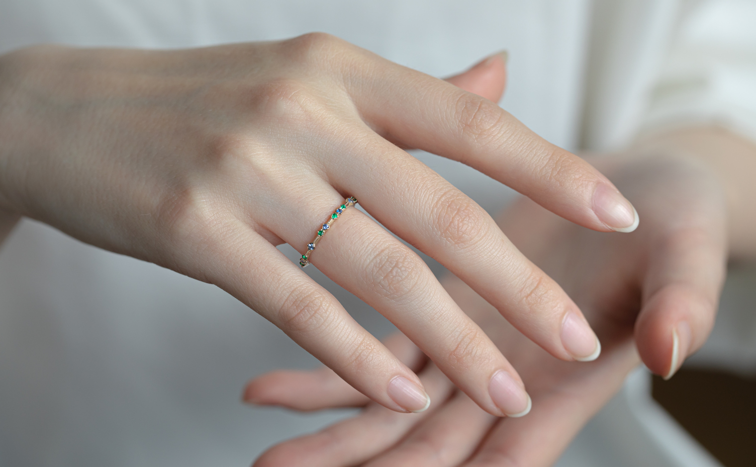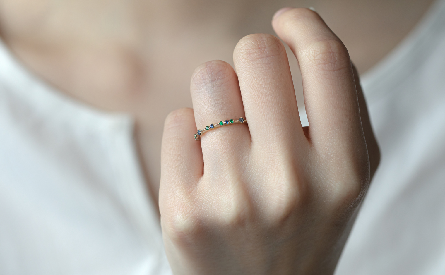 A soft radiance unfolds in quiet harmony. The Dotted Ring–Sapphire & Emerald embodies playful sophistication, a lasting expression of timeless beauty.