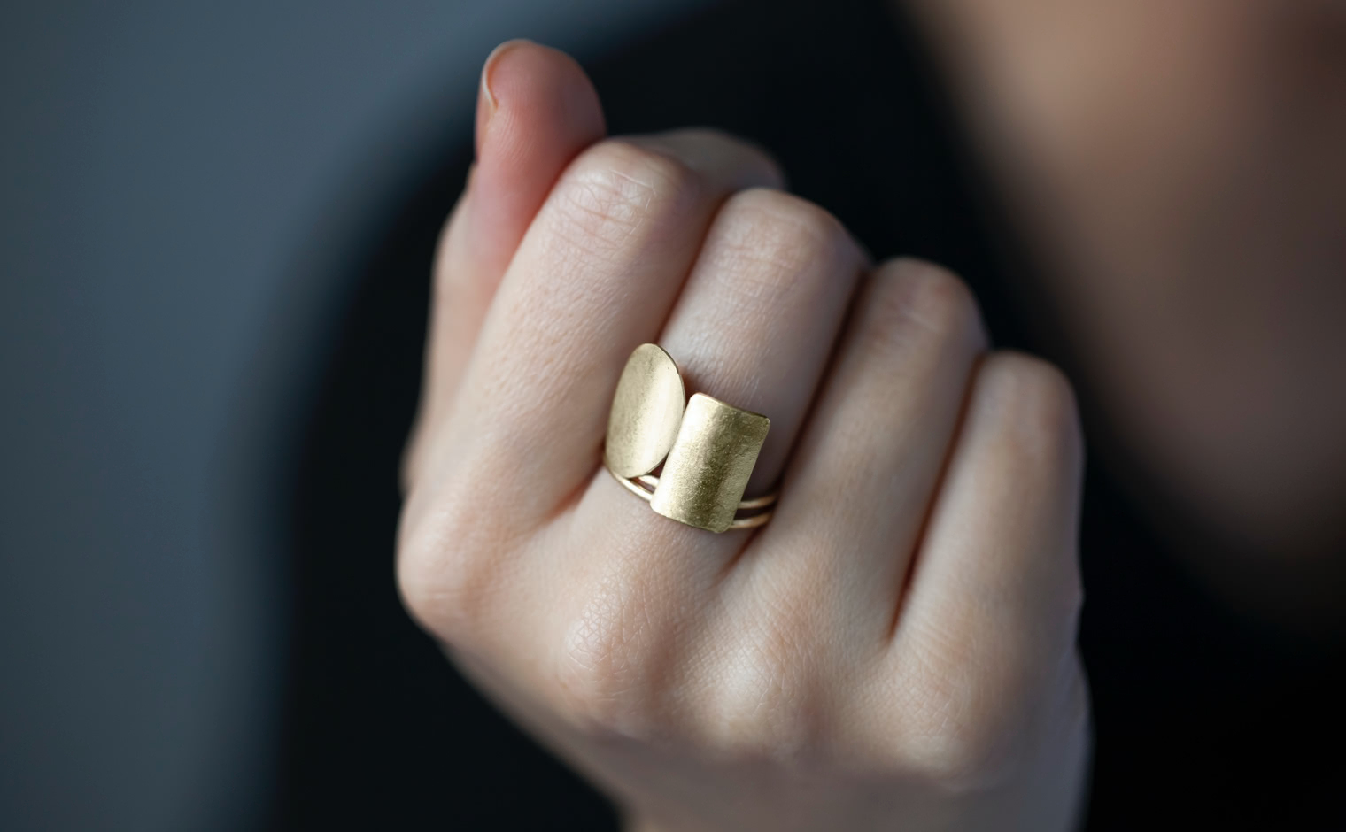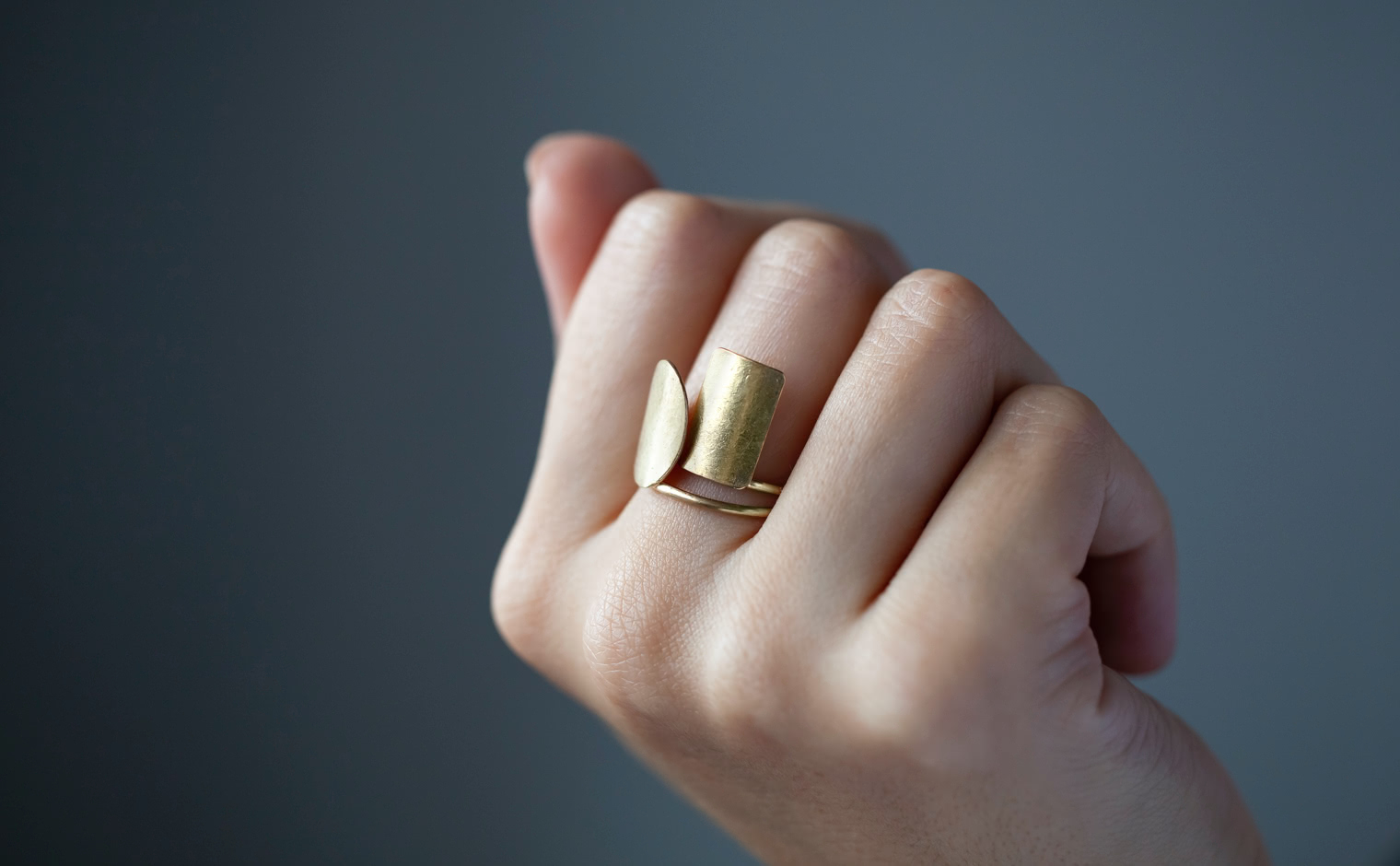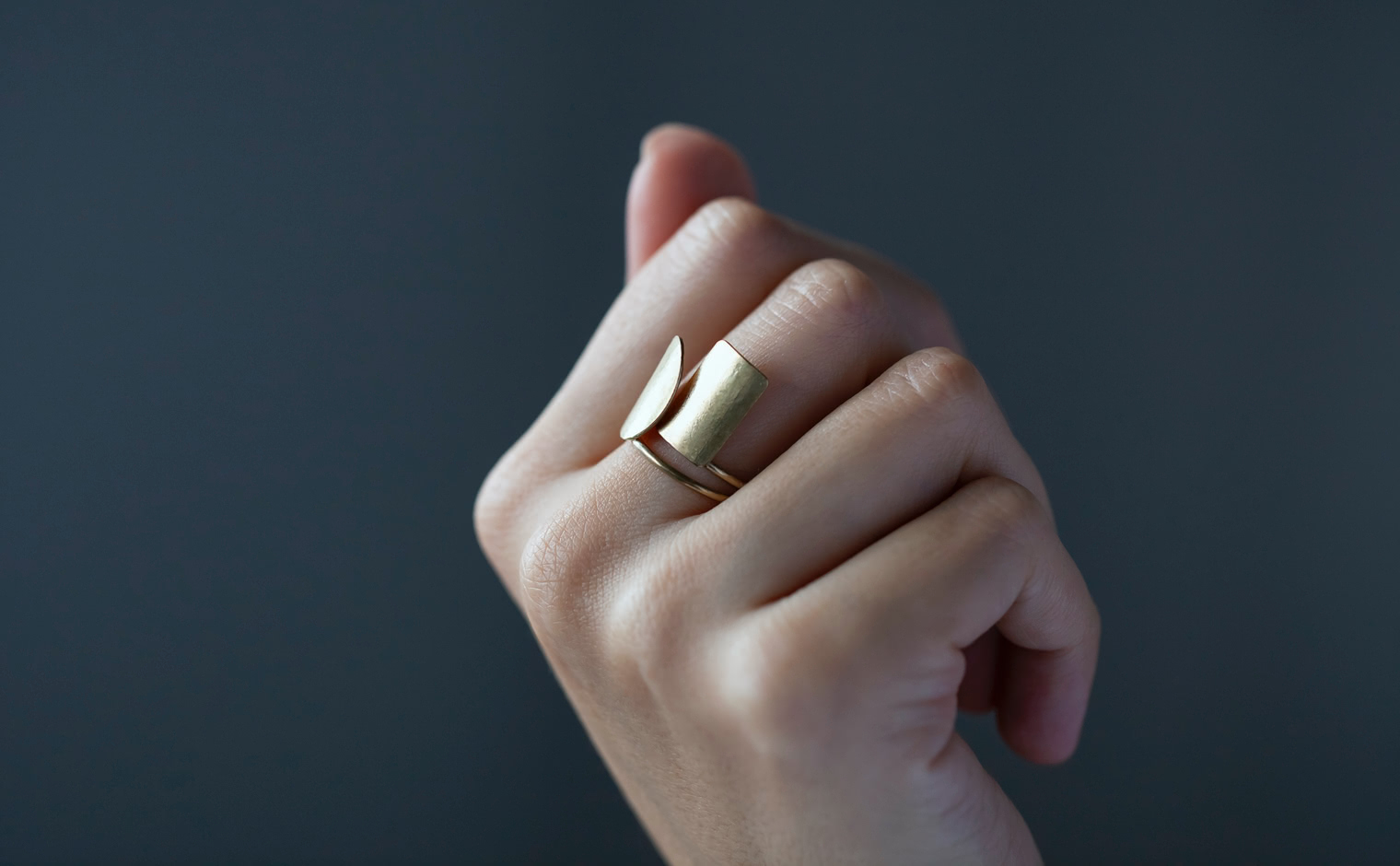 Moody, sable gold is shaped into two complimenting profiles perched atop thin bands of custom-blended metal. Worn together or one at a time, these rings were designed for a charismatic, elegant approach to your everyday look.