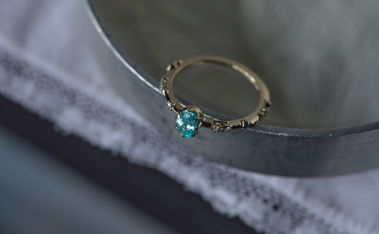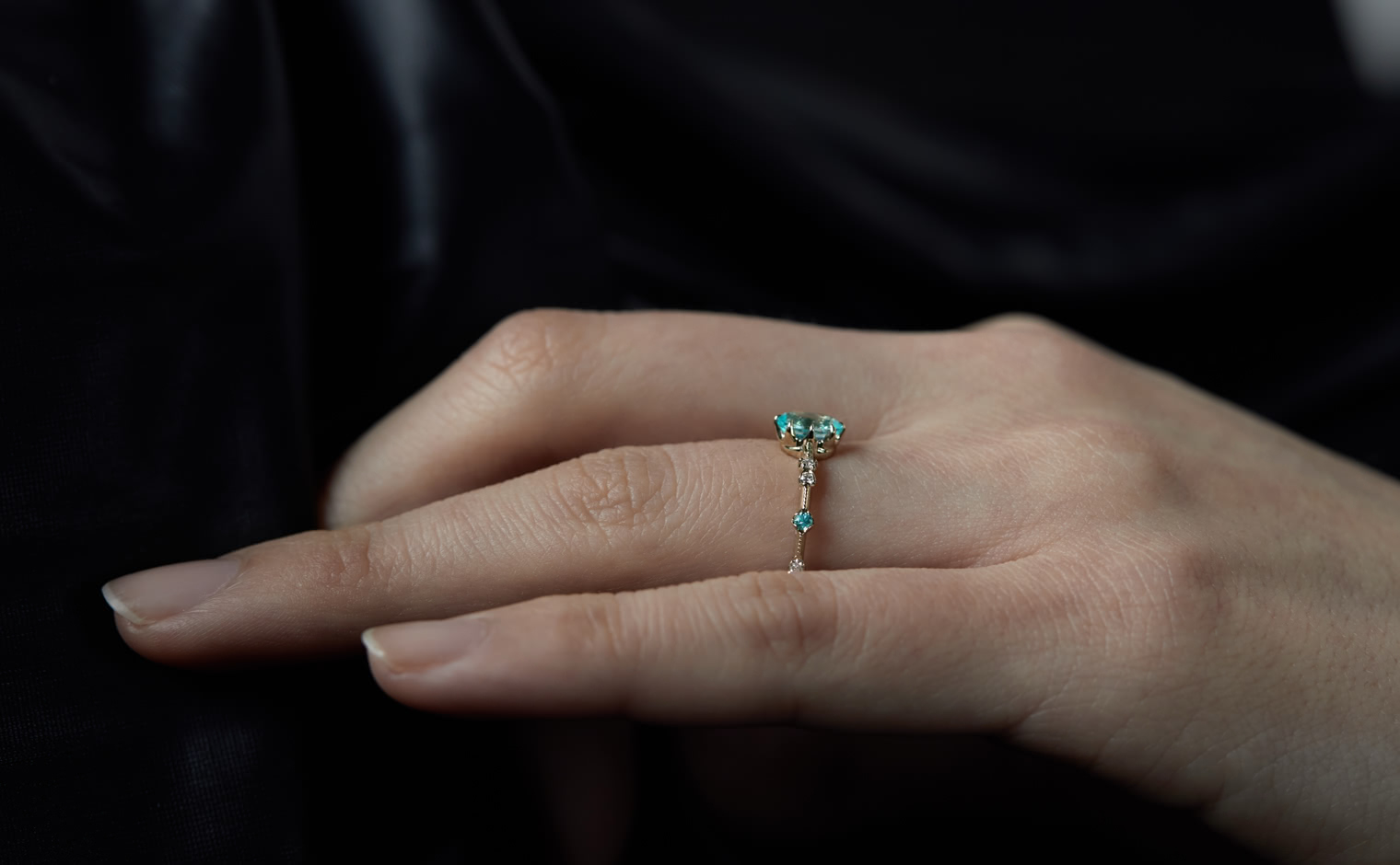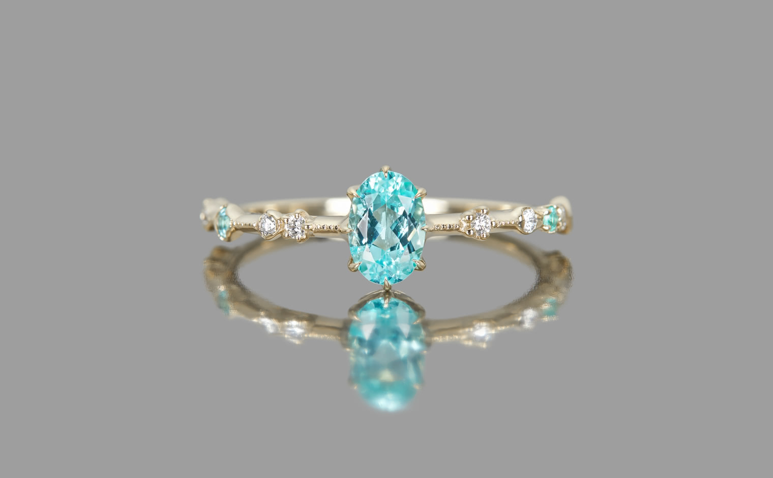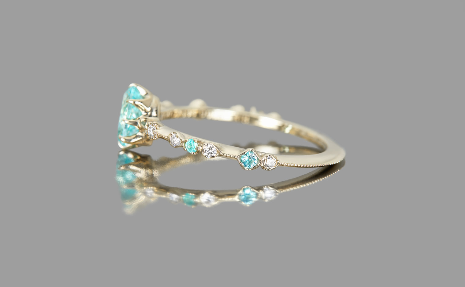 Diamonds and smaller vivacious Paraiba tourmalines are hand picked for your ring, set to dance along the band that has been decorated masterfully with hand-applied milgrain edges.