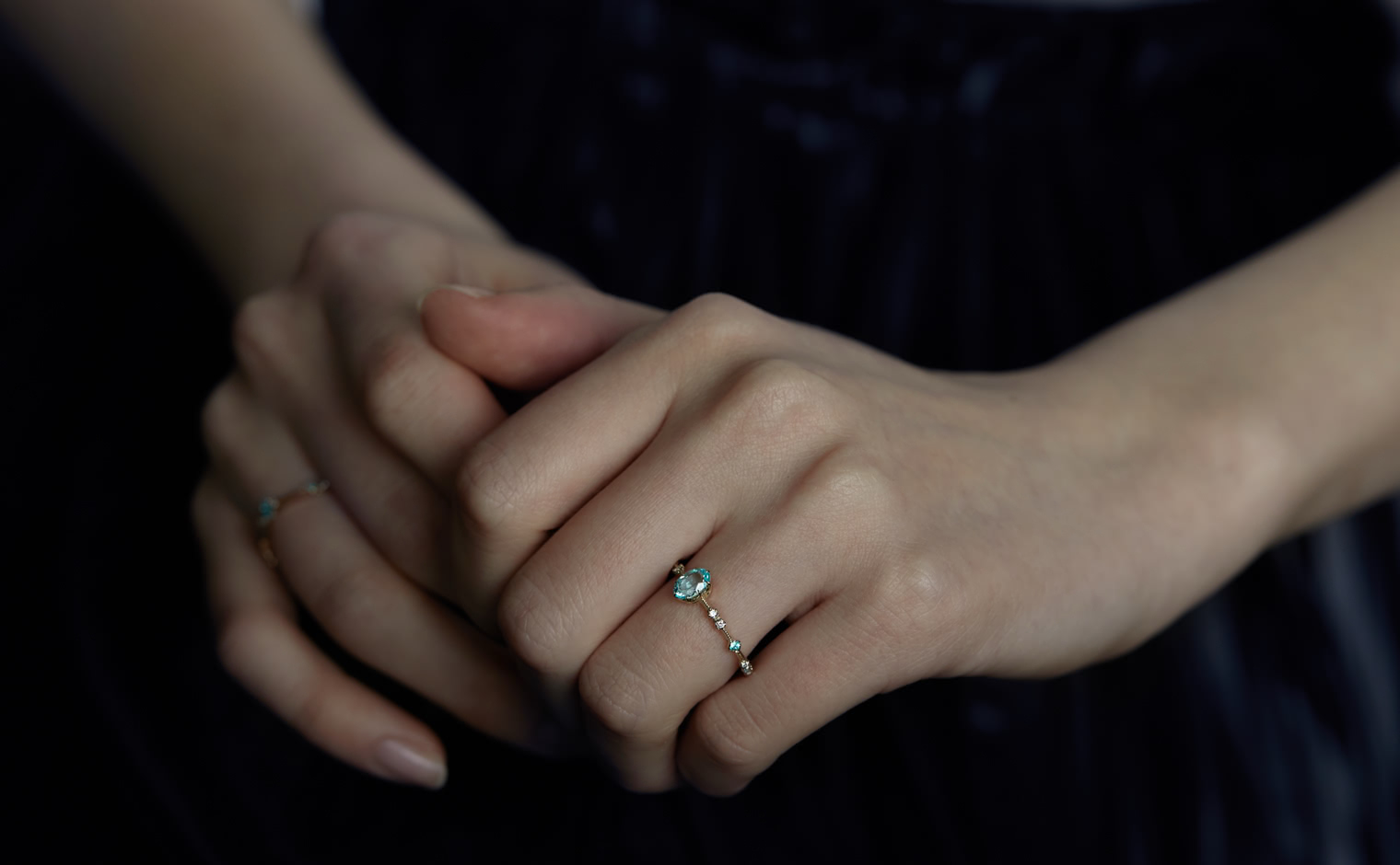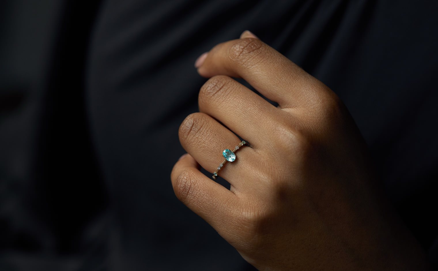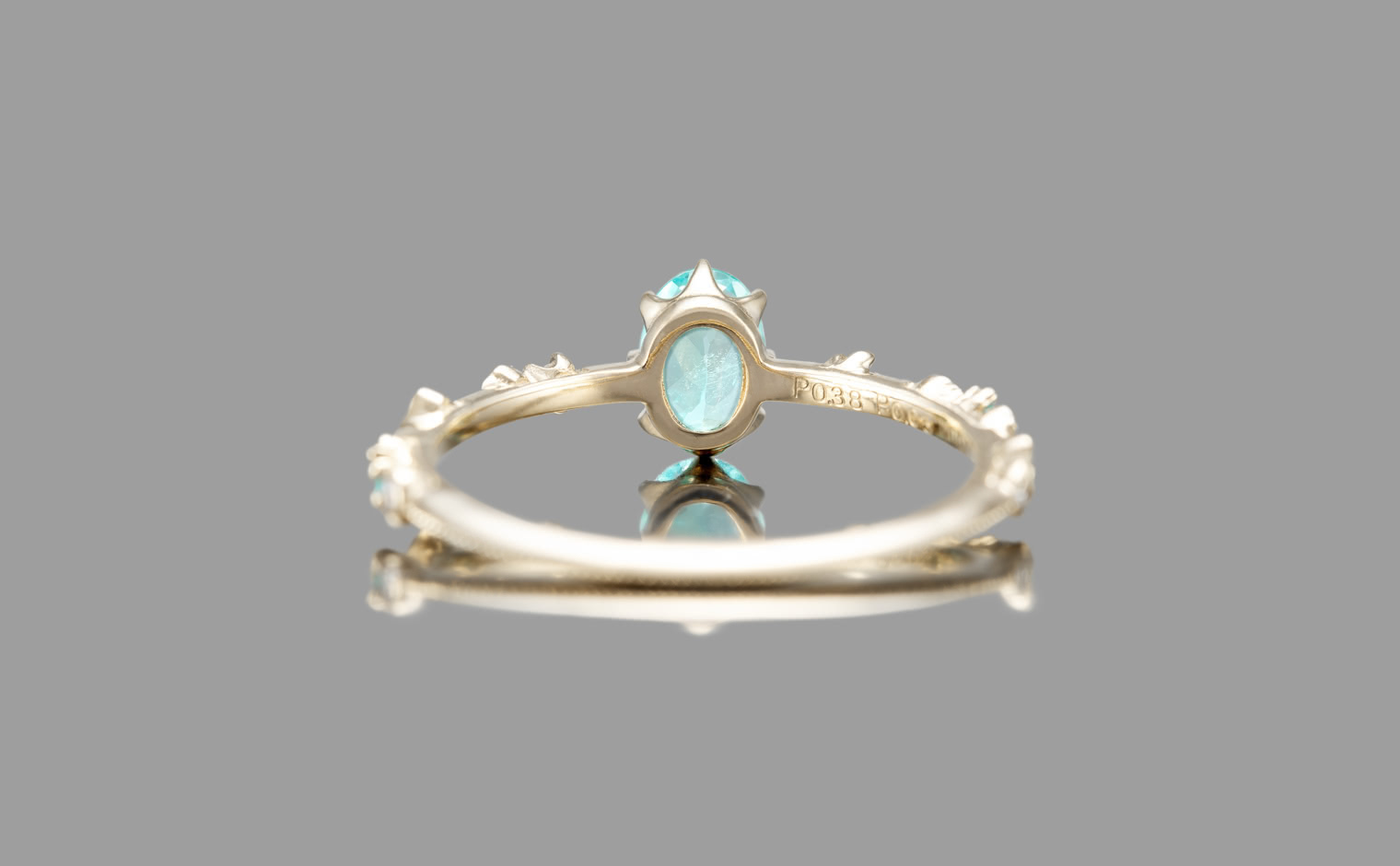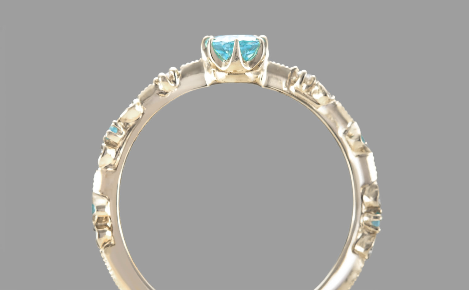 Diamonds and smaller vivacious Paraiba tourmalines are hand picked for your ring, set to dance along the band that has been decorated masterfully with hand-applied milgrain edges.