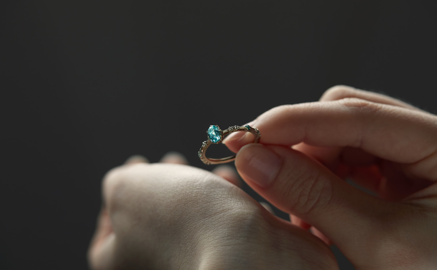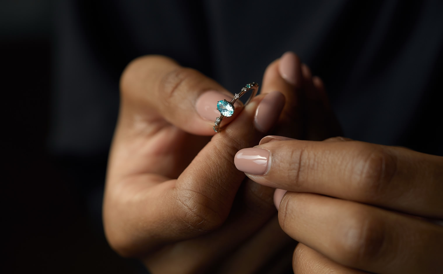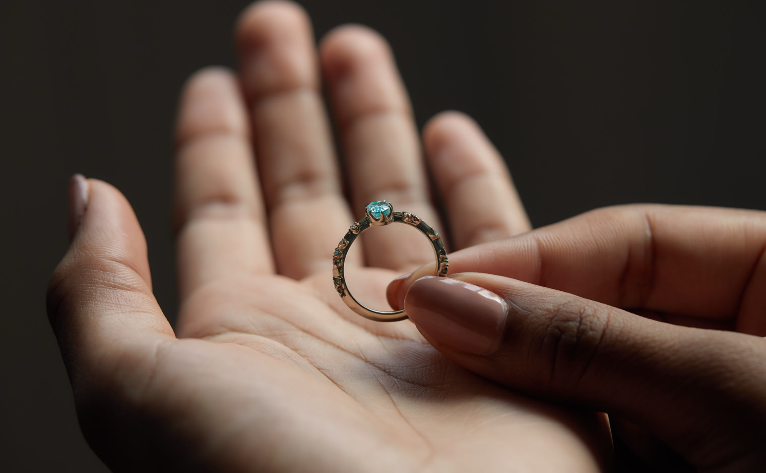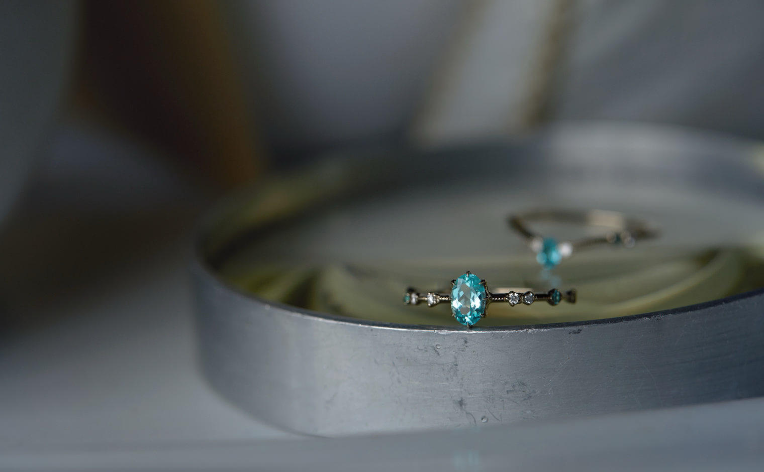 Diamonds and smaller vivacious Paraiba tourmalines are hand picked for your ring, set to dance along the band that has been decorated masterfully with hand-applied milgrain edges.