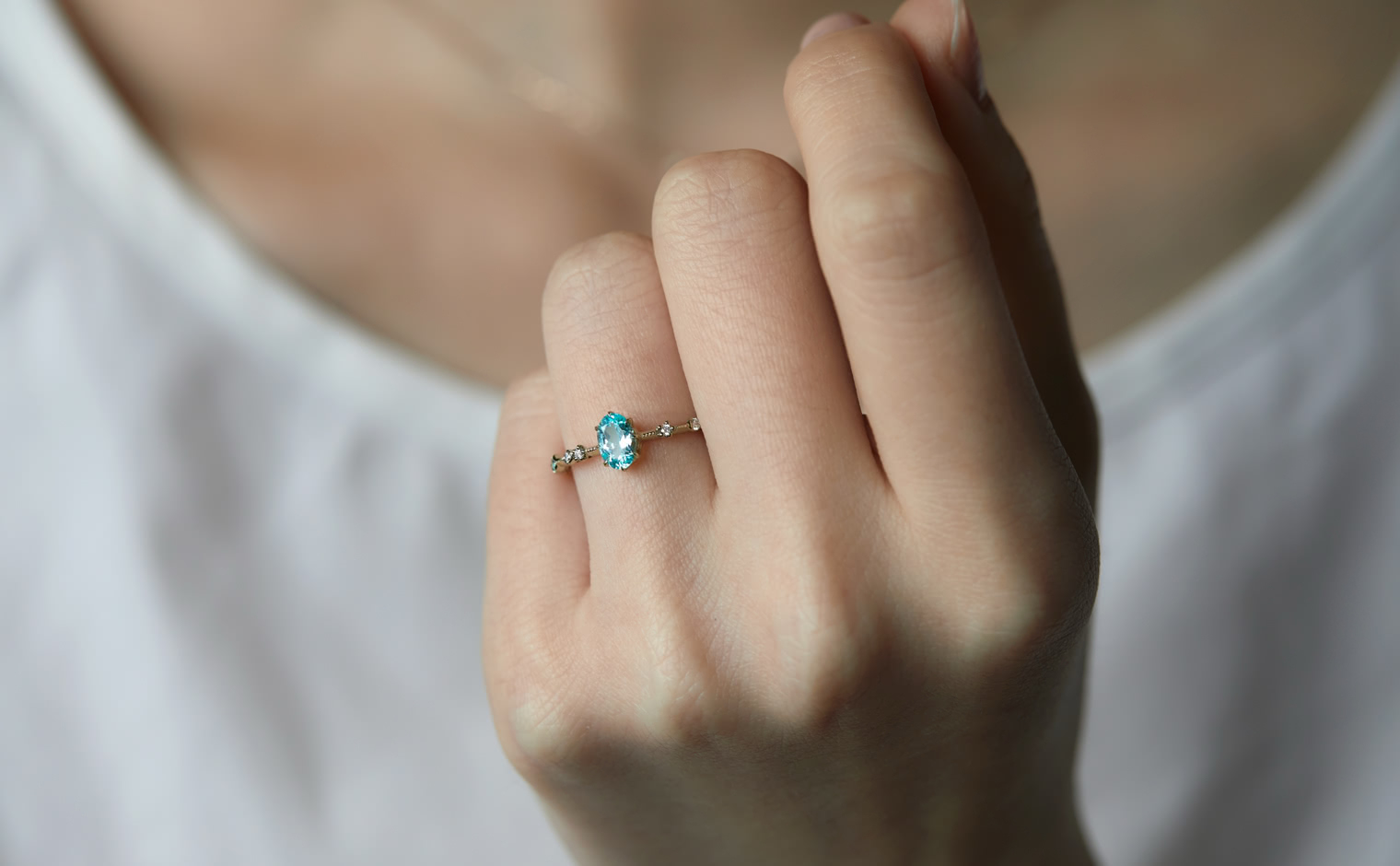 This smoothly curving oval Paraiba tourmaline is set front and center with hand-shaped claw prongs, thin and elegantly smooth to frame this stone just right.