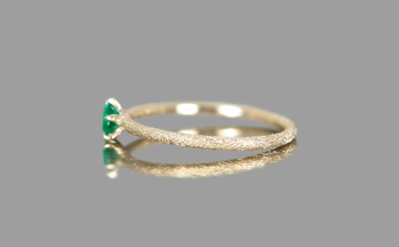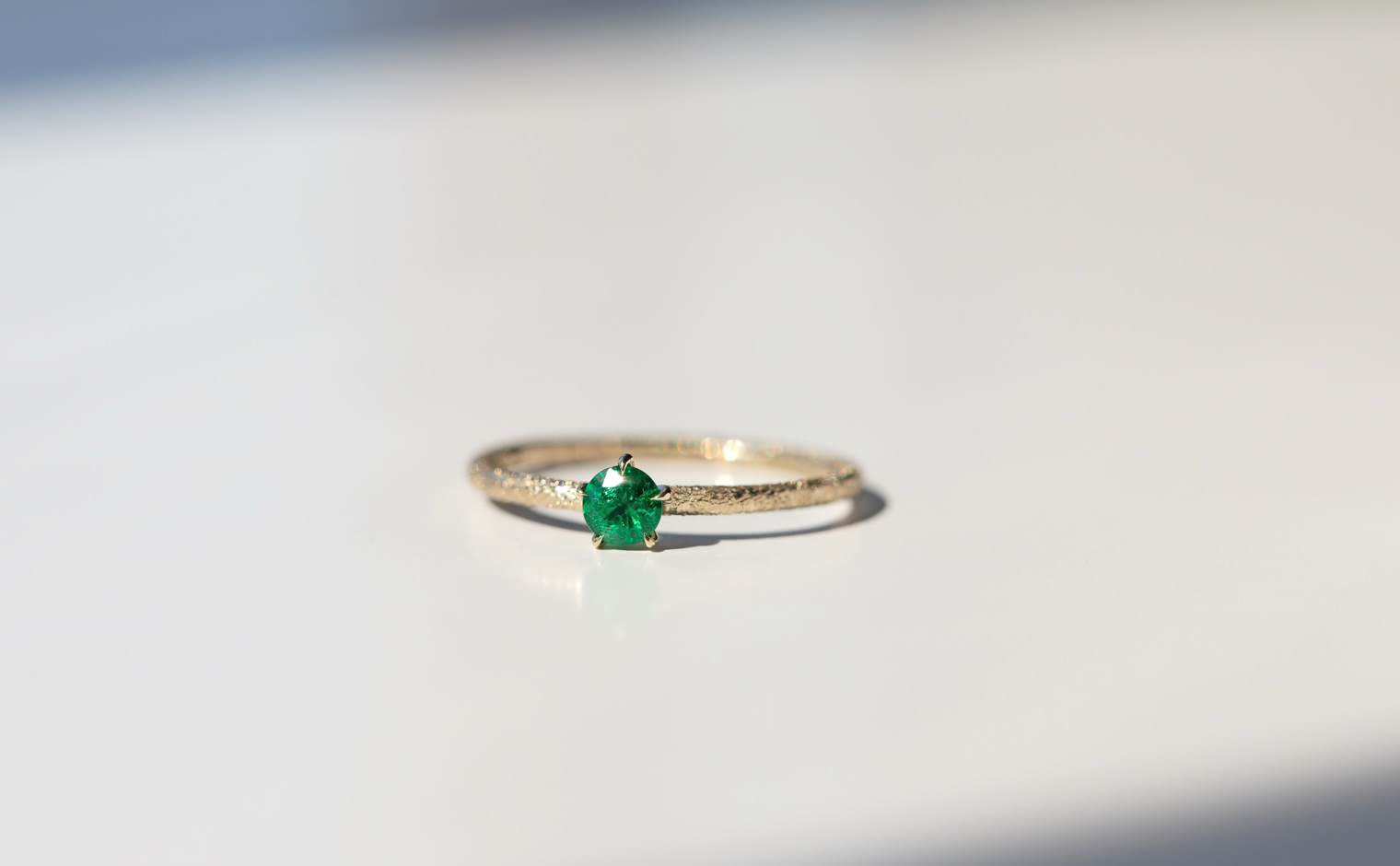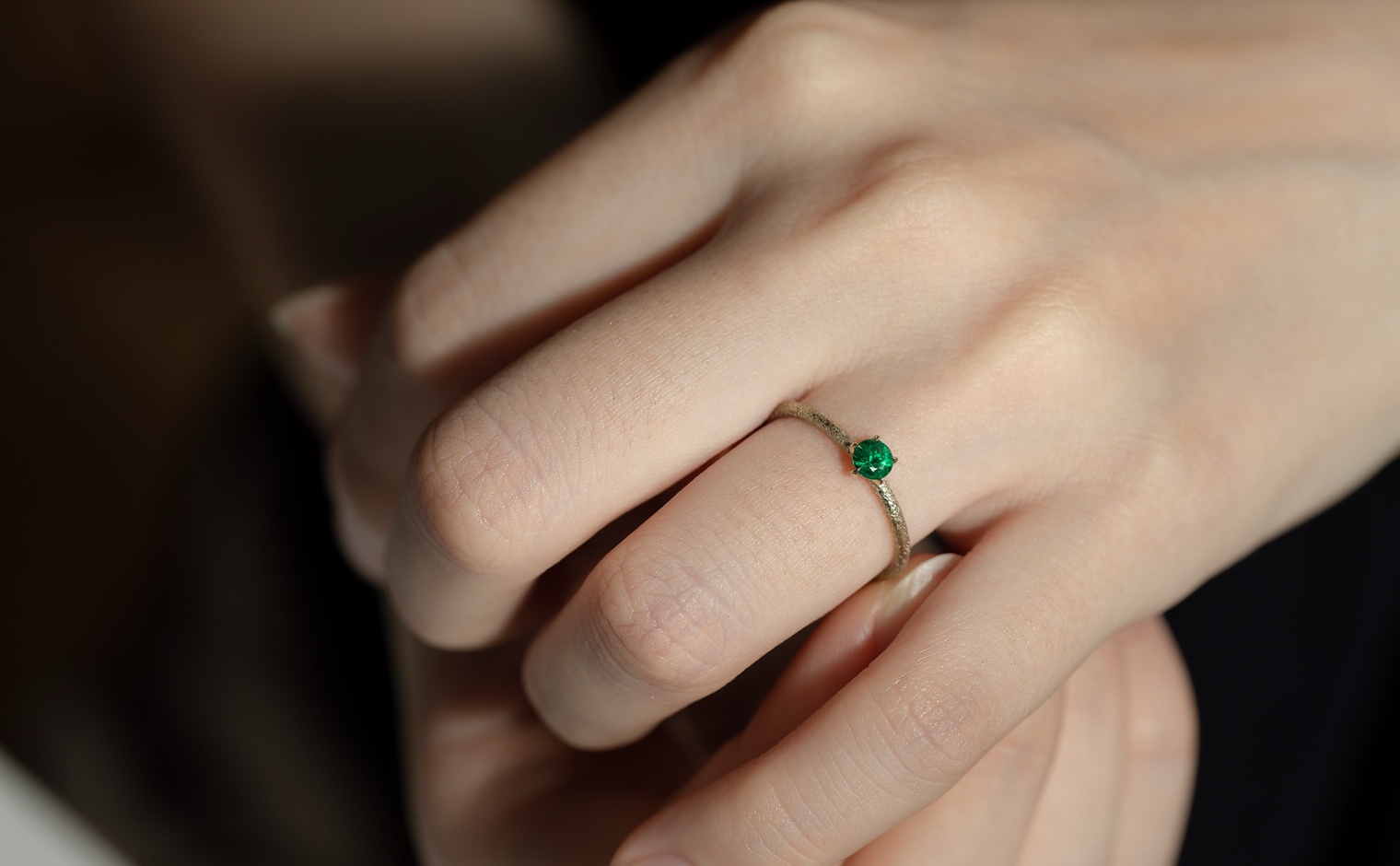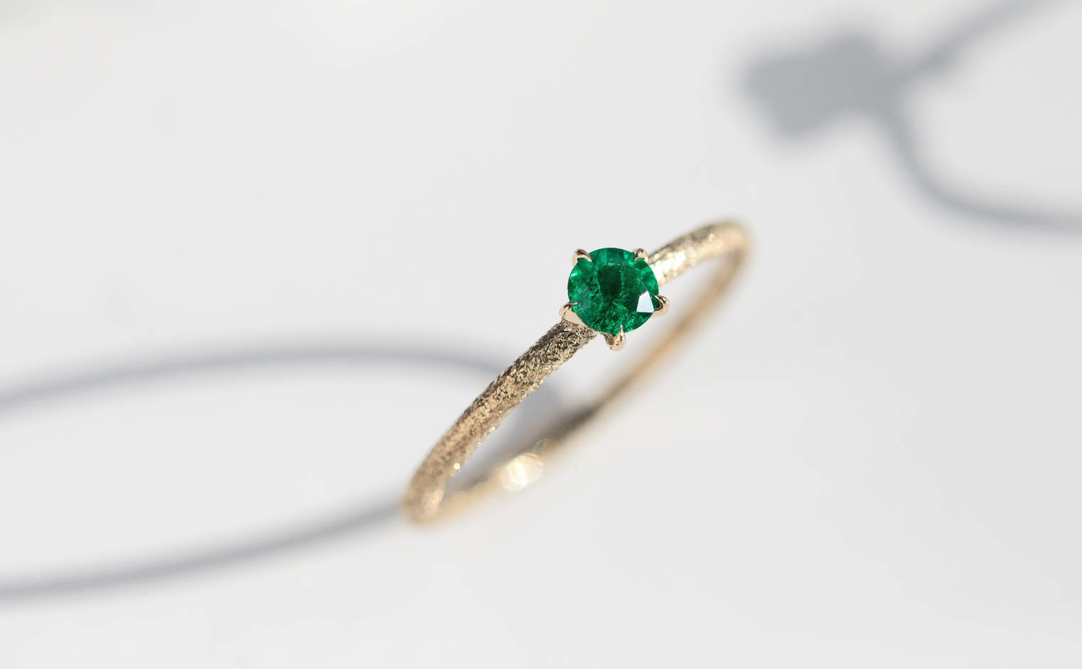 An emerald, glowing with quiet grace in delicate balance. The Emerald Stardust Ring captures soft radiance, a lasting expression of timeless elegance.
