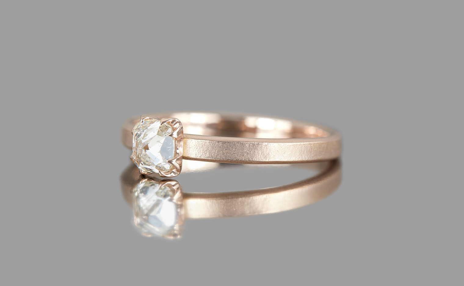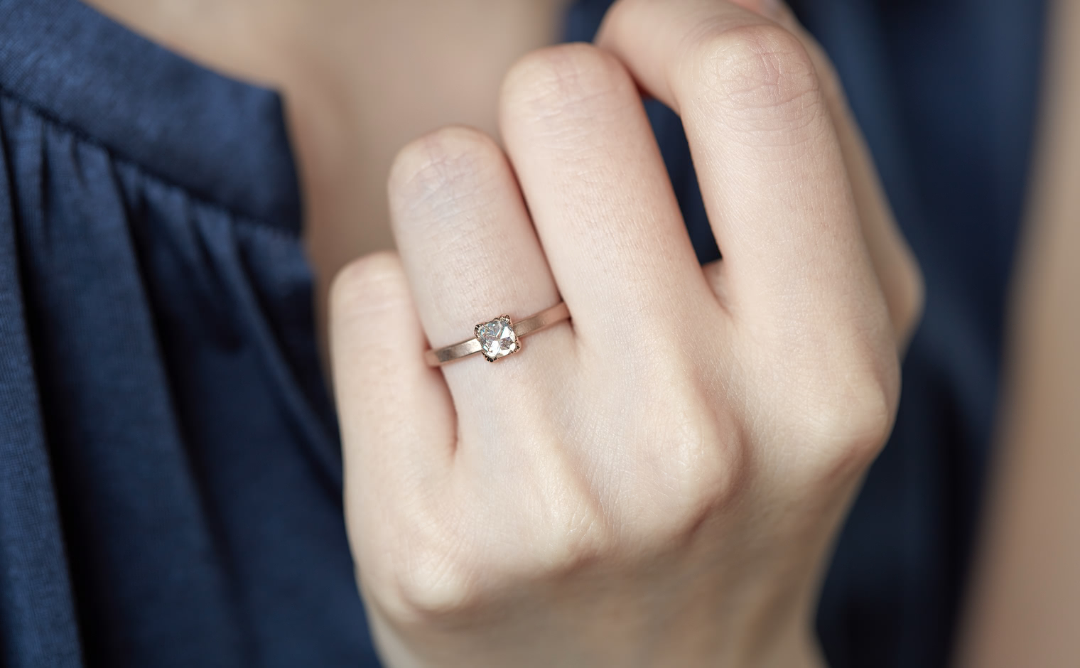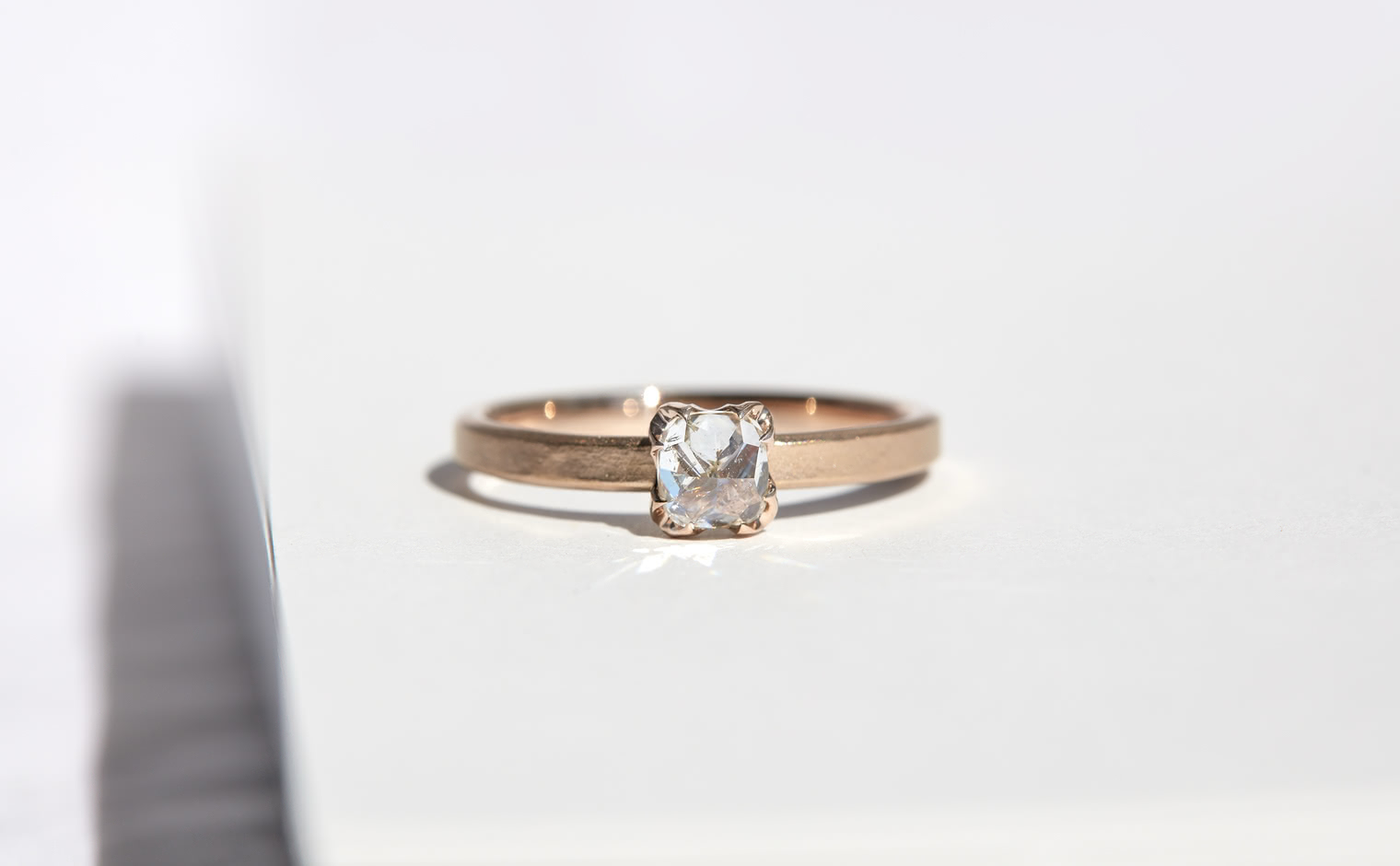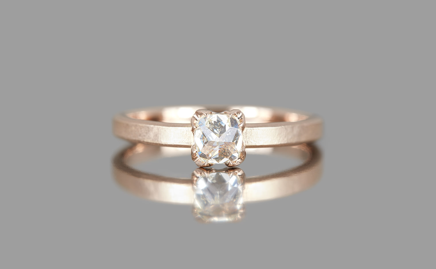 Love is Over the Top. Sparkling and authentic, this unique rough diamond is masterfully mounted inverted on a handcrafted rose gold band, making the Iceberg Ring-Cushion an irresistibly bucolic and charming piece of treasure.