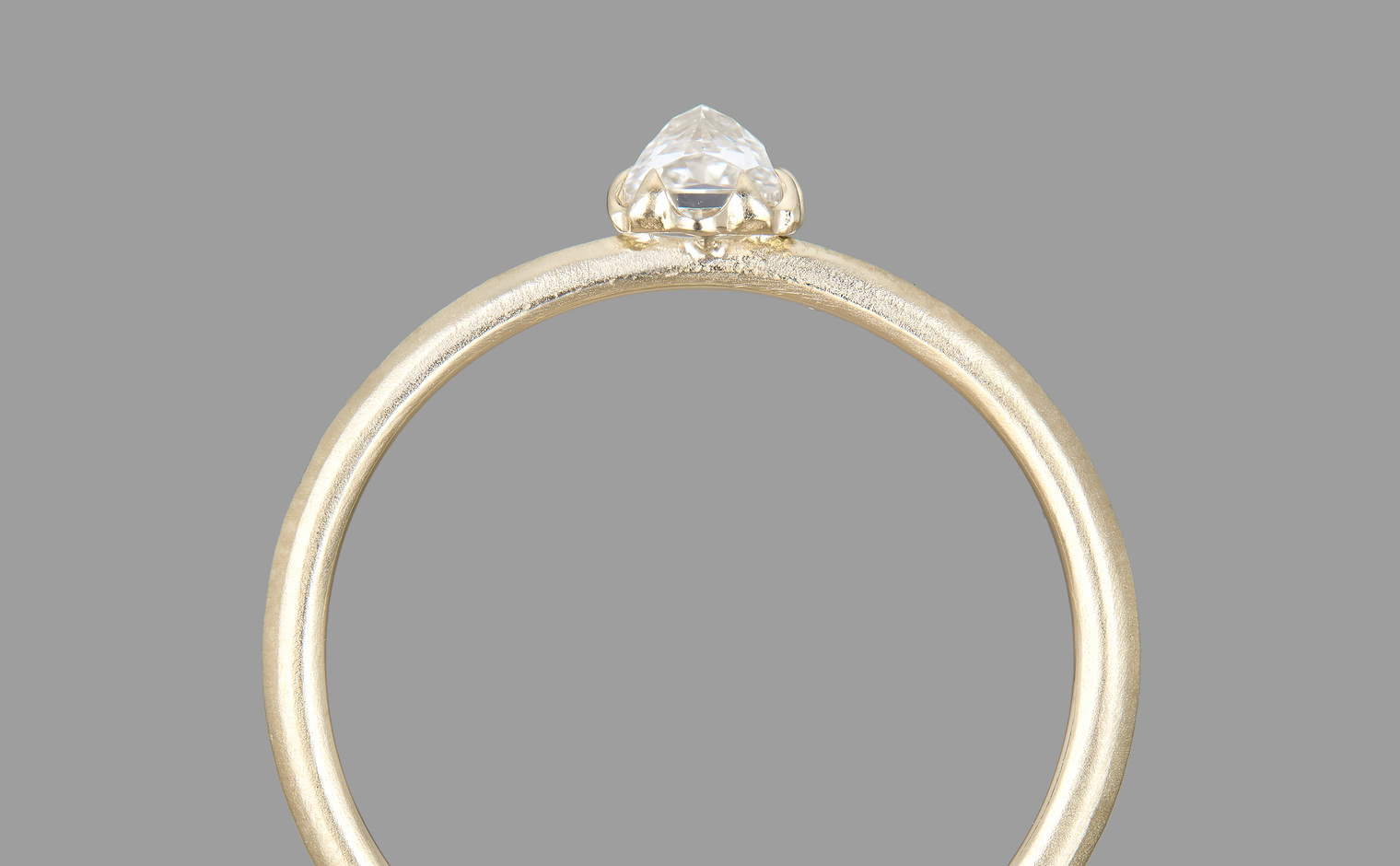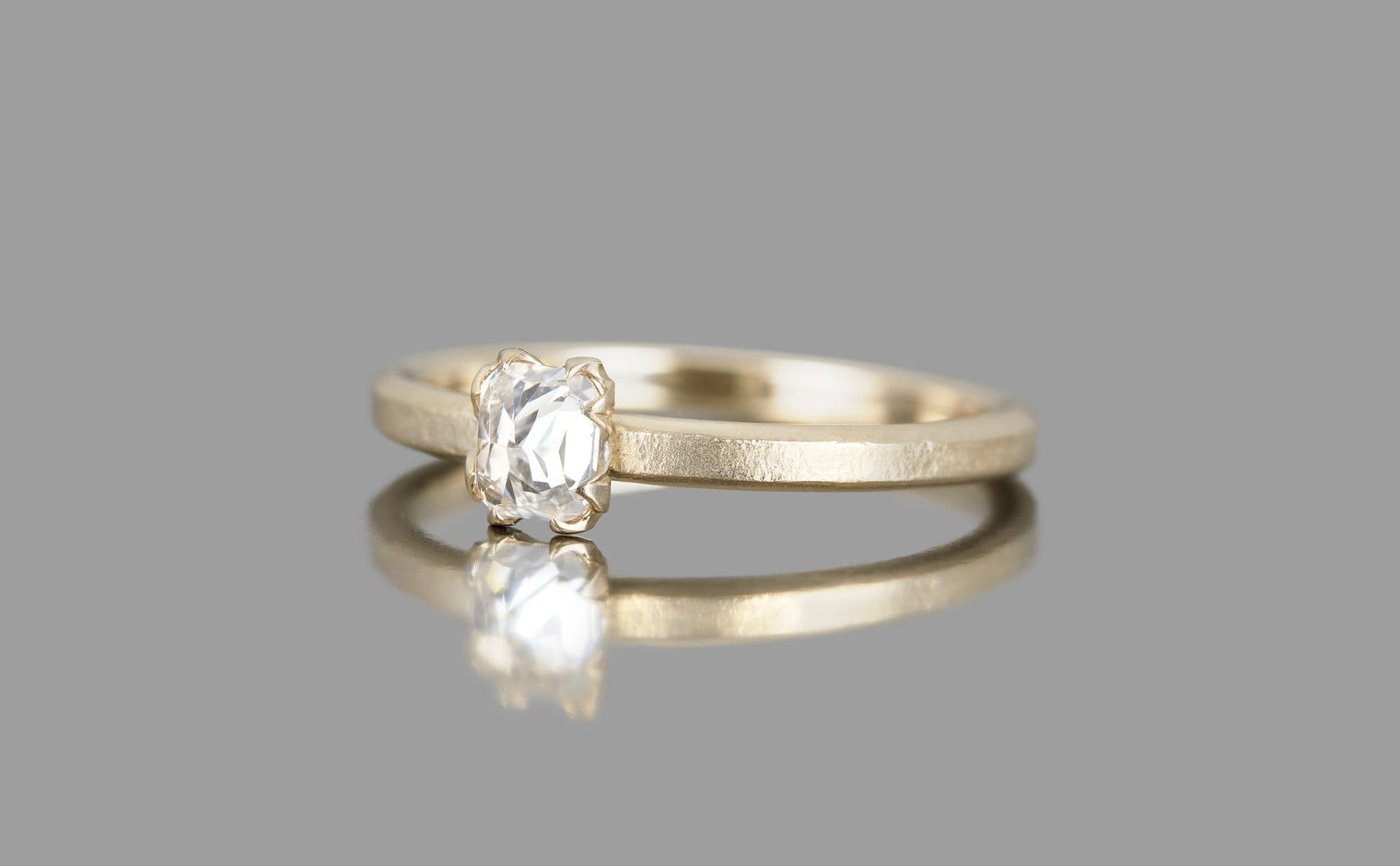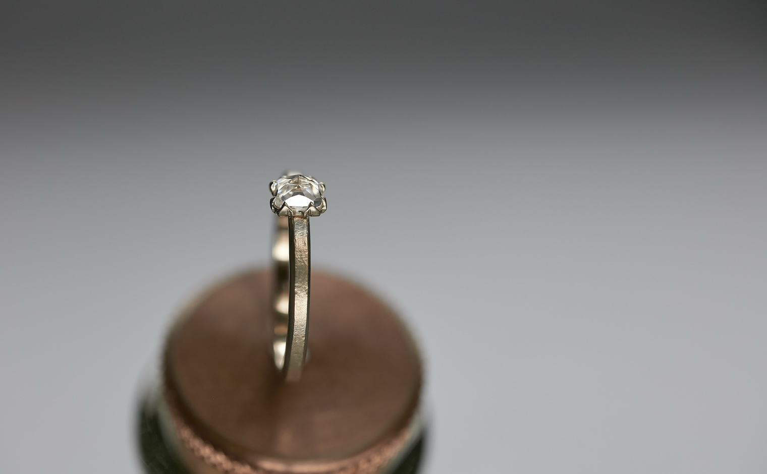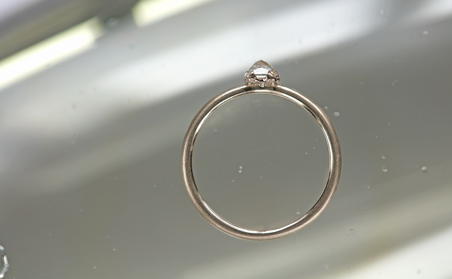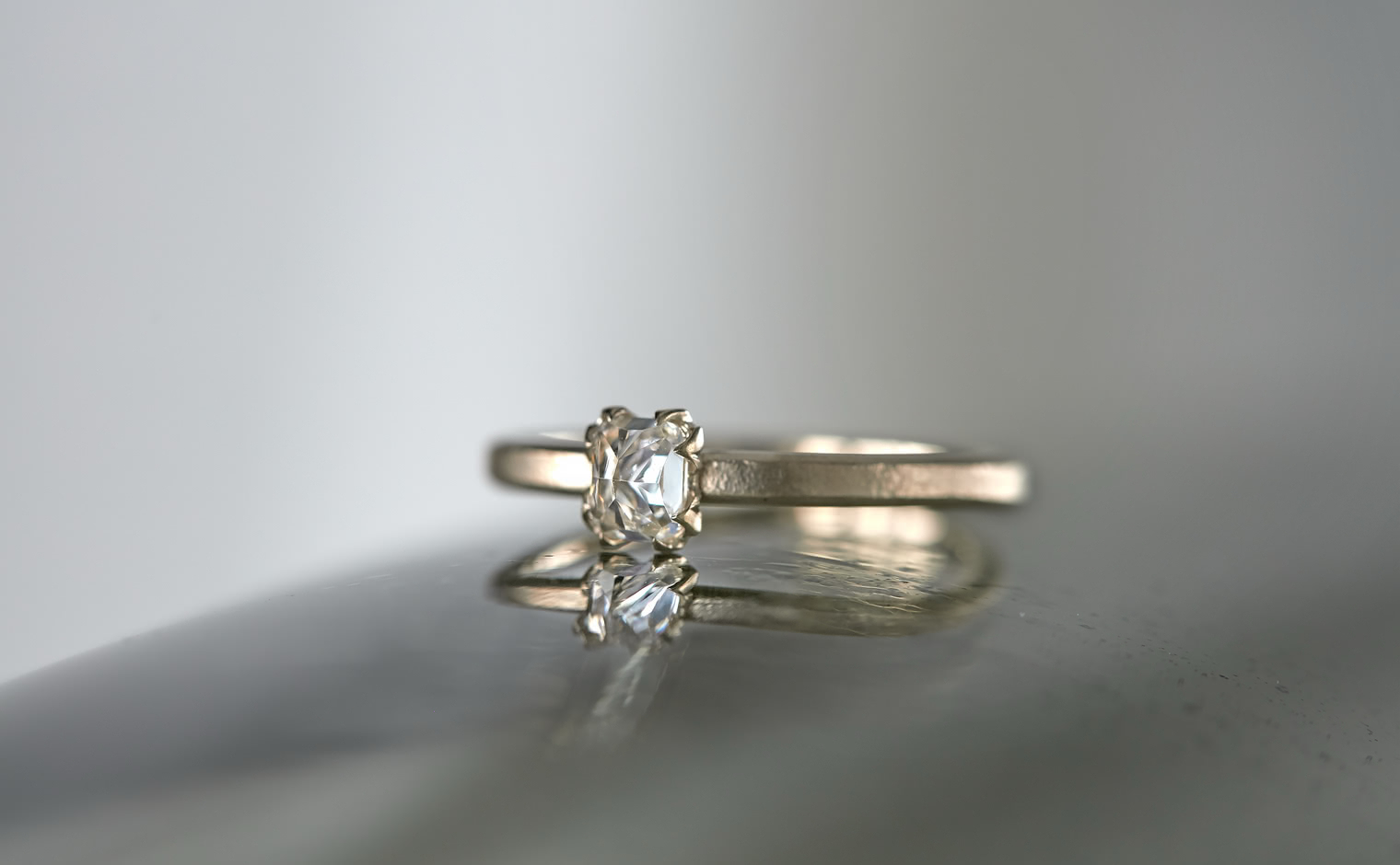 A vision of untouched exquisiteness. Get lost in the world of sublime glacial beauty with its snowy white, inverted diamond atop a handcrafted, raw-polished custom metal band. The Iceberg Ring-Old Mine captures the essence of a magical treasure hidden in the secret frosty peaks of winter.