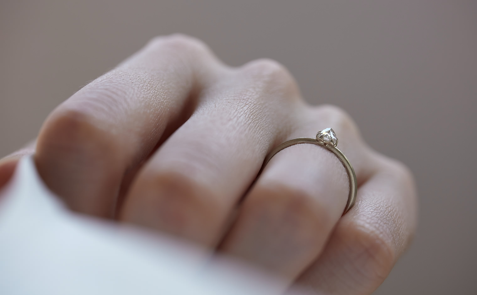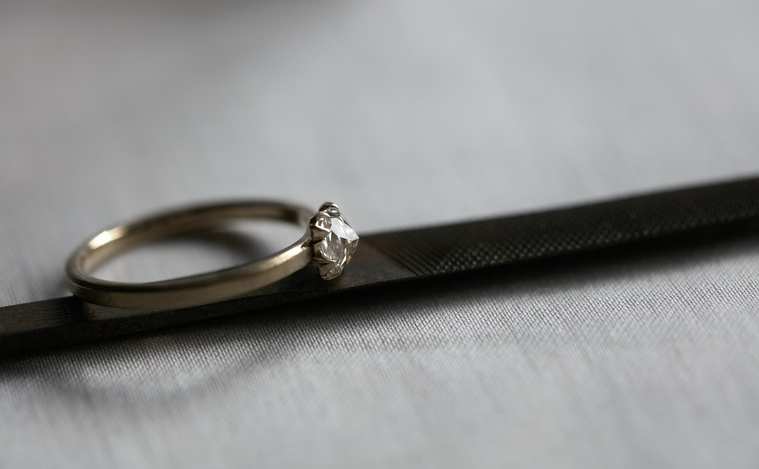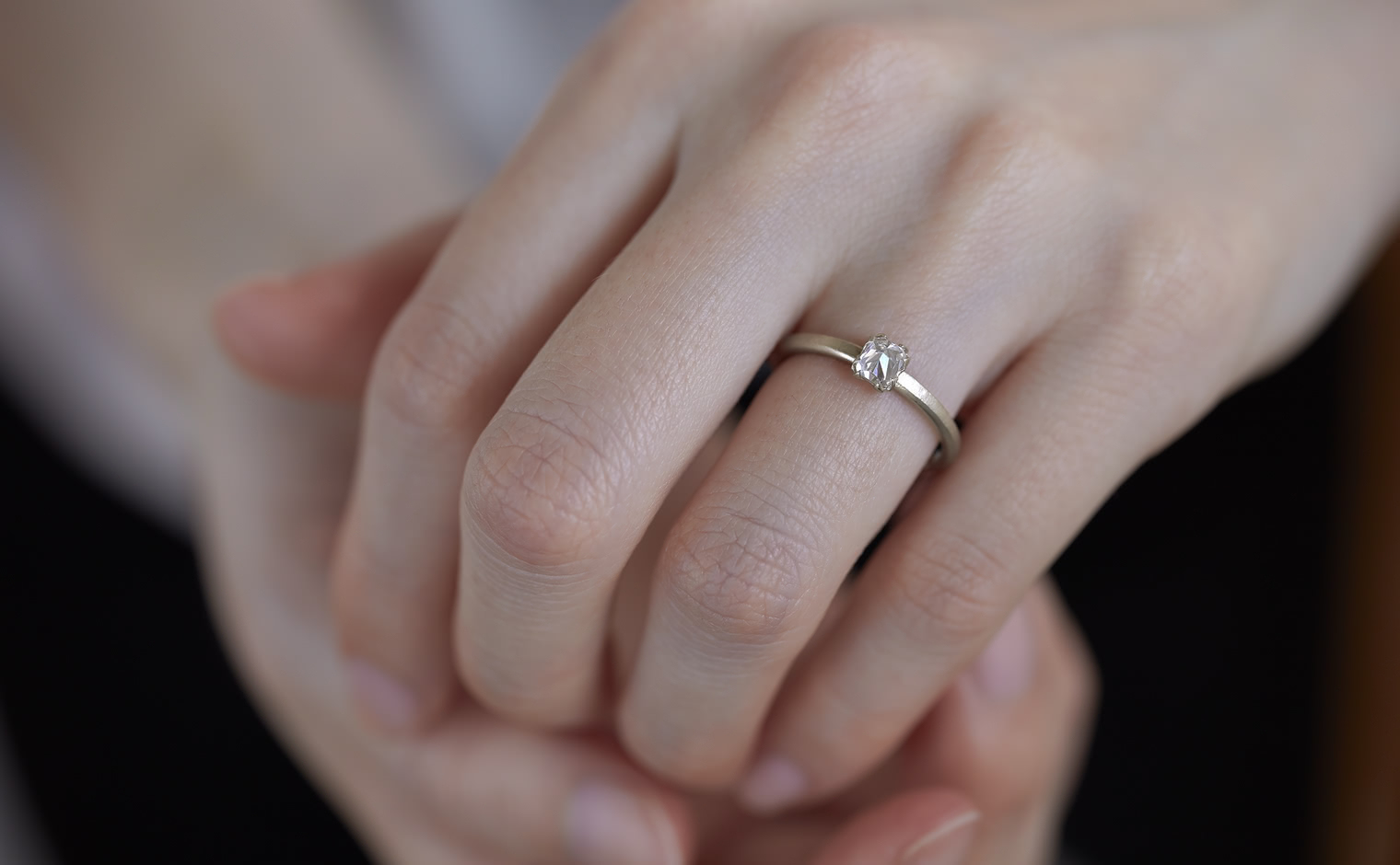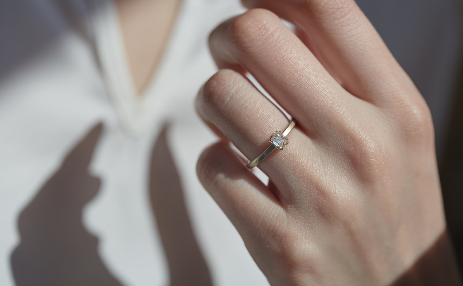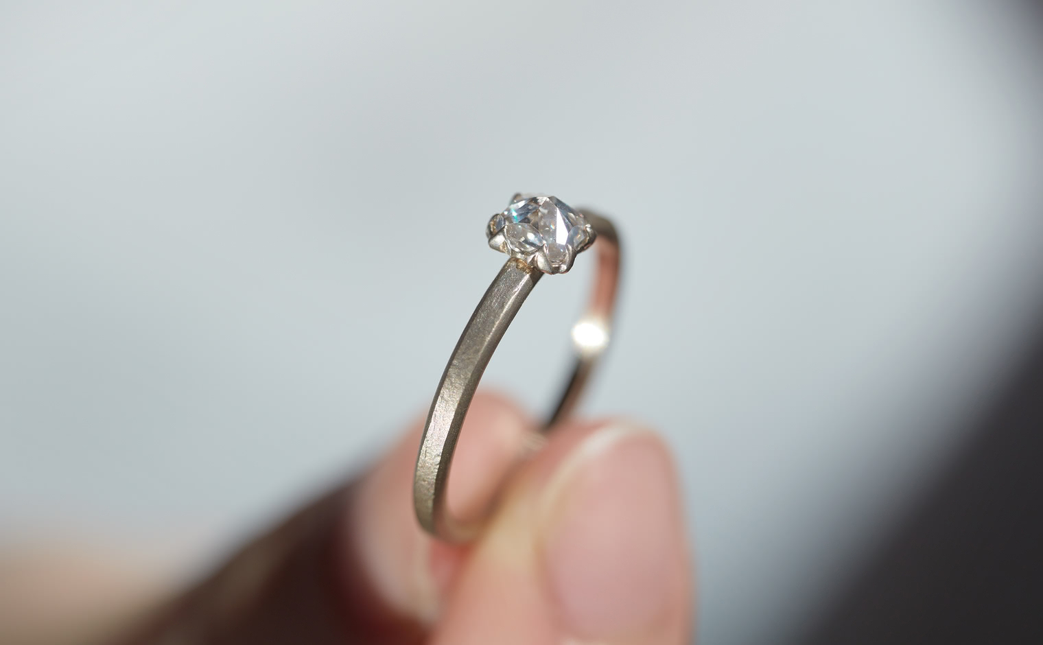 A vision of untouched exquisiteness. Get lost in the world of sublime glacial beauty with its snowy white, inverted diamond atop a handcrafted, raw-polished custom metal band. The Iceberg Ring-Old Mine captures the essence of a magical treasure hidden in the secret frosty peaks of winter.