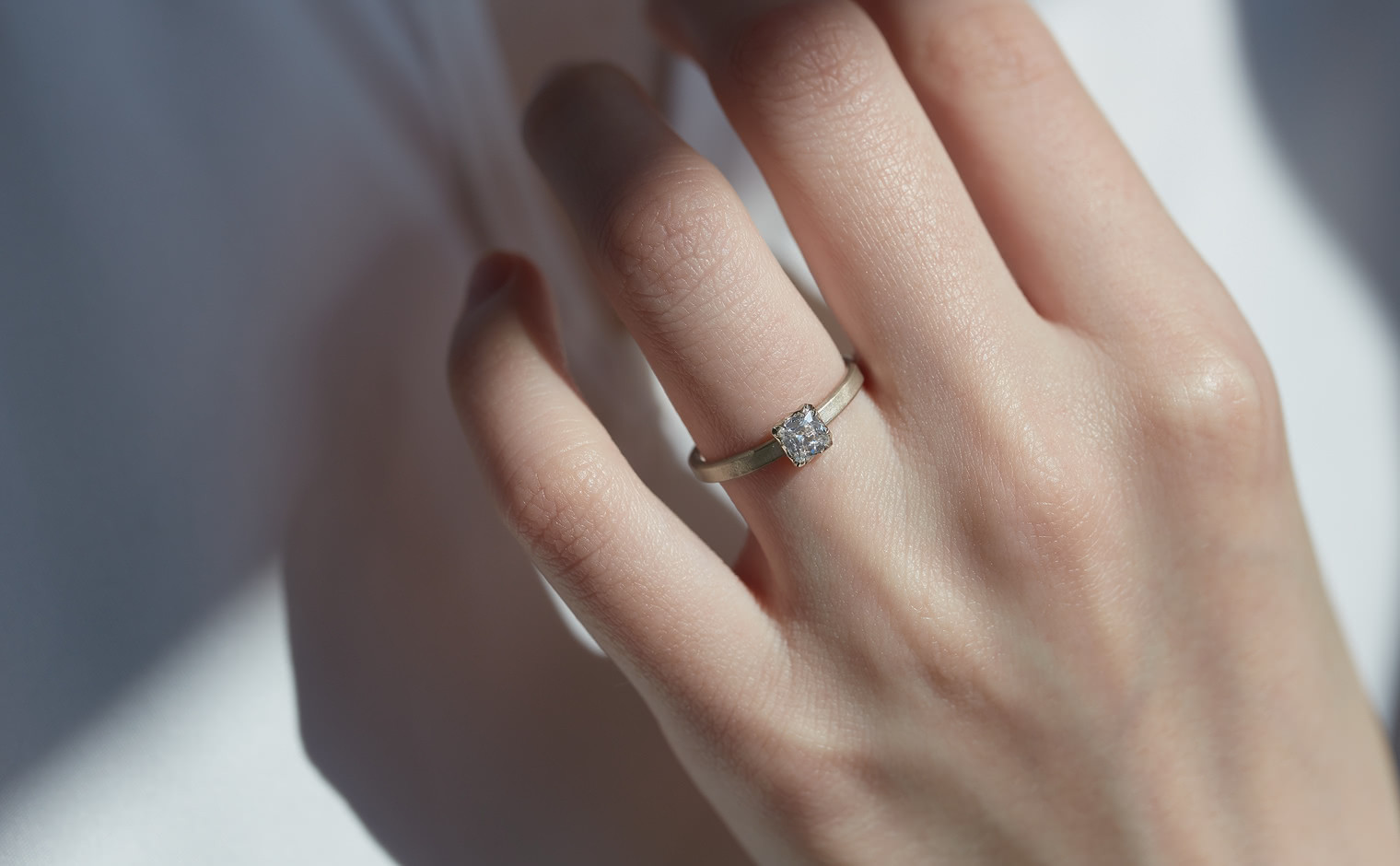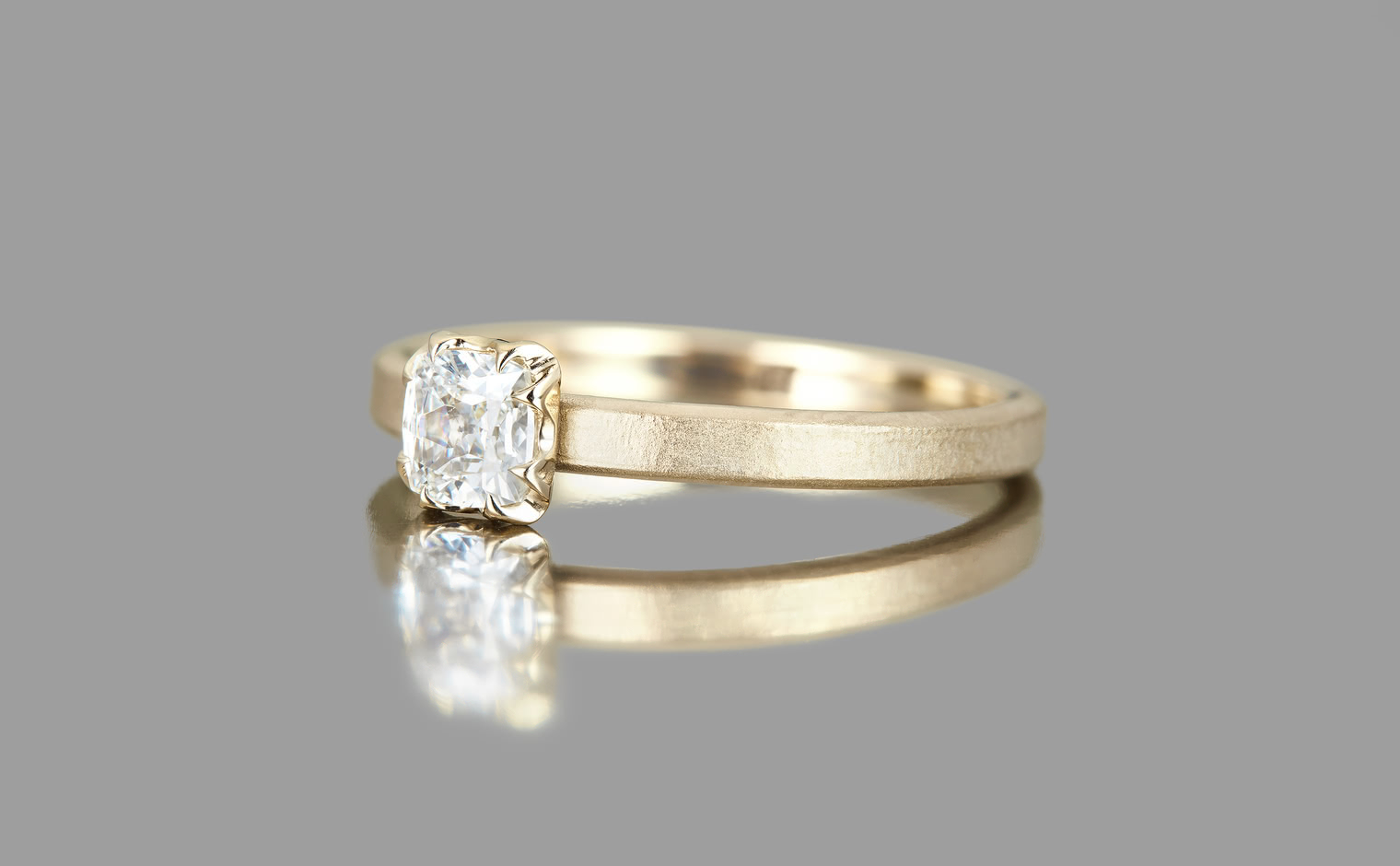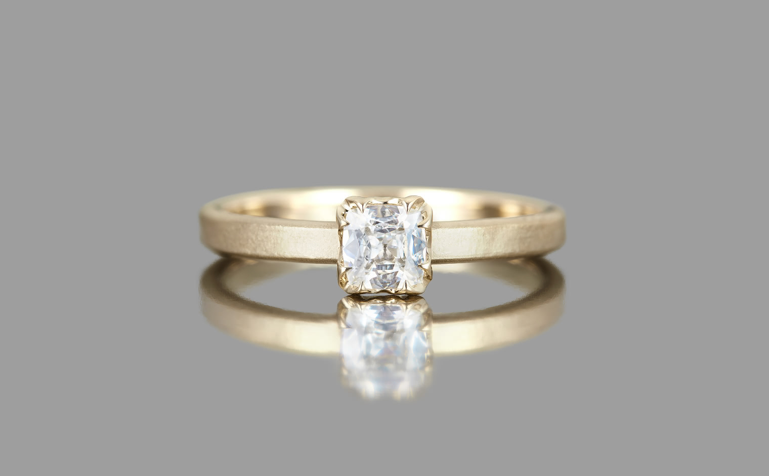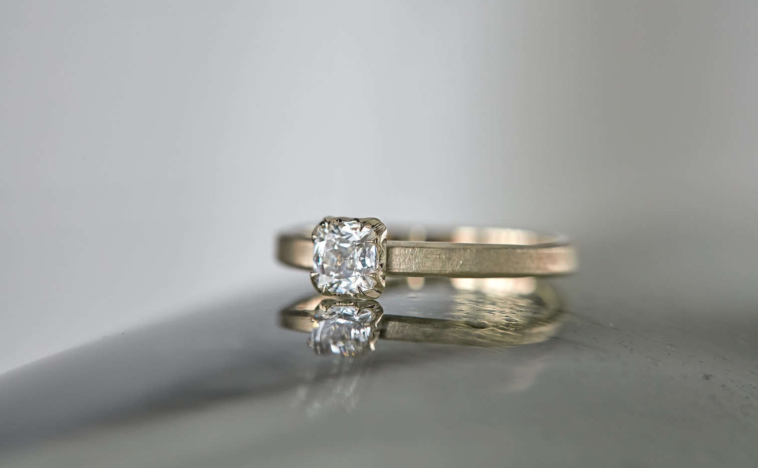 A Vintage-Style Beauty. With its glacial solitaire centerpiece of shimmering ice-white, cushion-cut diamond meticulously set upon a minimalistic yet bold width of custom metal with a hand-polished finish, the Iceberg Ring-Old Mine pays an homage to the centuries of the past whose creative concept never went out of style.