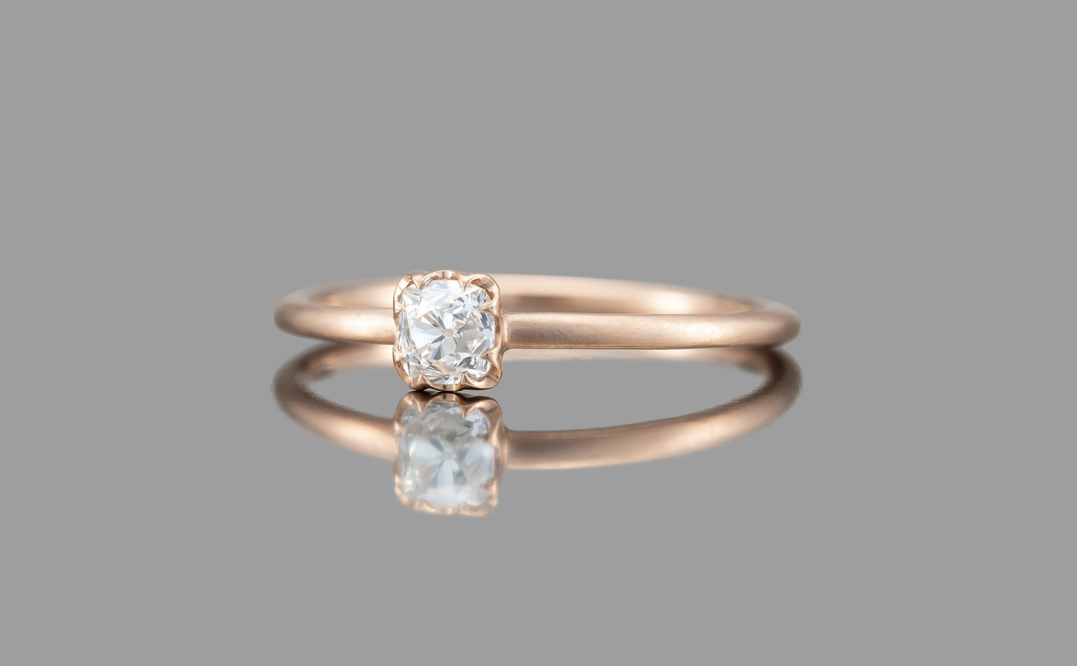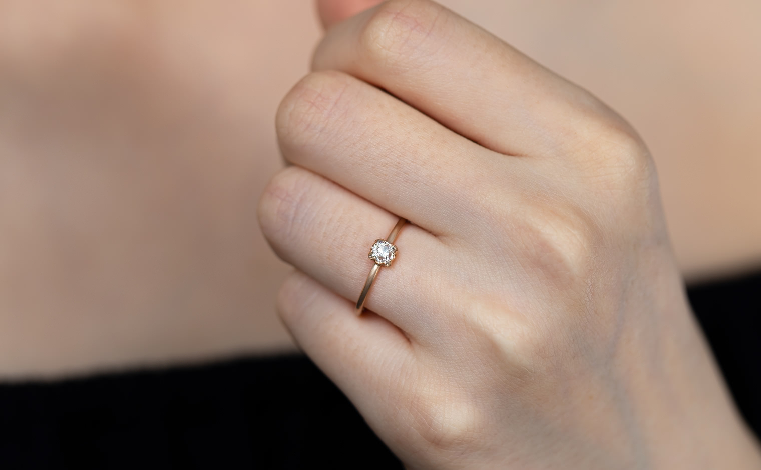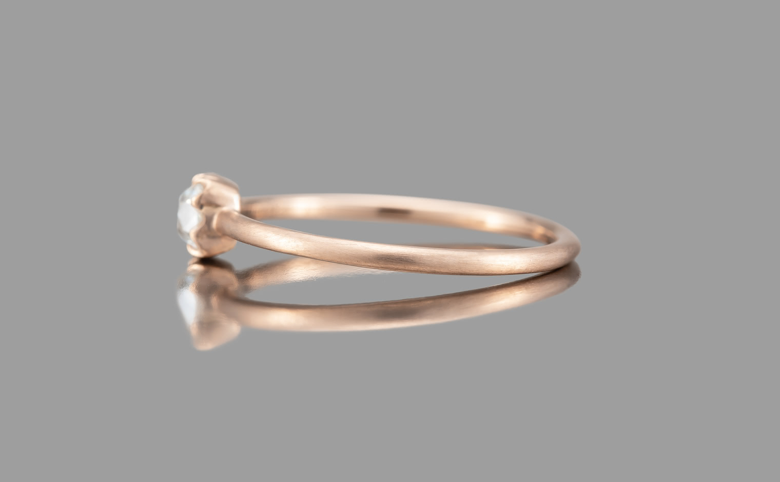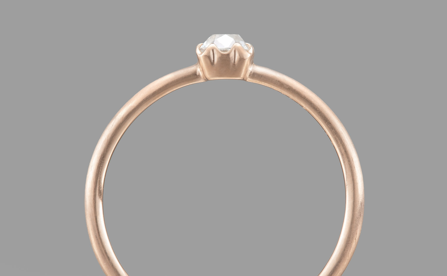 A most delightful tiny ice treasure. With its glowing white diamond laid gently with expert craftsmanship on a hand-polished slender rose gold band, the Iceberg Ring-Petite fills the heart with kisses of enchanted admiration.