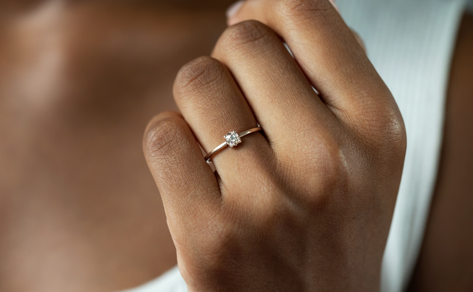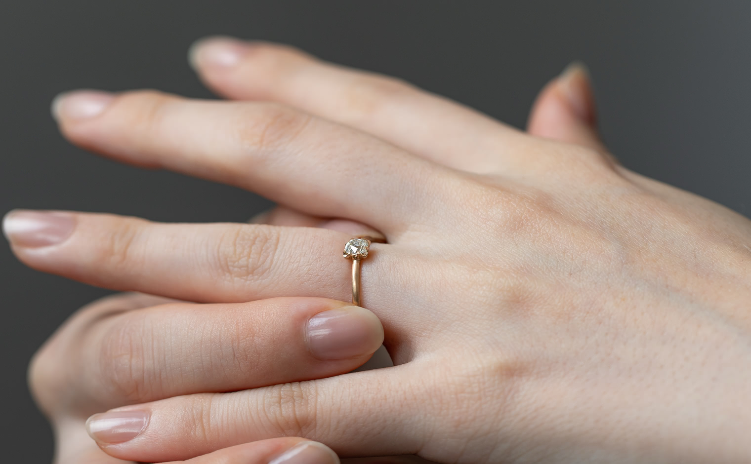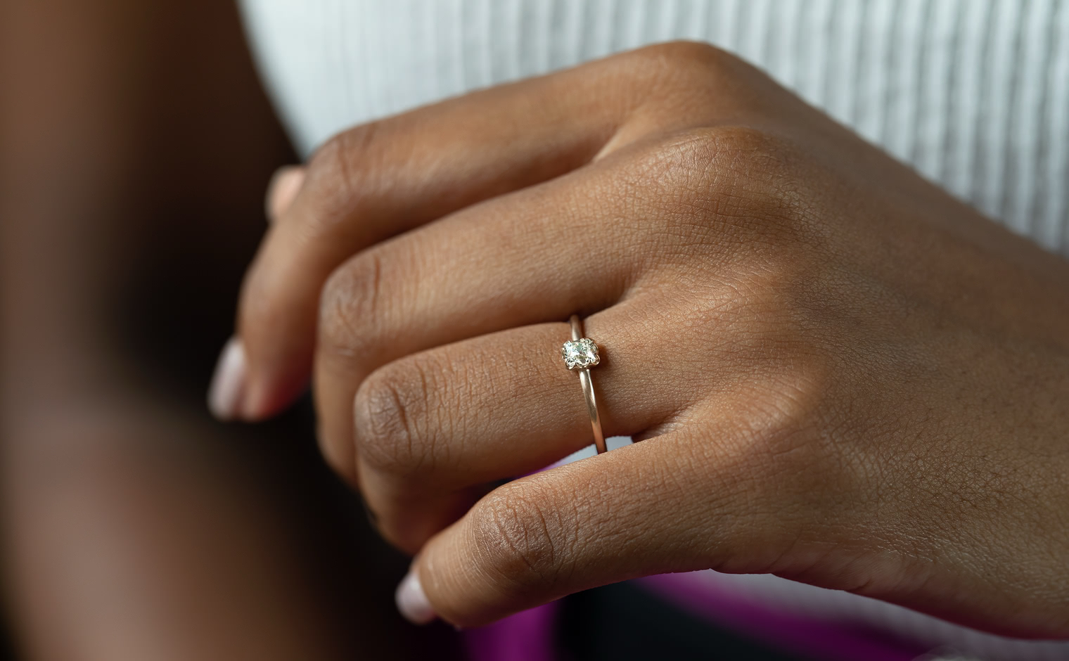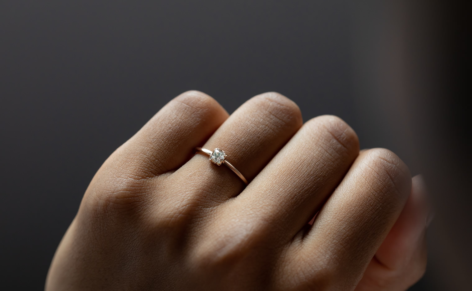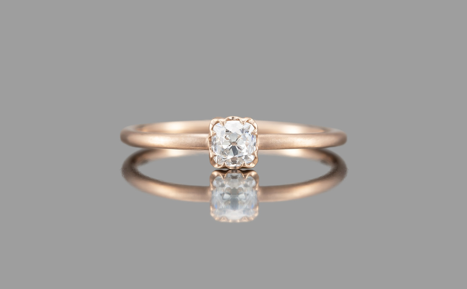 A most delightful tiny ice treasure. With its glowing white diamond laid gently with expert craftsmanship on a hand-polished slender rose gold band, the Iceberg Ring-Petite fills the heart with kisses of enchanted admiration.