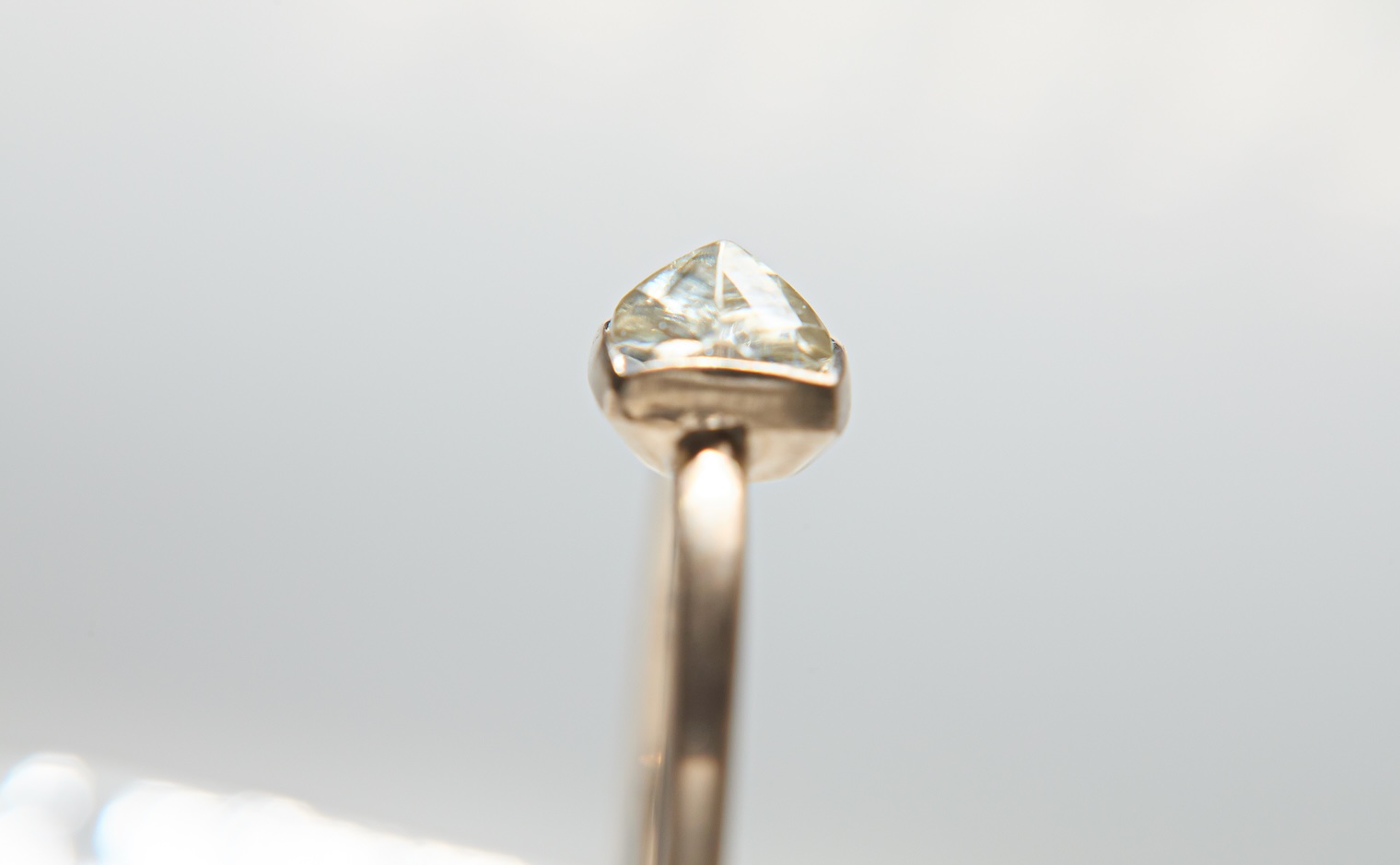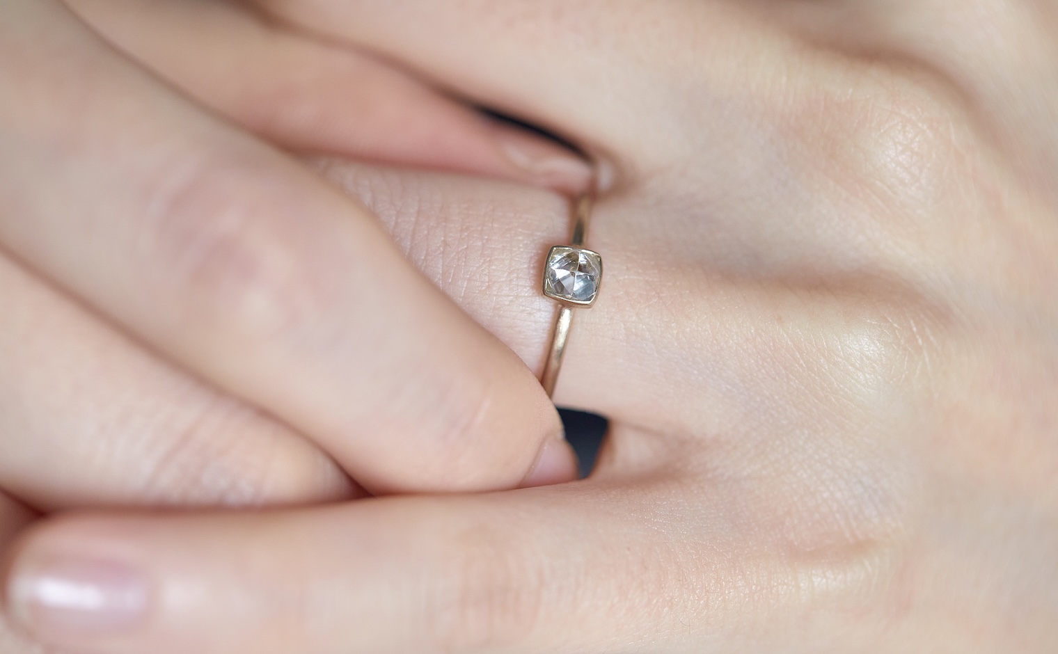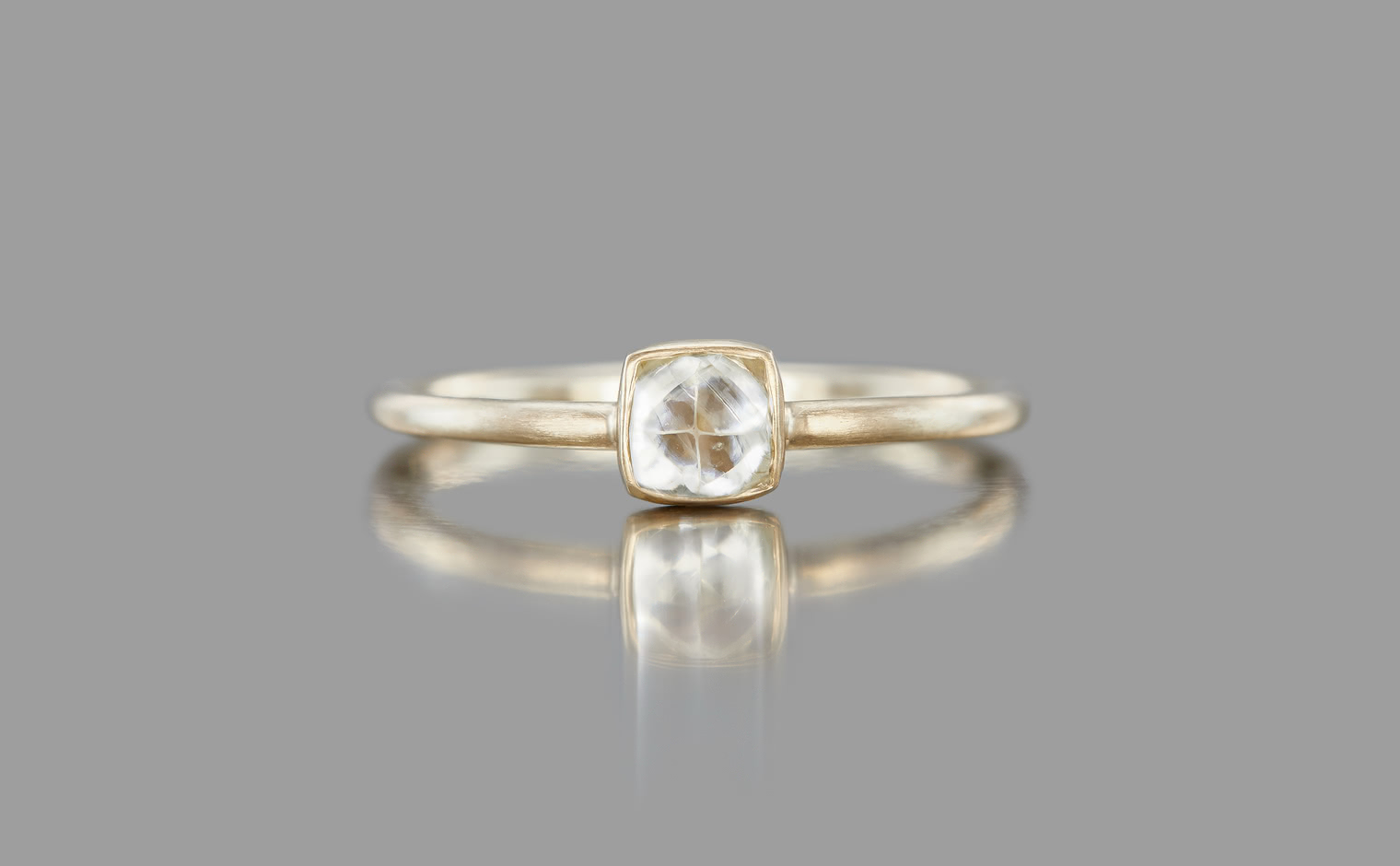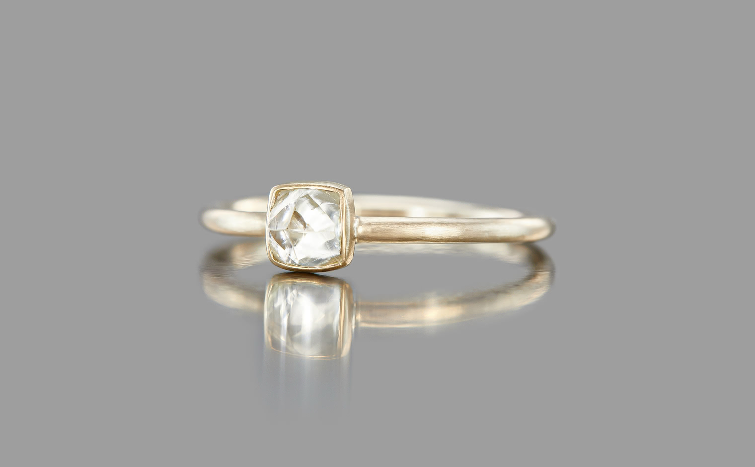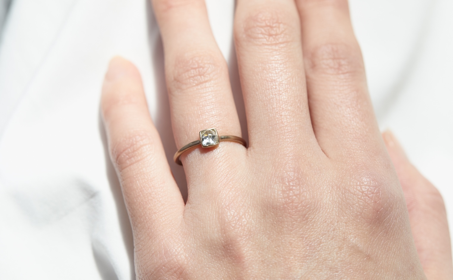The Iceberg Ring–Snowfall features a meticulously hand-cut diamond, nestled within a cushion-shaped bezel atop a hand-polished beige gold band. Its facets catch light like fresh snow under a pale winter sun, evoking a sense of serene beauty.
