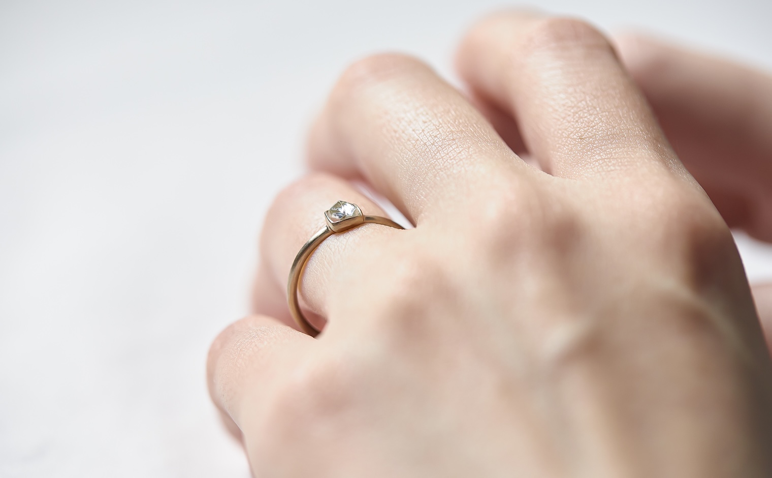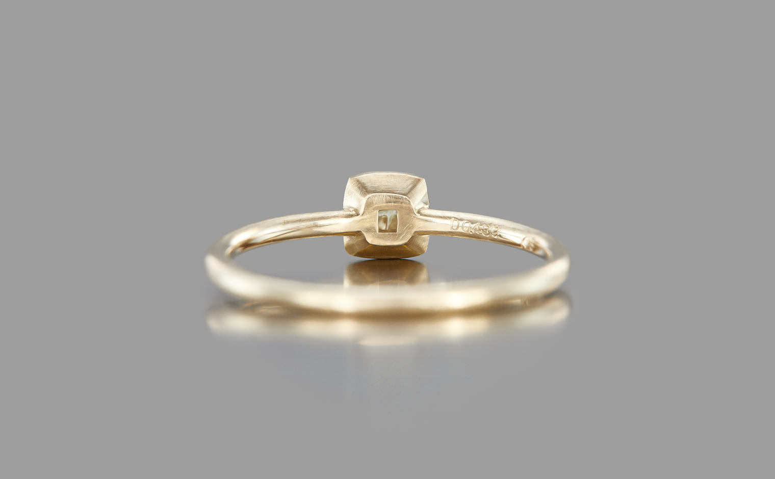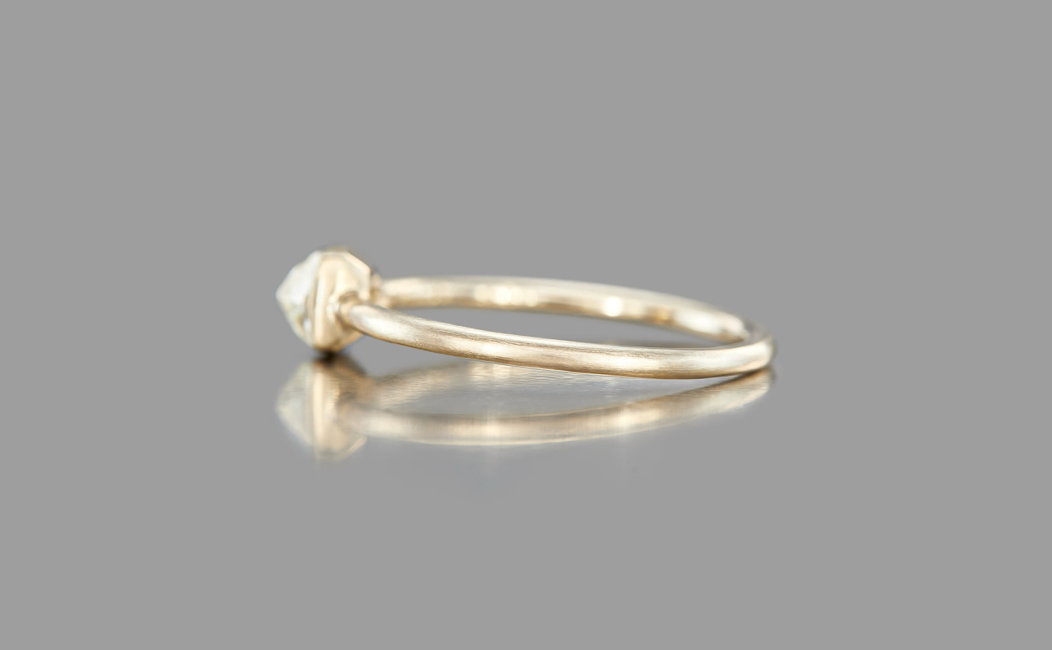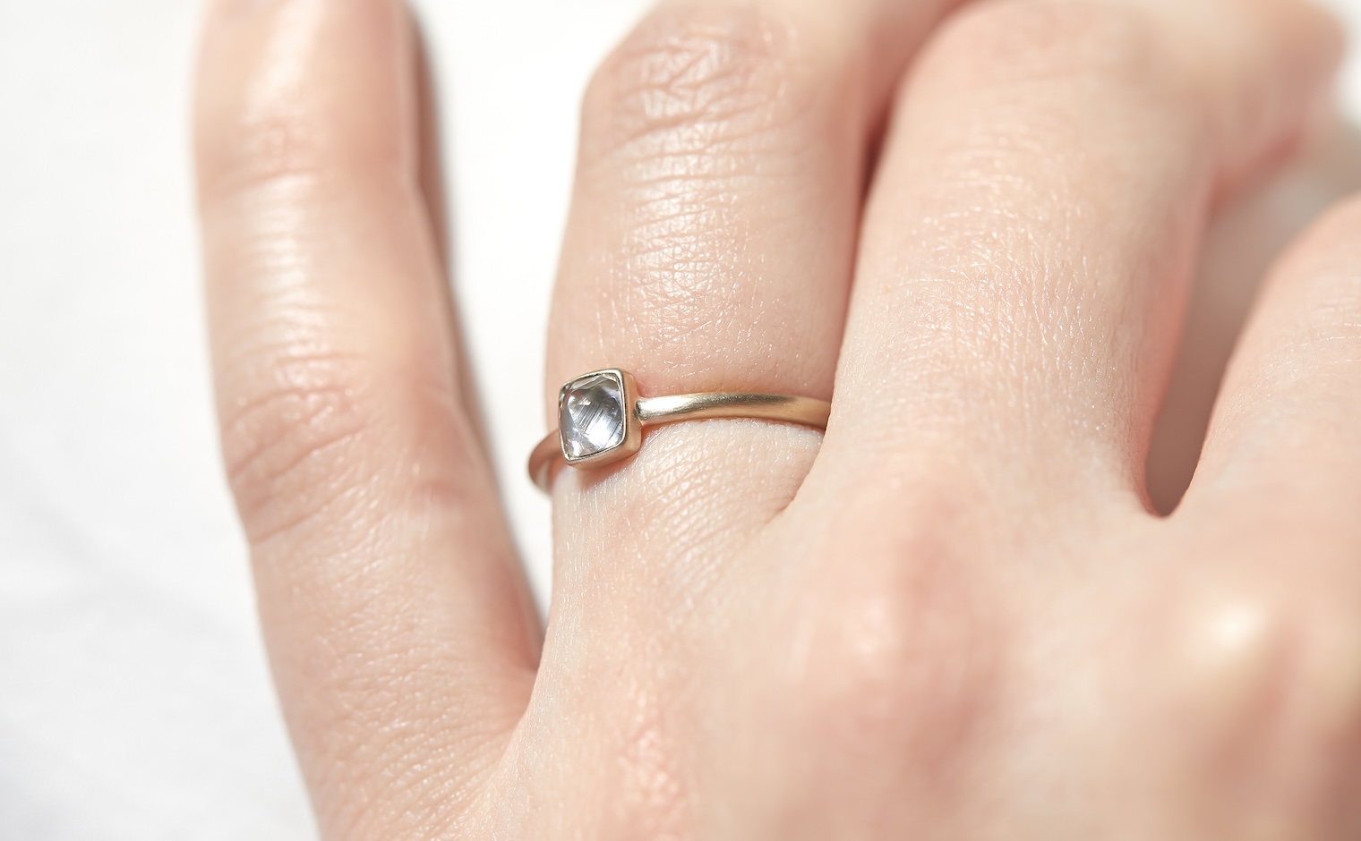 The Iceberg Ring–Snowfall features a meticulously hand-cut diamond, nestled within a cushion-shaped bezel atop a hand-polished beige gold band. Its facets catch light like fresh snow under a pale winter sun, evoking a sense of serene beauty.