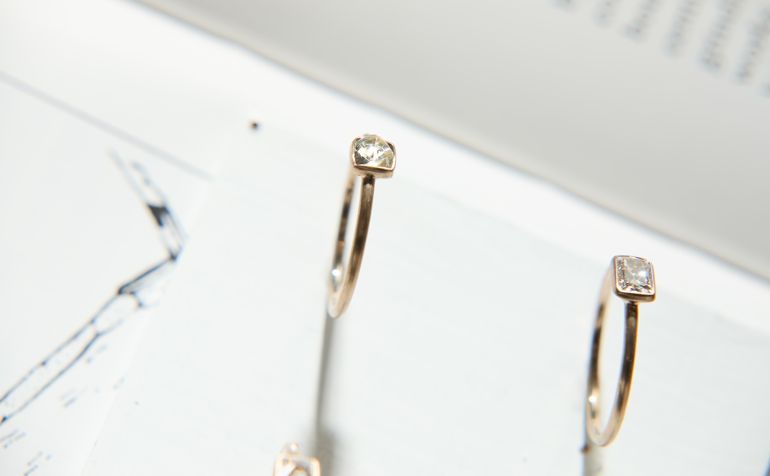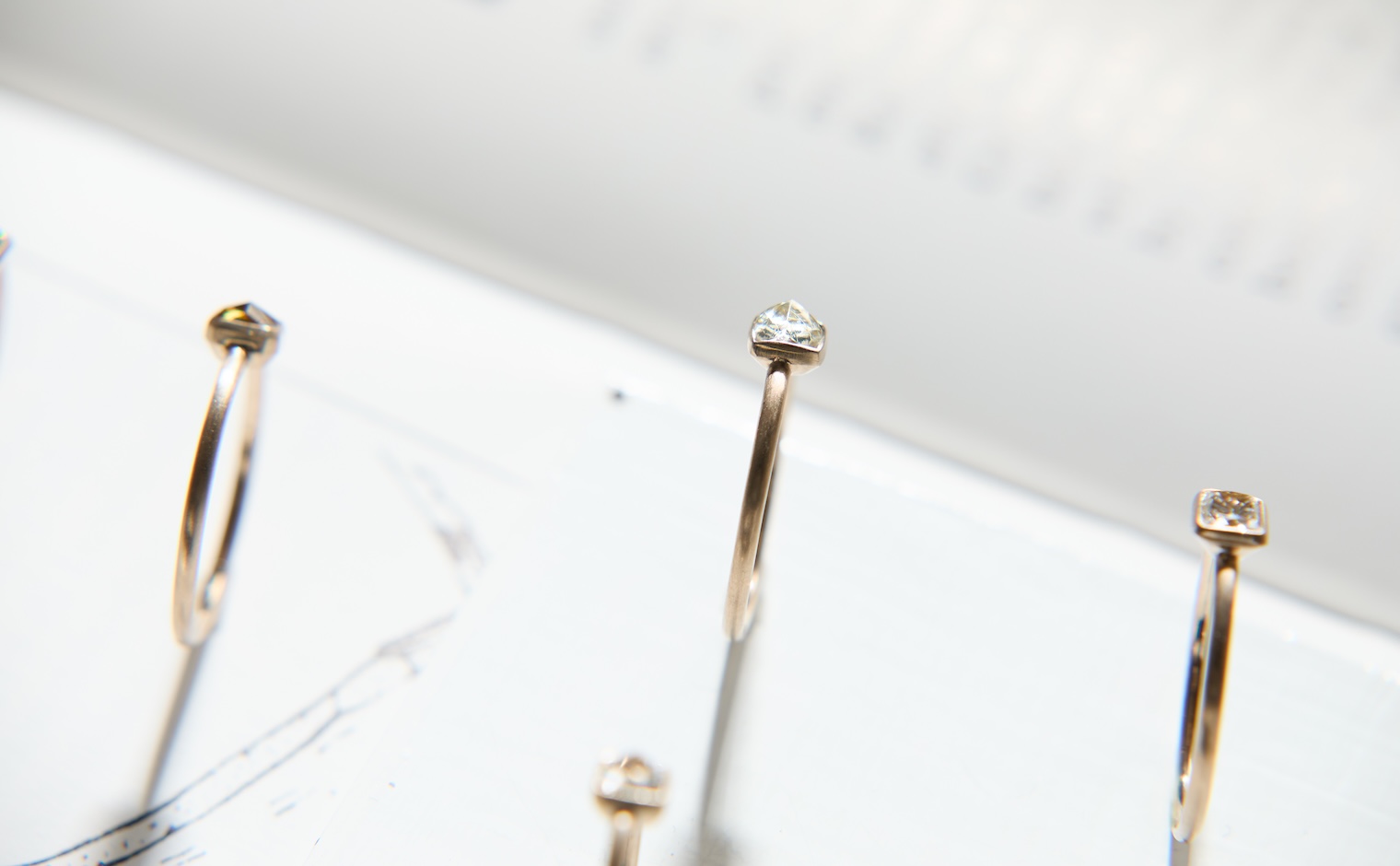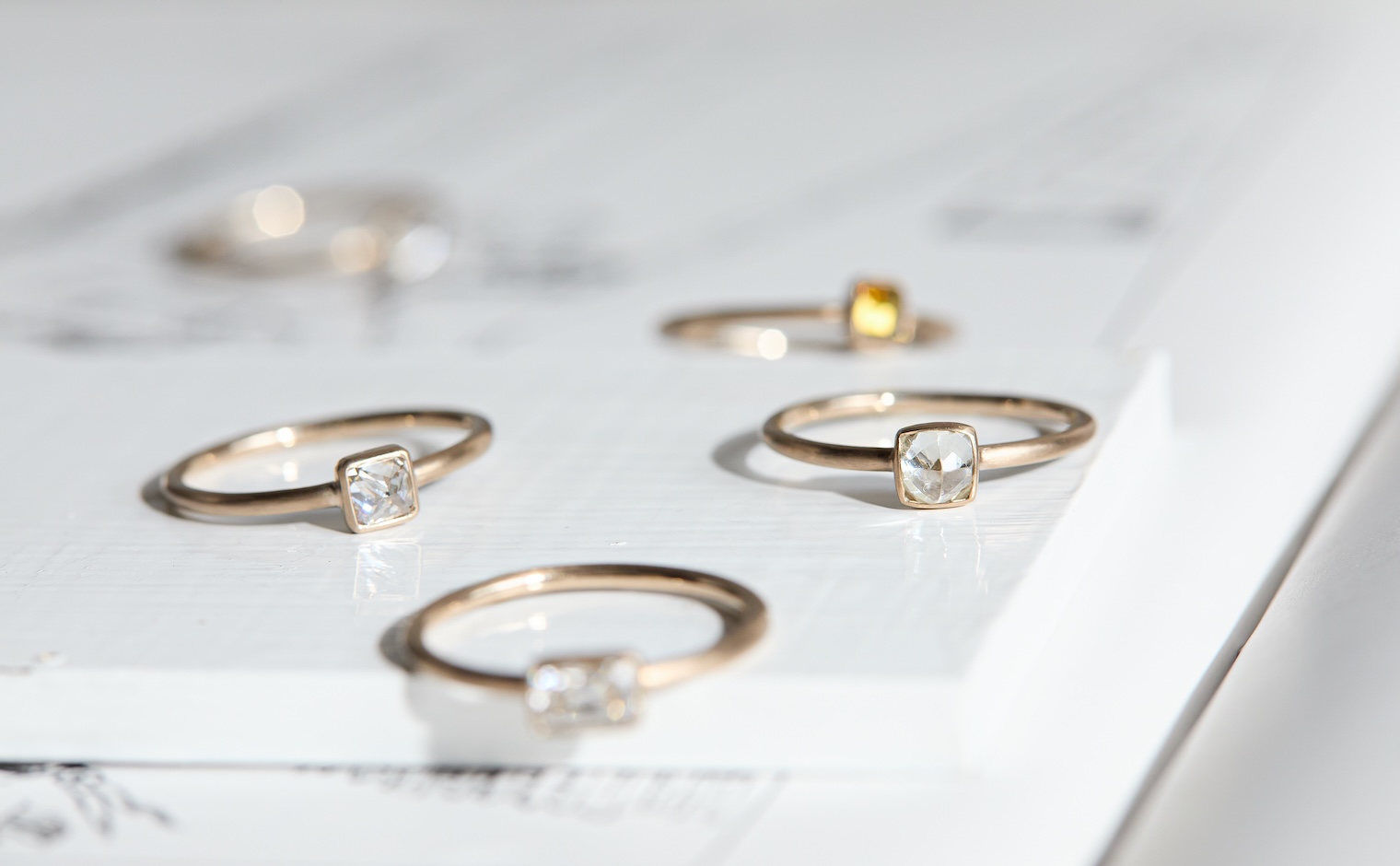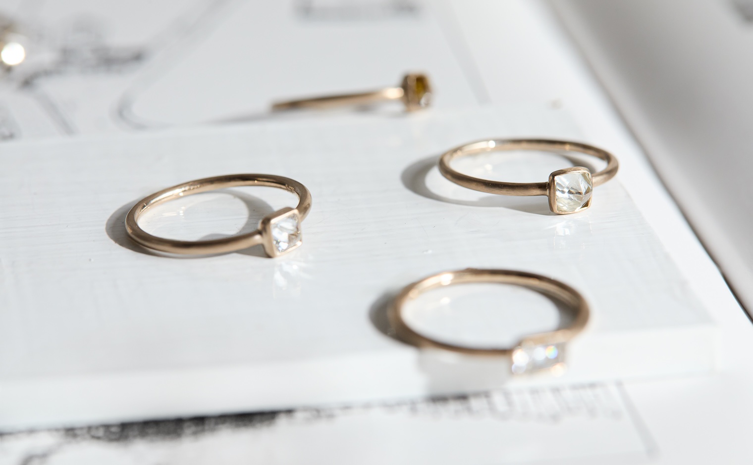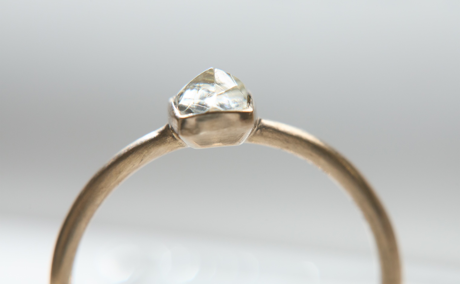 The Iceberg Ring–Snowfall features a meticulously hand-cut diamond, nestled within a cushion-shaped bezel atop a hand-polished beige gold band. Its facets catch light like fresh snow under a pale winter sun, evoking a sense of serene beauty.