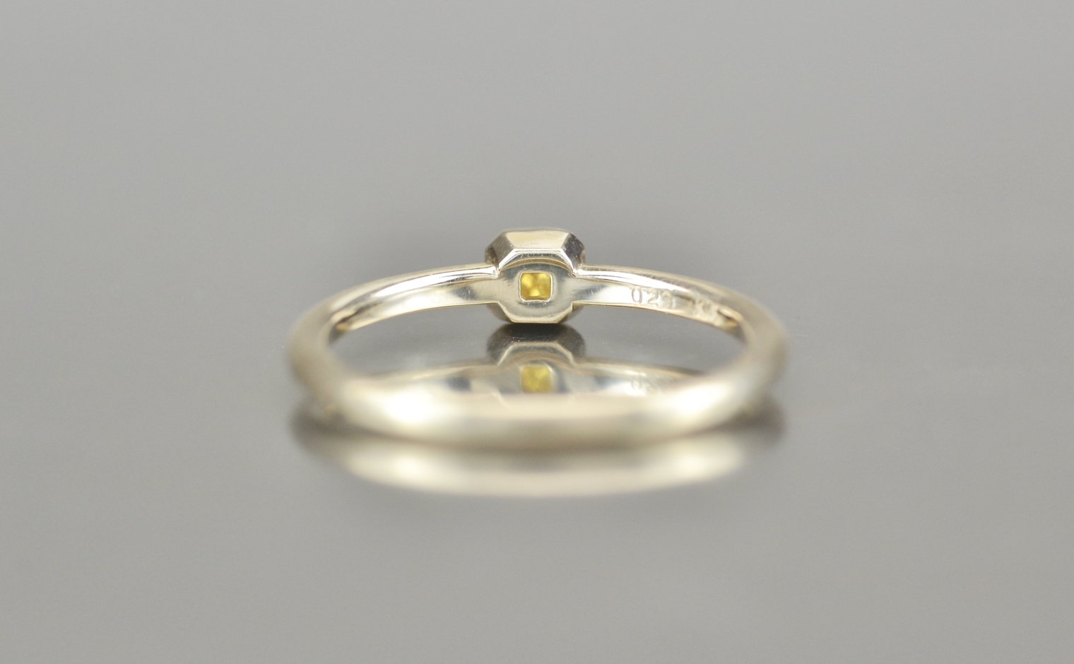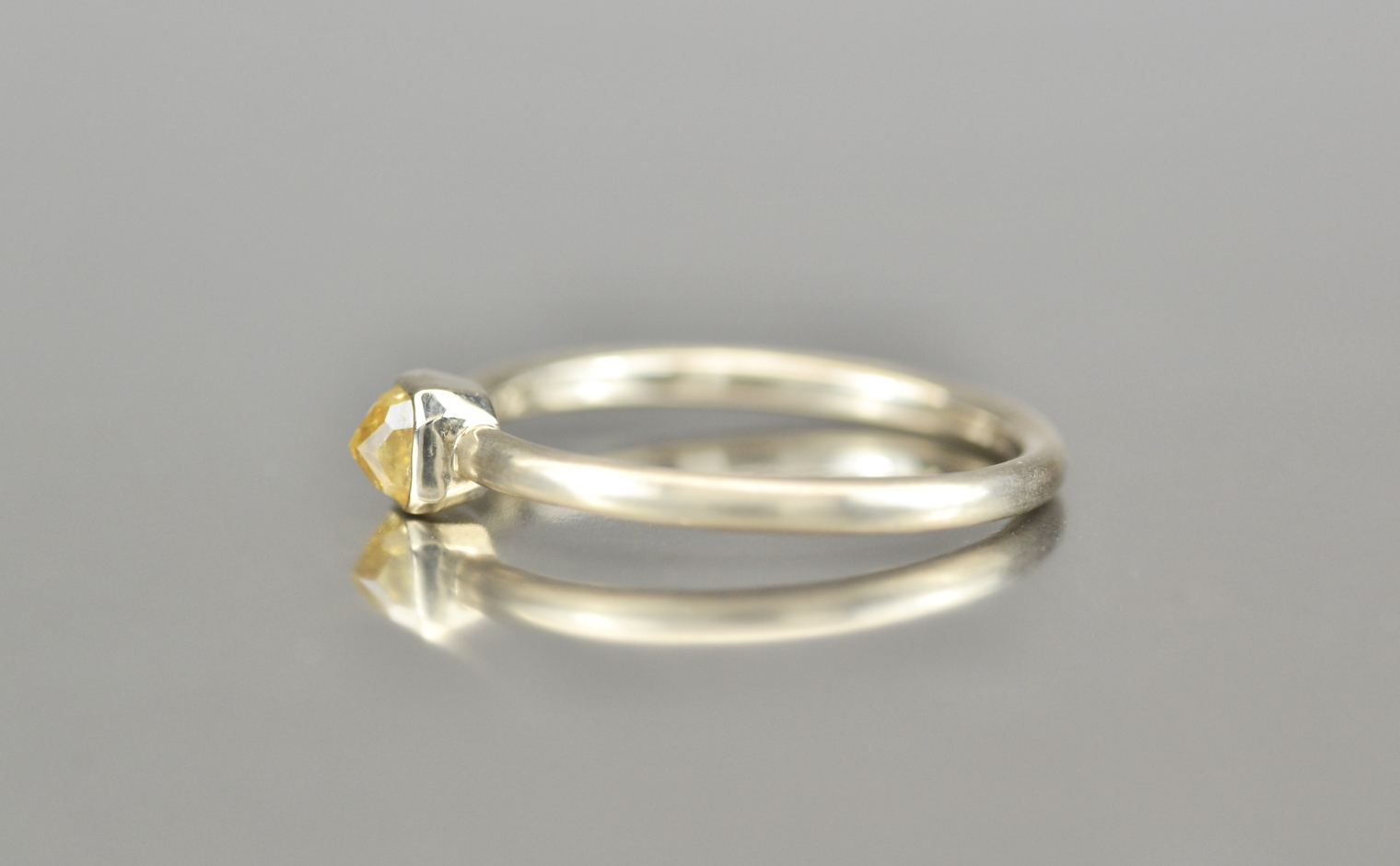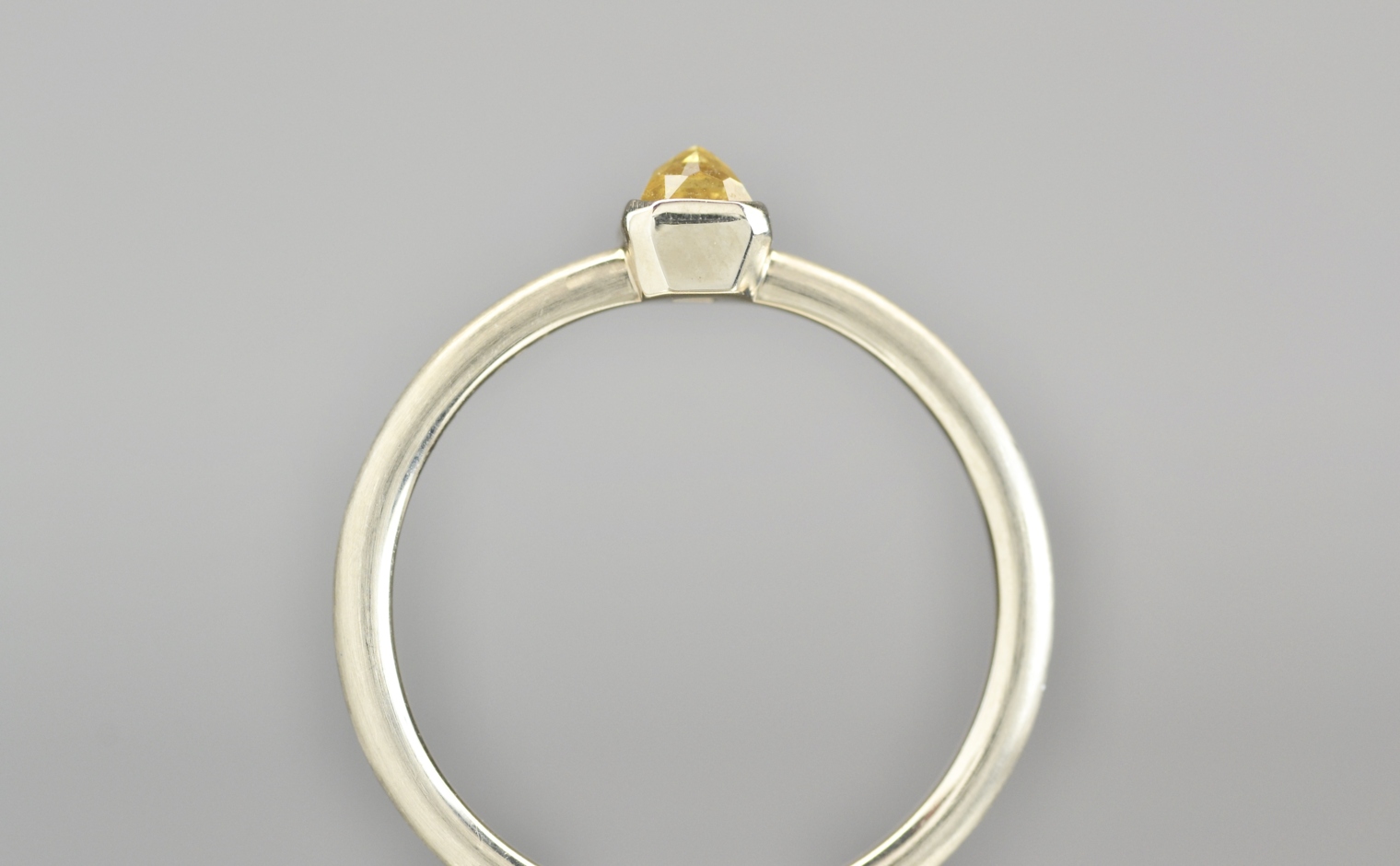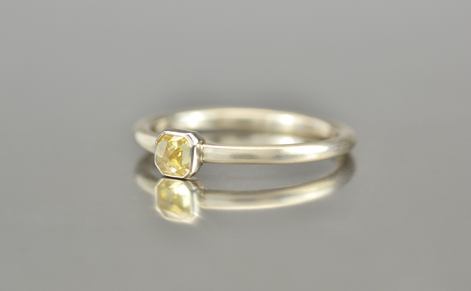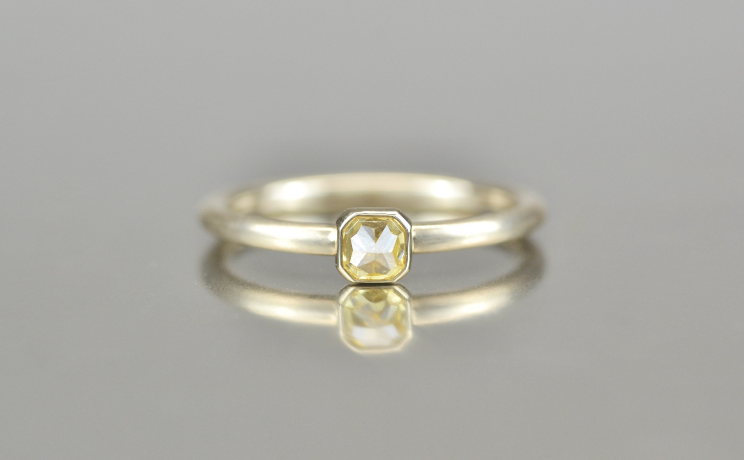 A ring designed to brighten even the gloomiest of days, this carefully selected yellow diamond sits like a ray of sunshine in a mounting of the smooth custom-blended gold bezel. Perfectly cut facets on each stone catch the light and bring radiance to a classic setting.