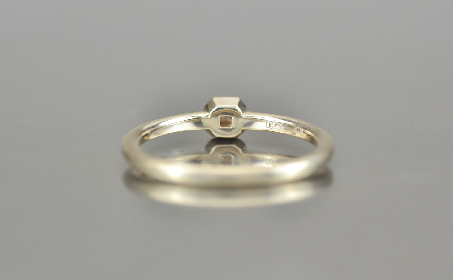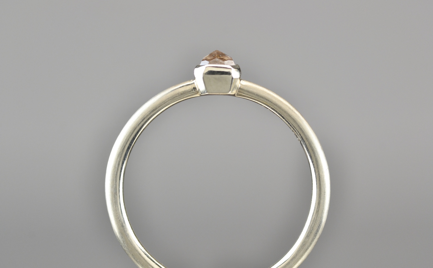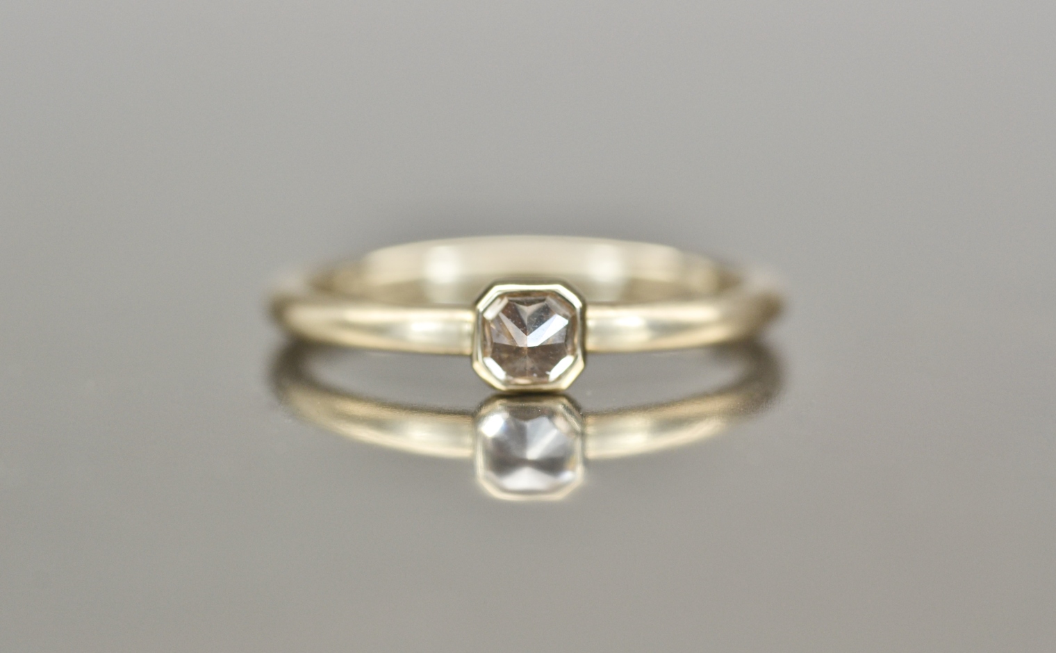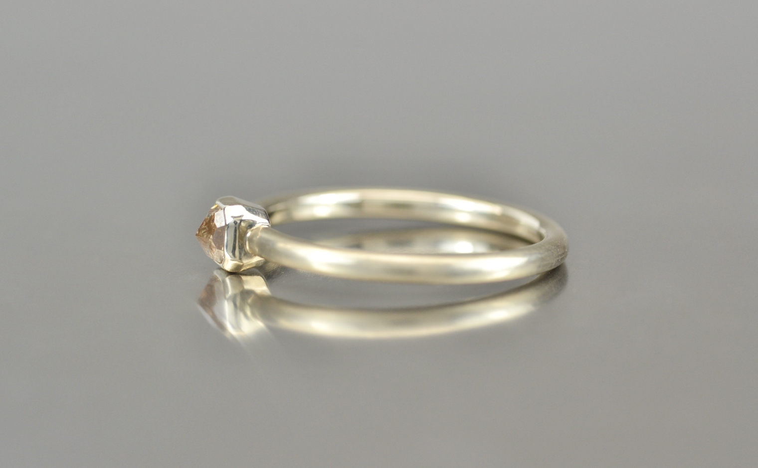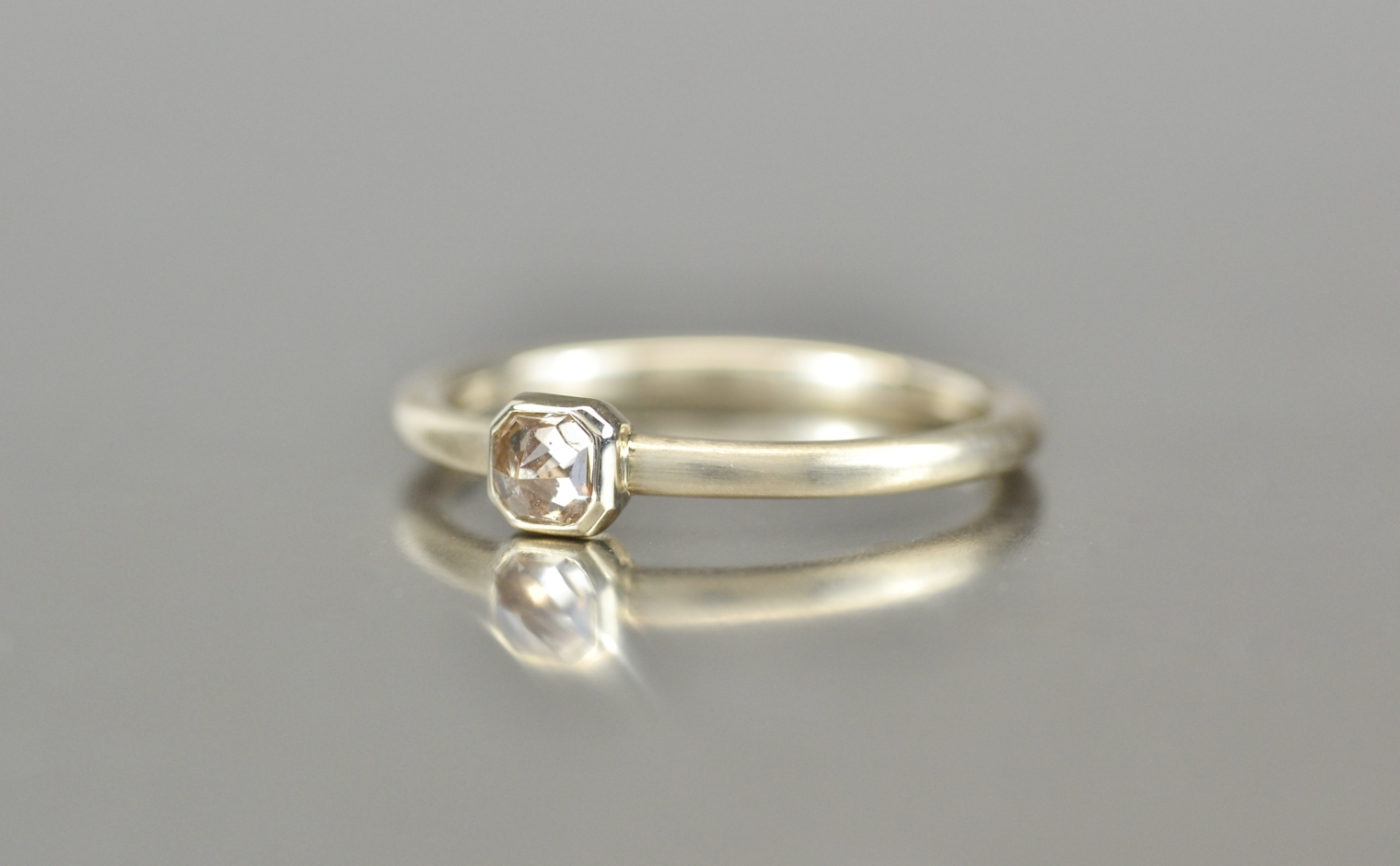 A carefully selected dusky diamond is set in gold precisely blended to create a feeling of romance and nostalgia. Set high in a handmade bezel, this ring is an absolute favorite for stacking with others.