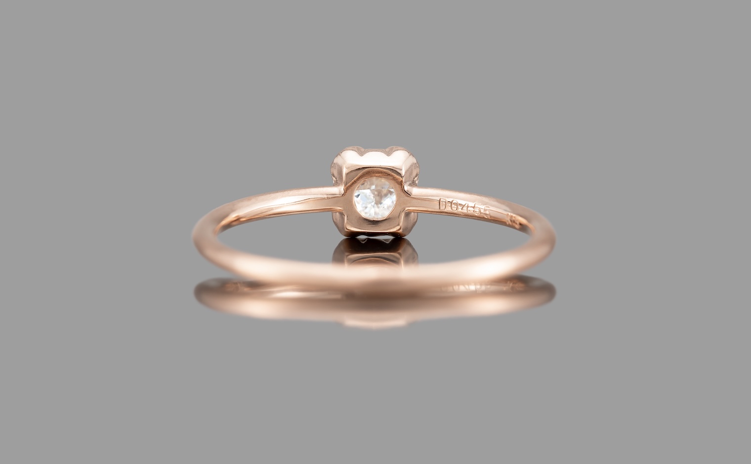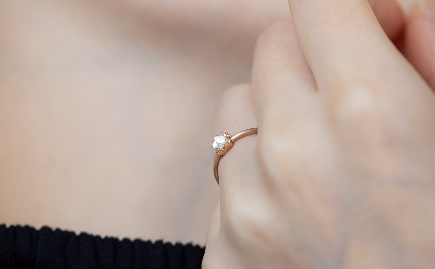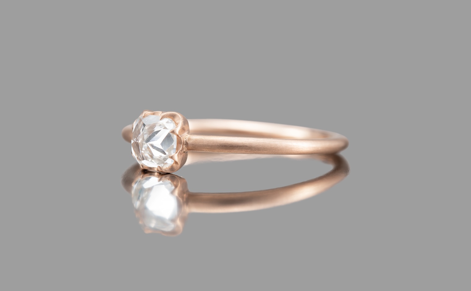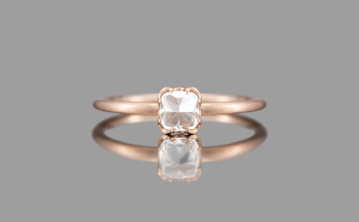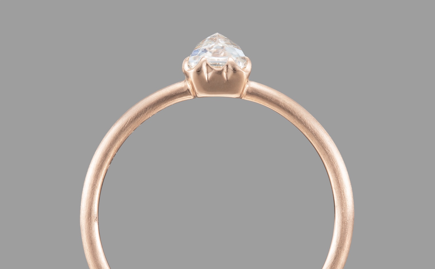 An Indefinite Kind of Love. The only sparkle needed to complete this work of art is an immaculate white diamond with its culet expertly placed upside on the center of a mid-polished slim rose gold band, depicting a breathtaking glistening glacial peak against a shimmering rosy golden sky.