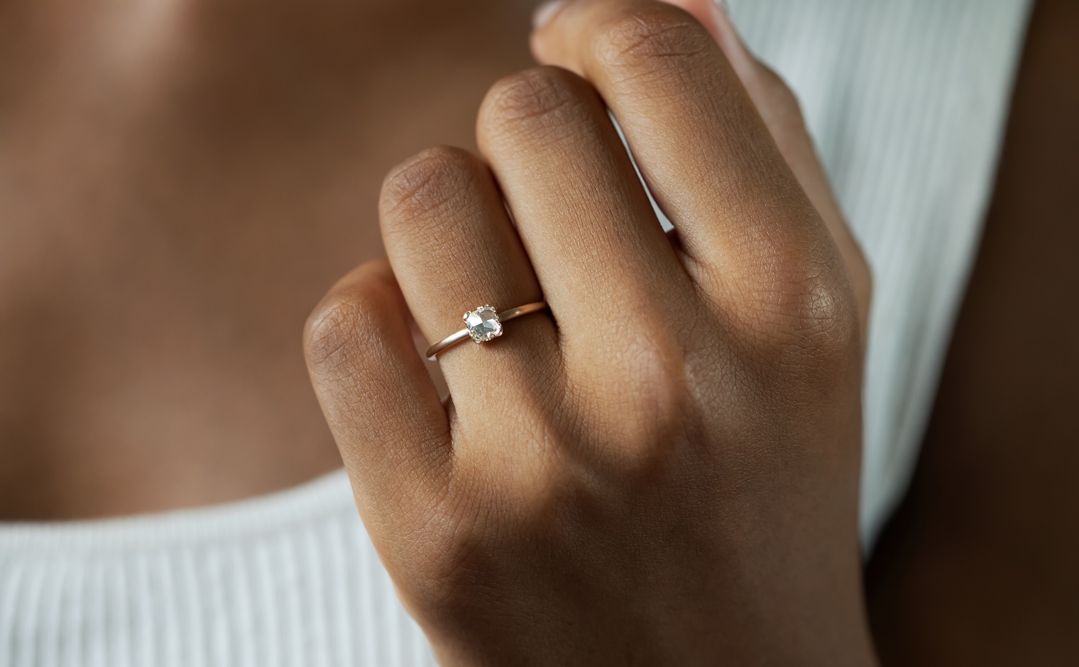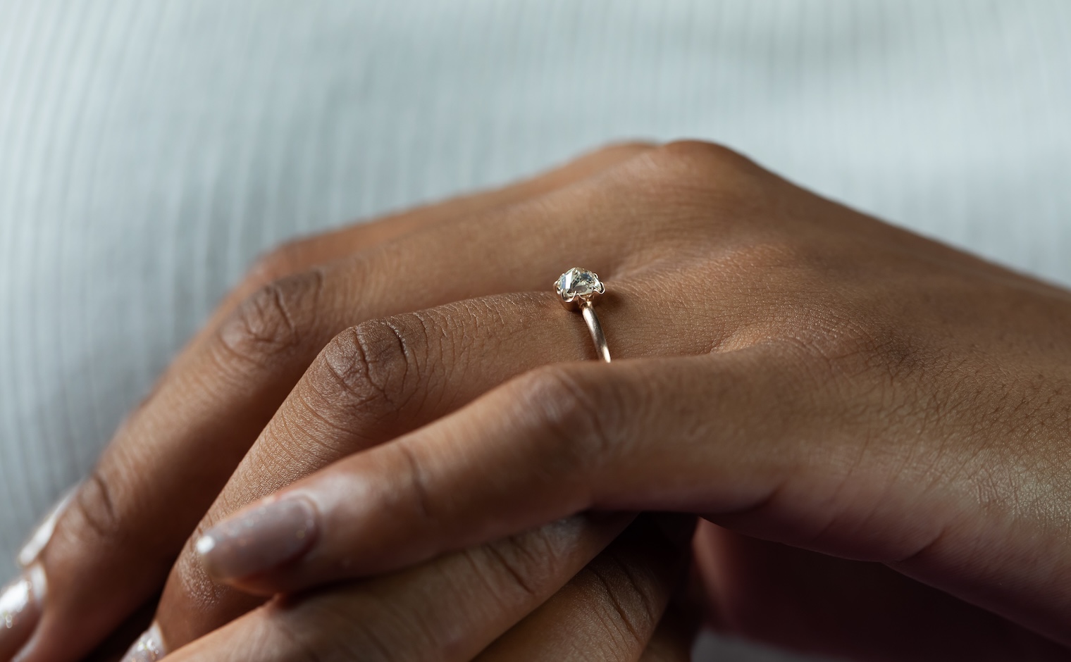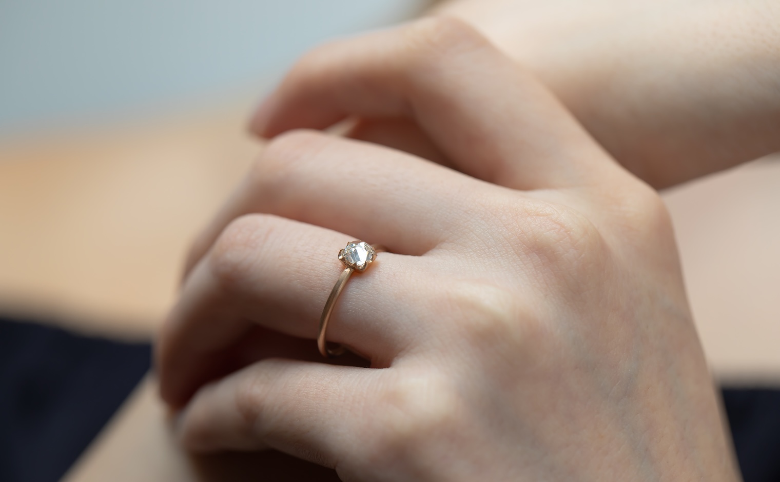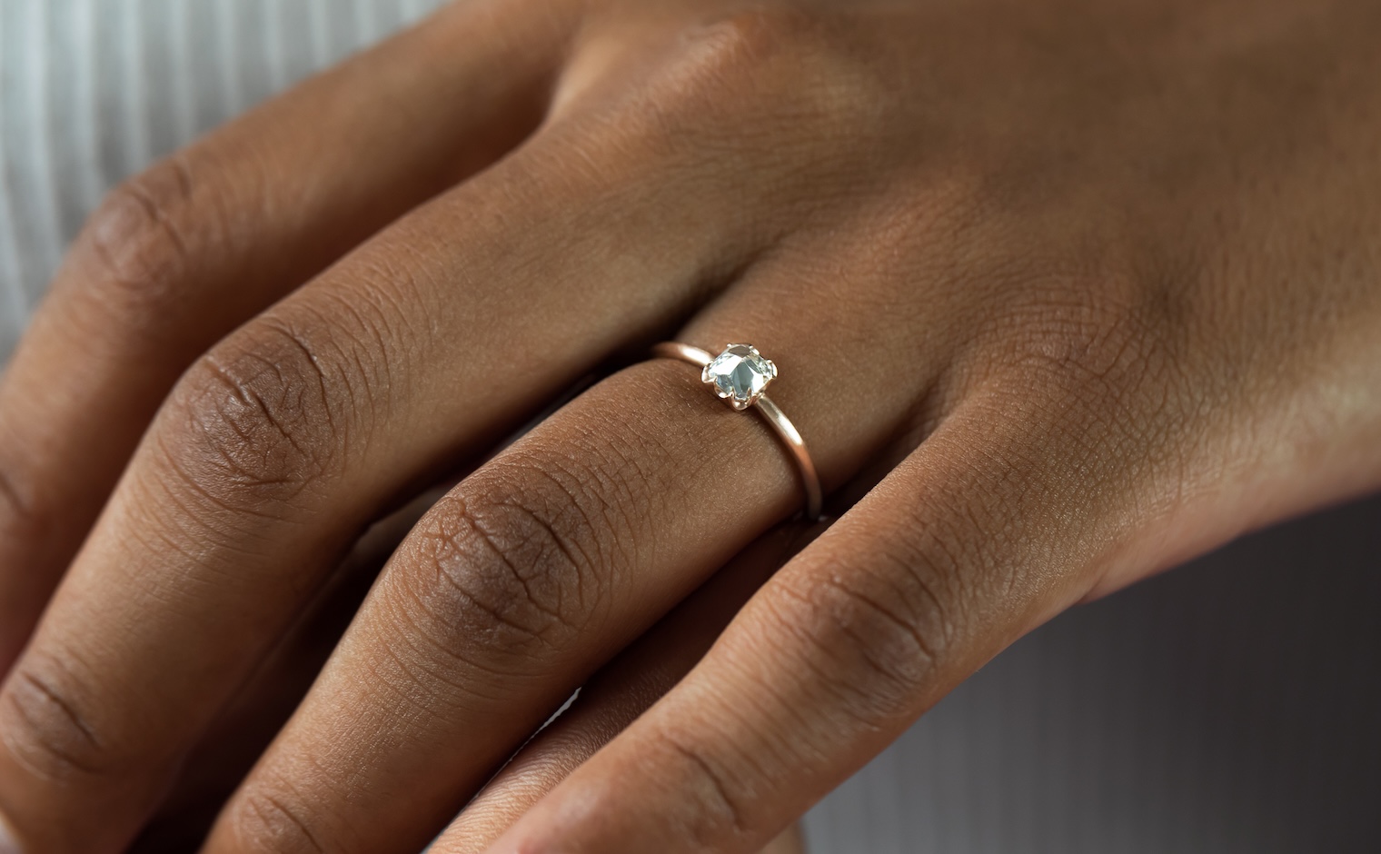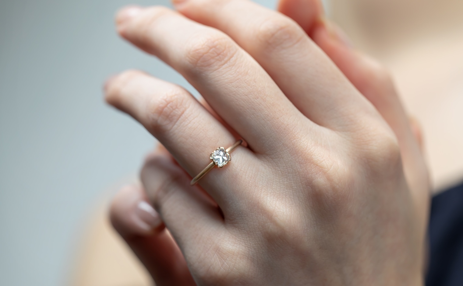 An Indefinite Kind of Love. The only sparkle needed to complete this work of art is an immaculate white diamond with its culet expertly placed upside on the center of a mid-polished slim rose gold band, depicting a breathtaking glistening glacial peak against a shimmering rosy golden sky.