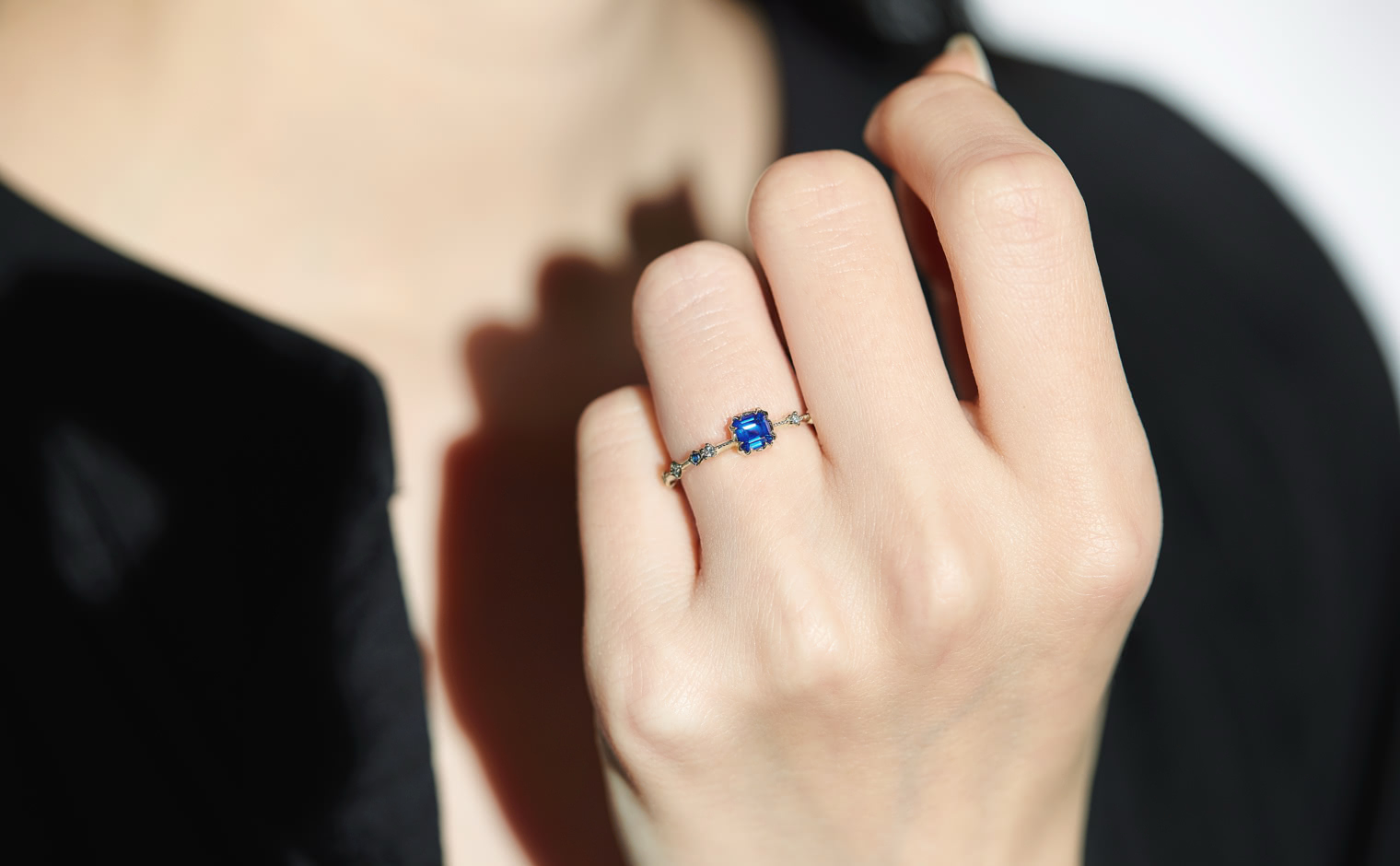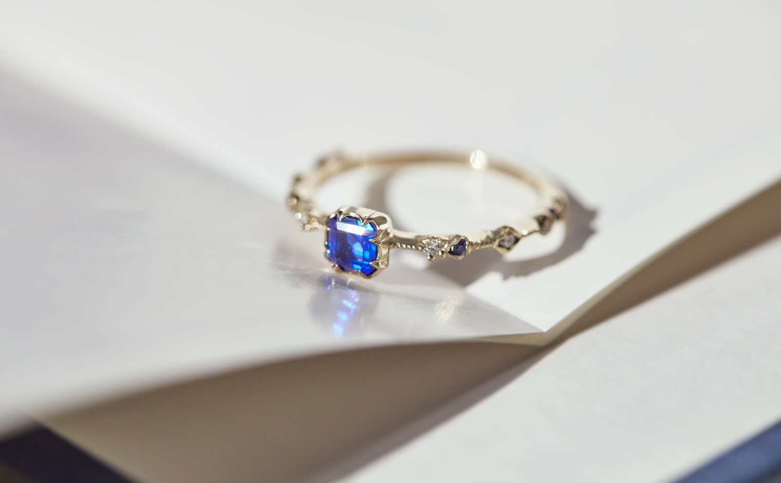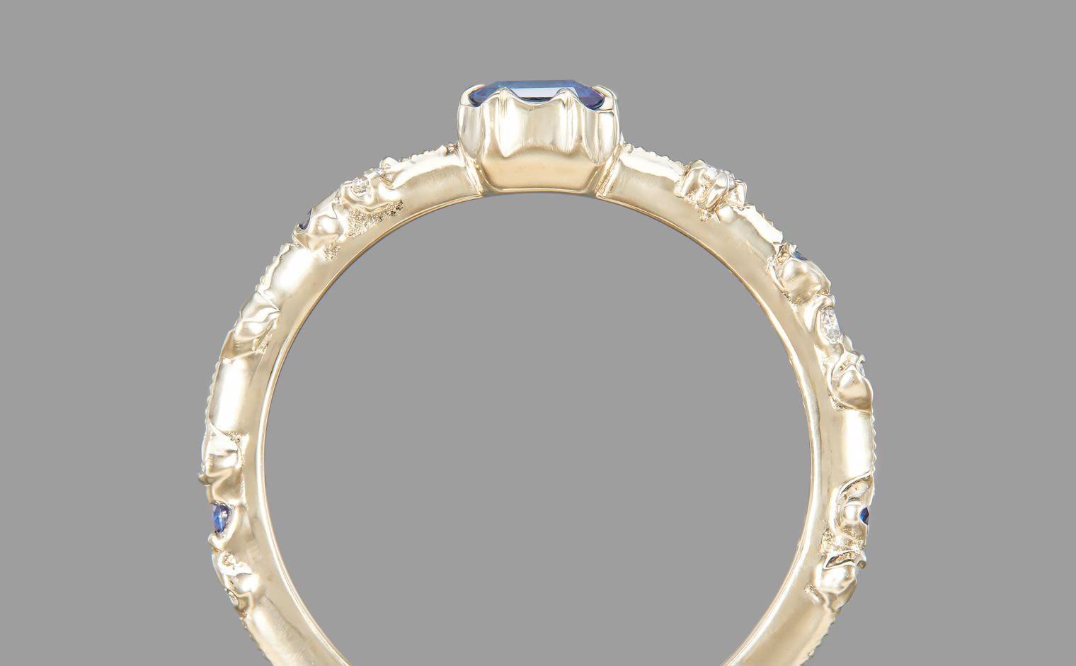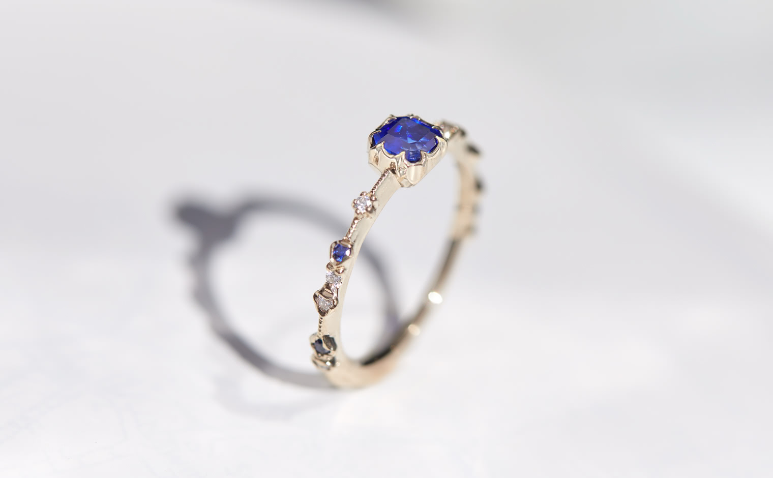 Sapphires and diamonds in gentle brilliance, their radiance flowing with subtle allure. The Paeonia Ring–Sapphire reflects delicate artistry, a lasting expression of elegance—refined, luminous, and timeless.