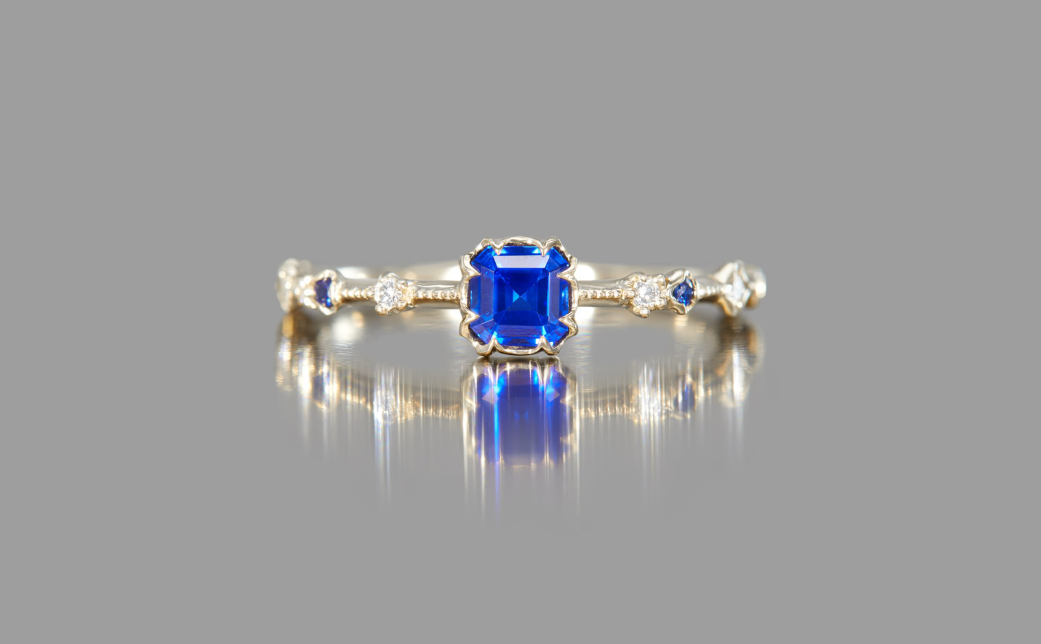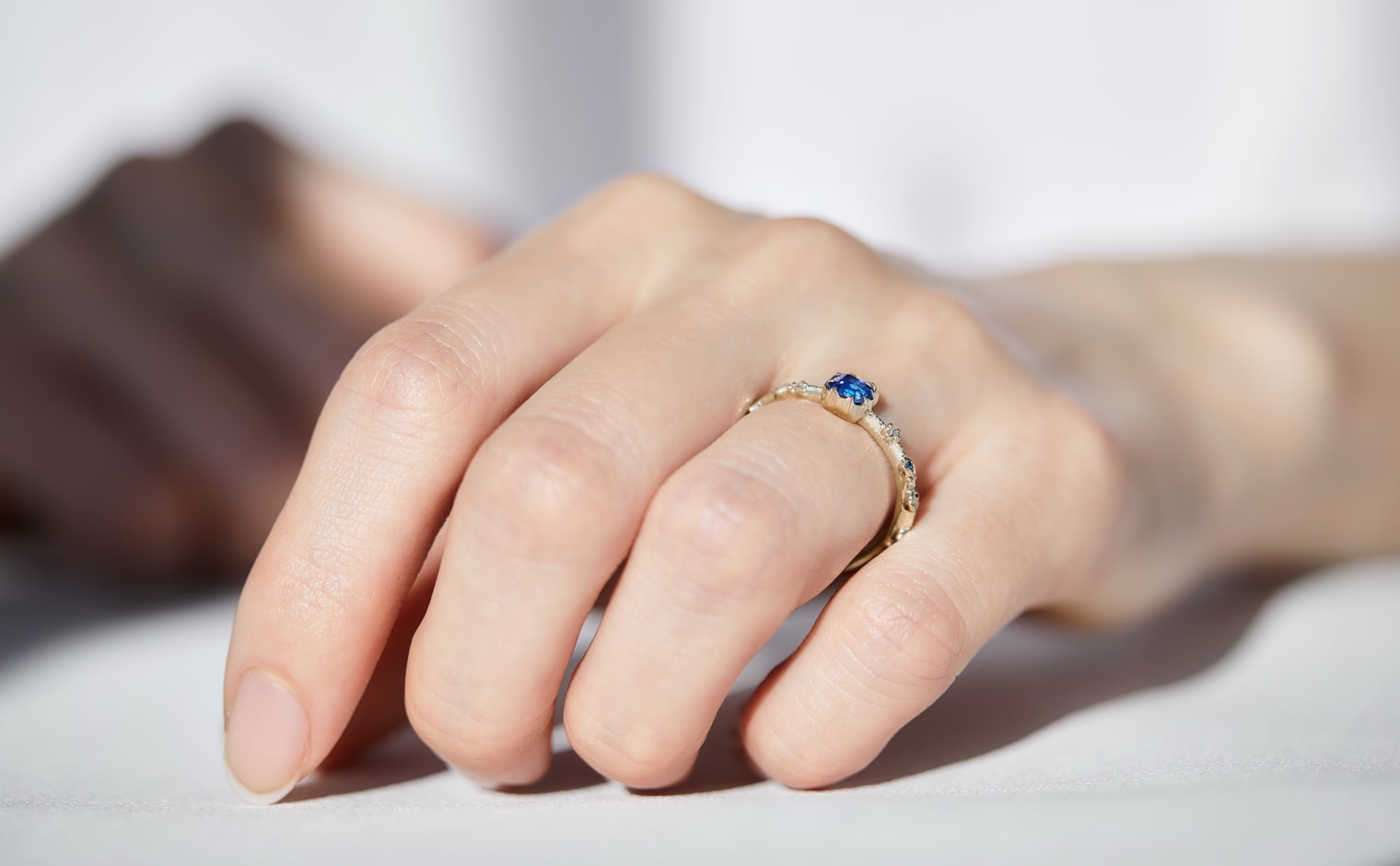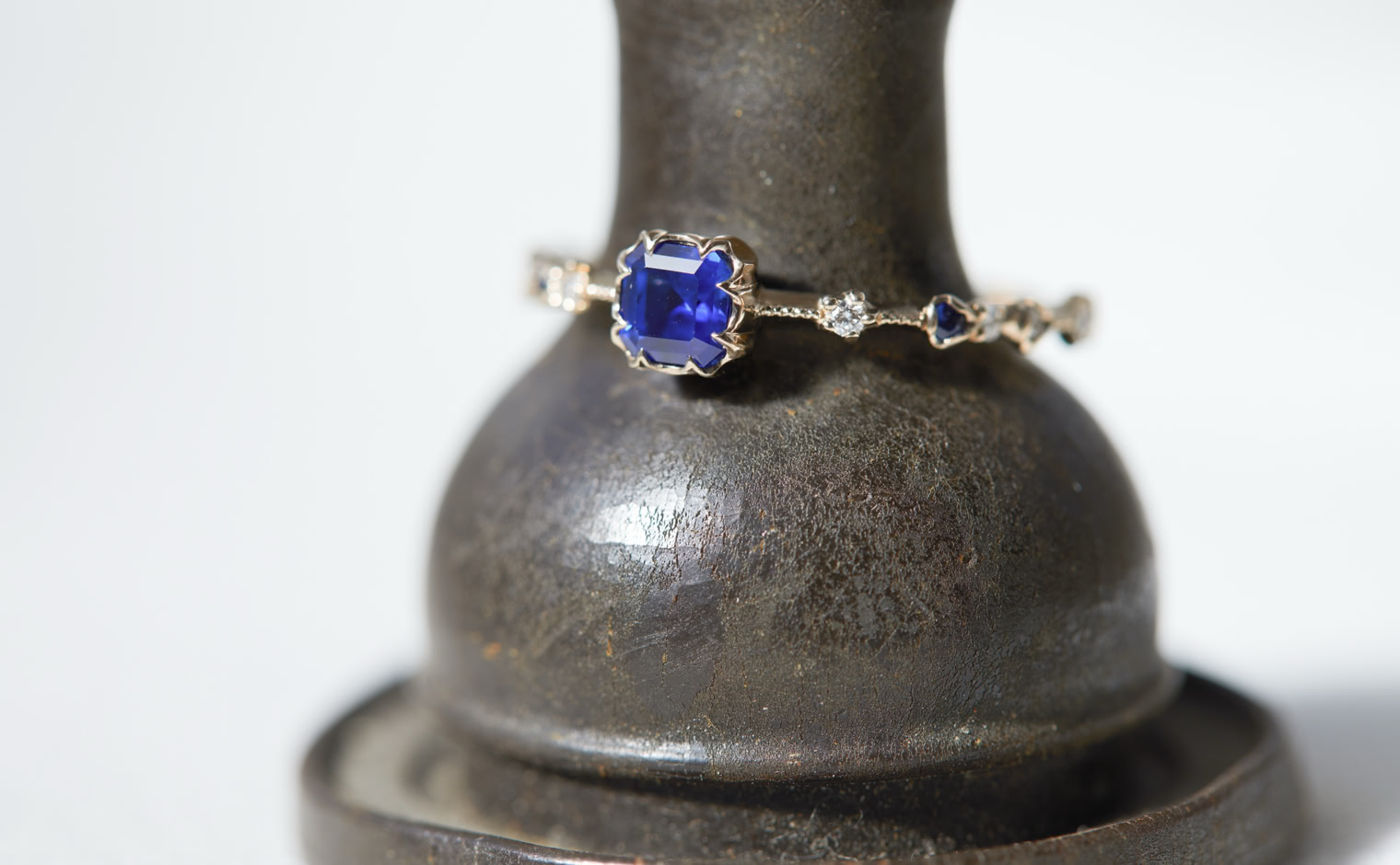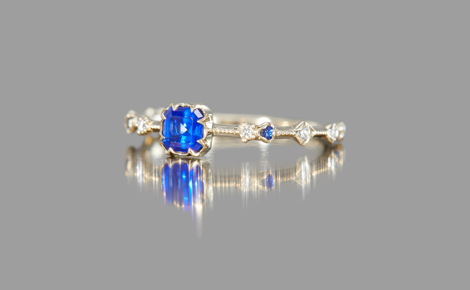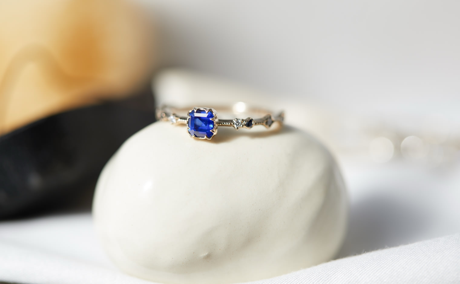 Sapphires and diamonds in gentle brilliance, their radiance flowing with subtle allure. The Paeonia Ring–Sapphire reflects delicate artistry, a lasting expression of elegance—refined, luminous, and timeless.