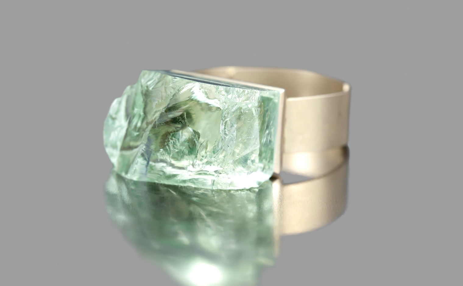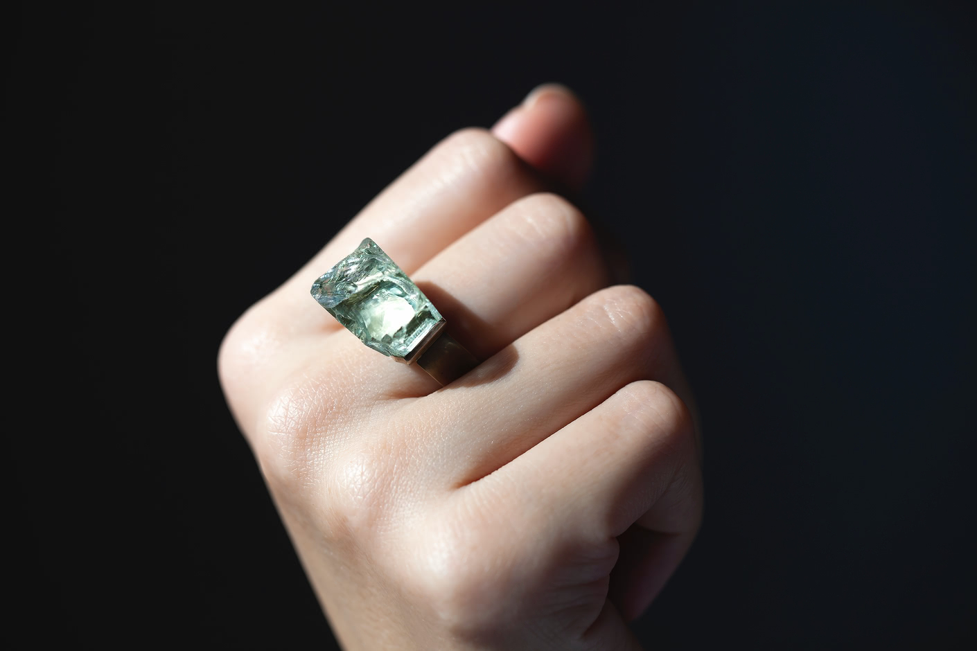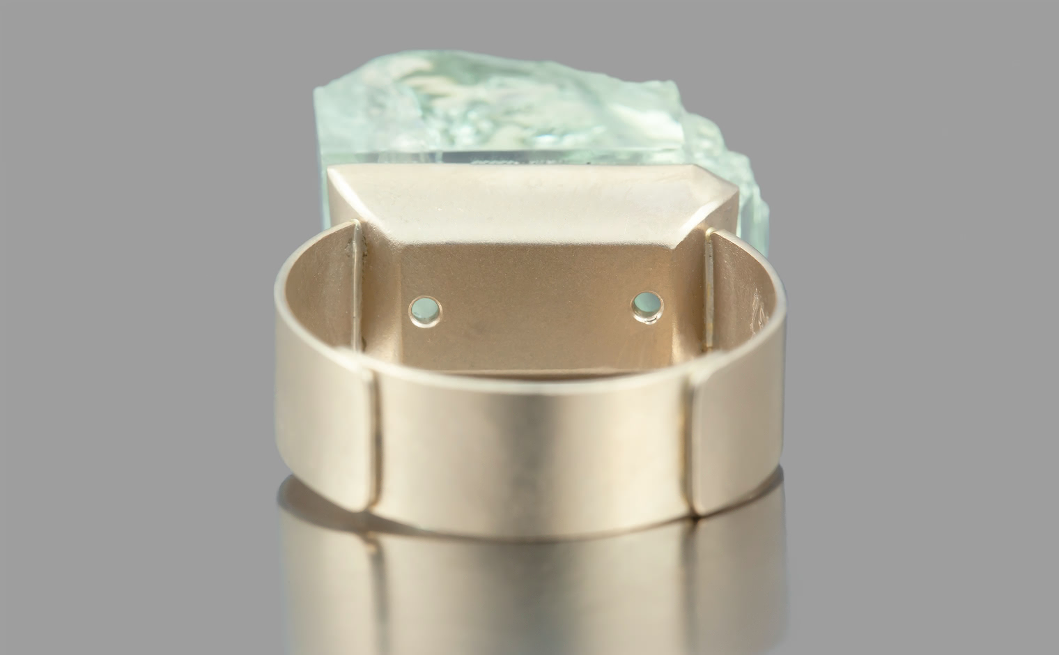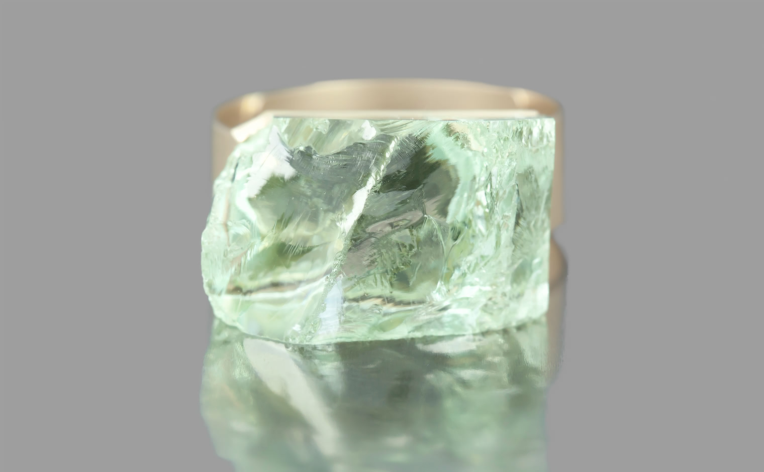 The natural beauty of this raw-edged green Quartz is balanced by the subtle color of kataoka custom blended gold in an innovative seamless setting to form the perfect statement piece. This one-of-a-kind ring is sure to be your new every-occasion-favorite.