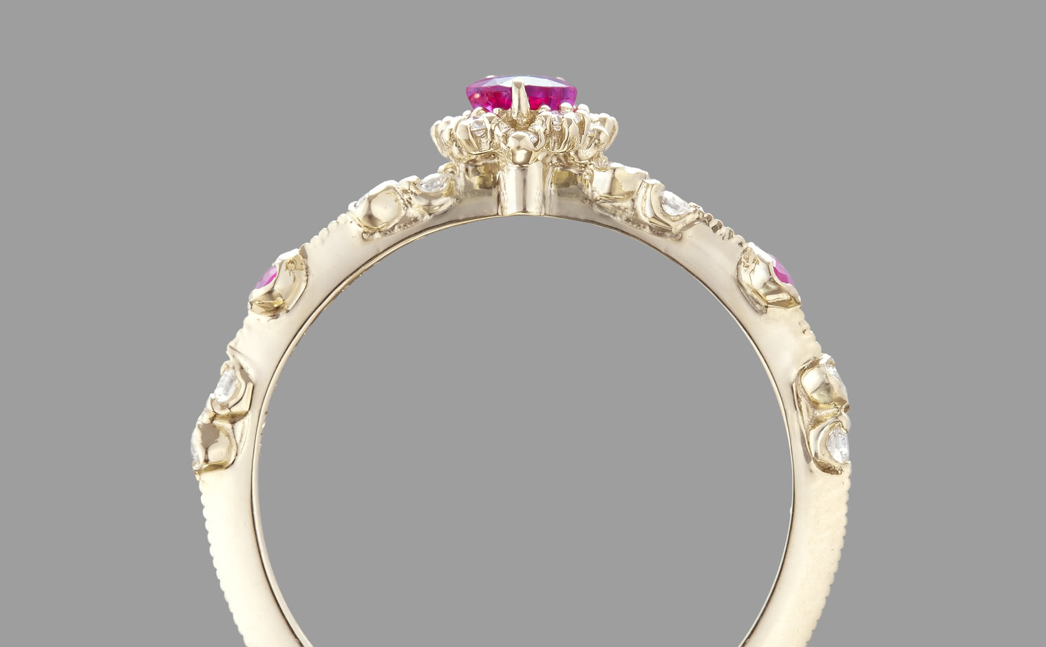 Featuring a deep-hued ruby that burns like fire while surrounded by brilliantly scintillating diamonds. Set in a meticulously hand-textured band of our custom-blended beige gold, this ring is sure to be a forever favorite.