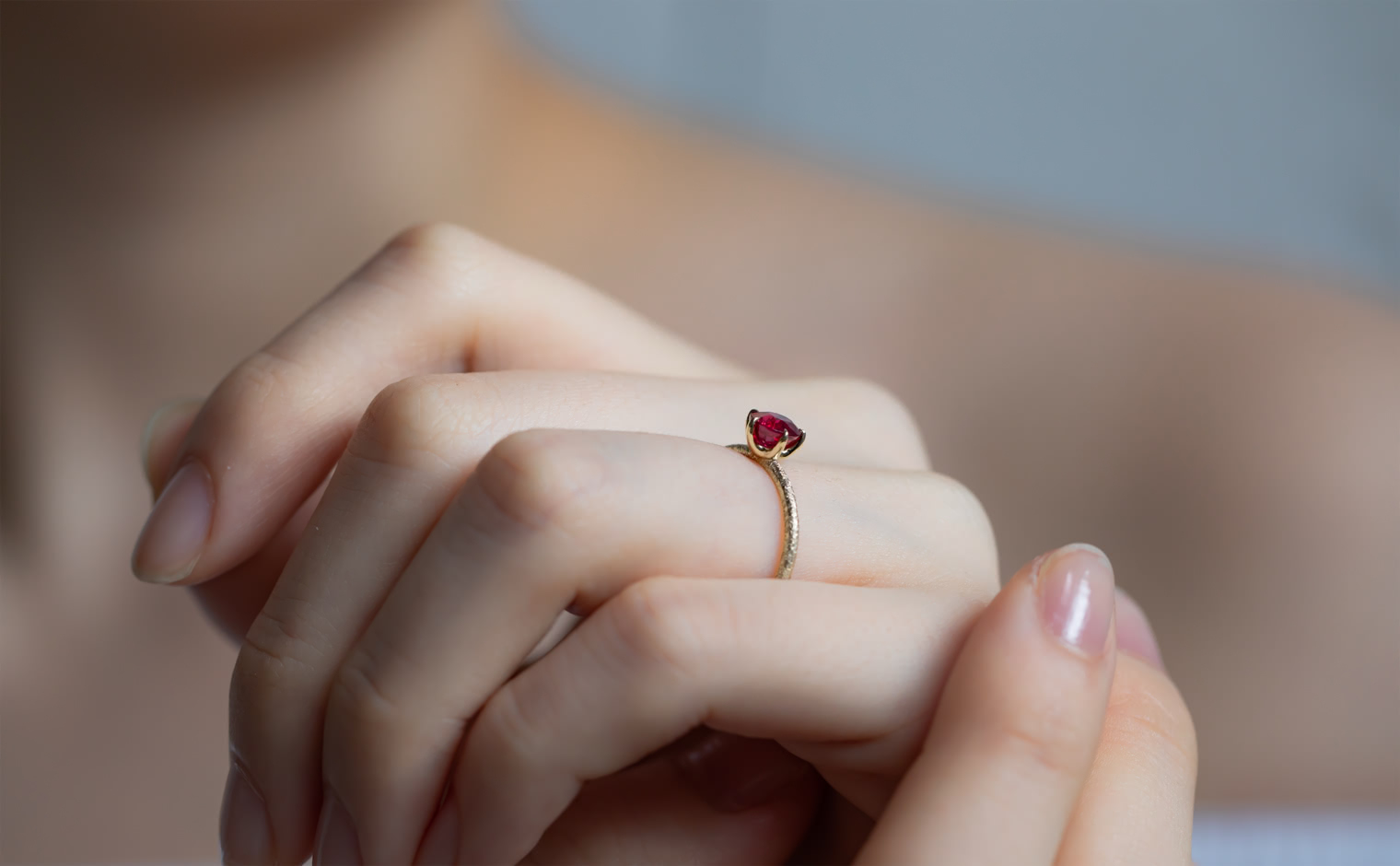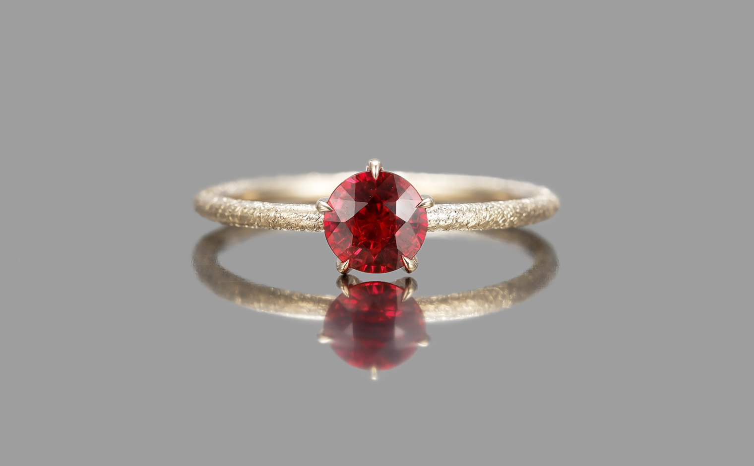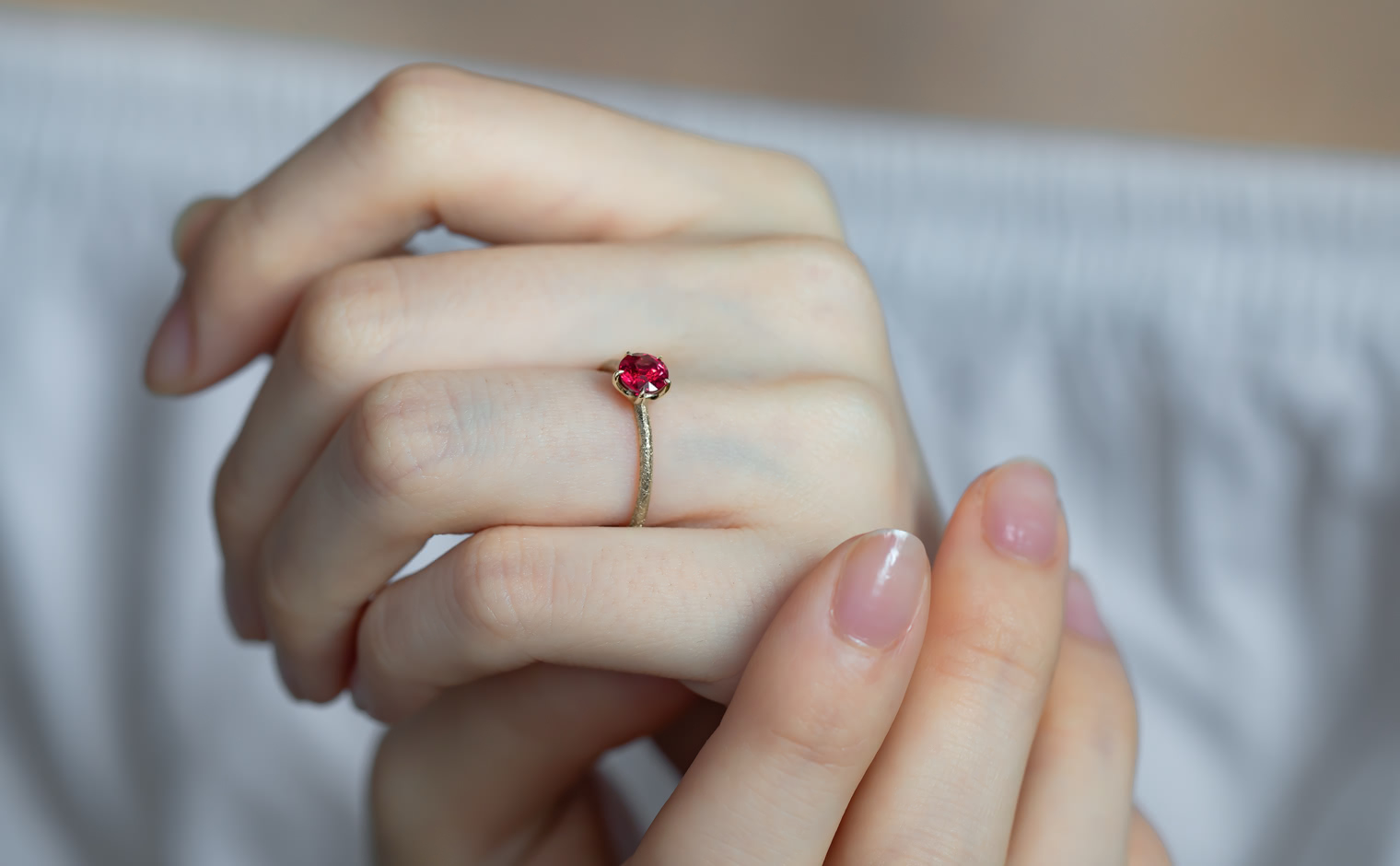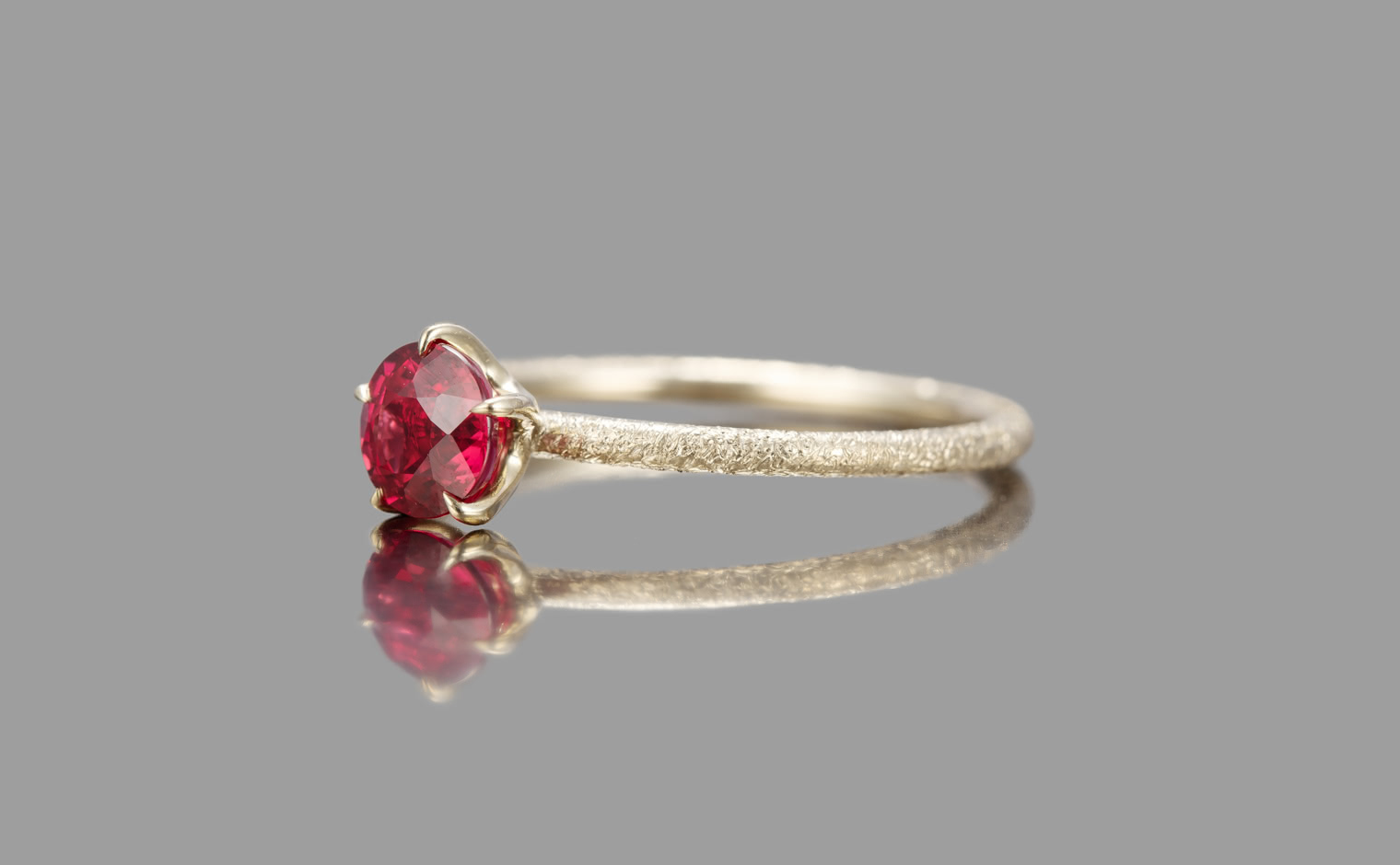 A ruby, its glow emanating with soft warmth. The Ruby Stardust Ring reflects enduring beauty, a timeless expression of grace and radiant charm.