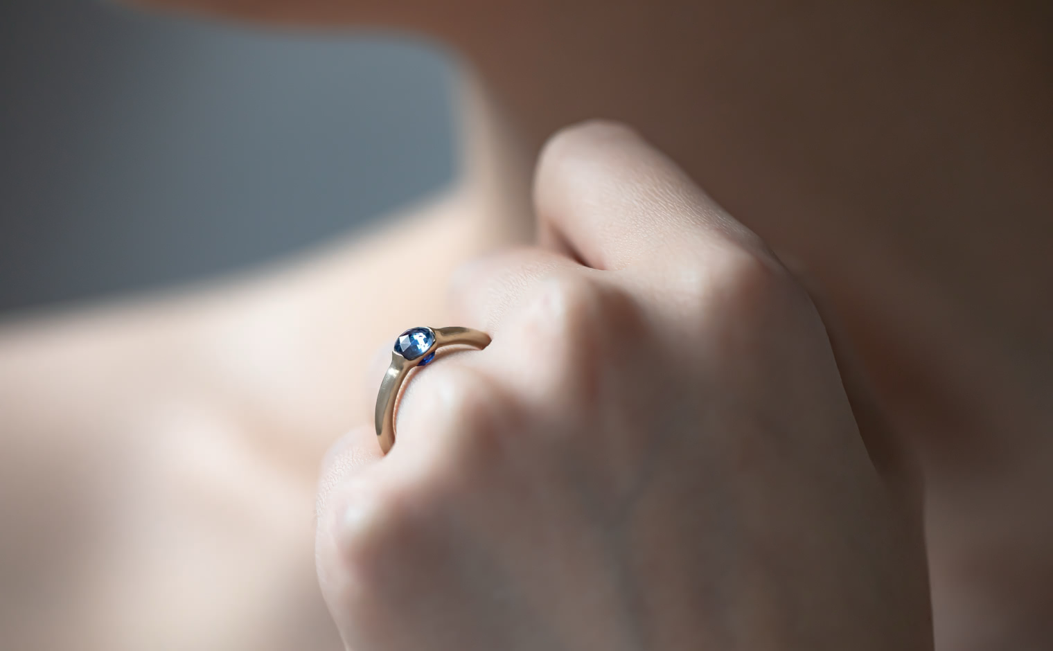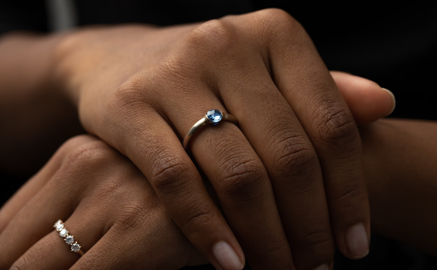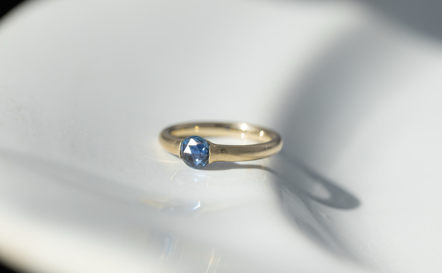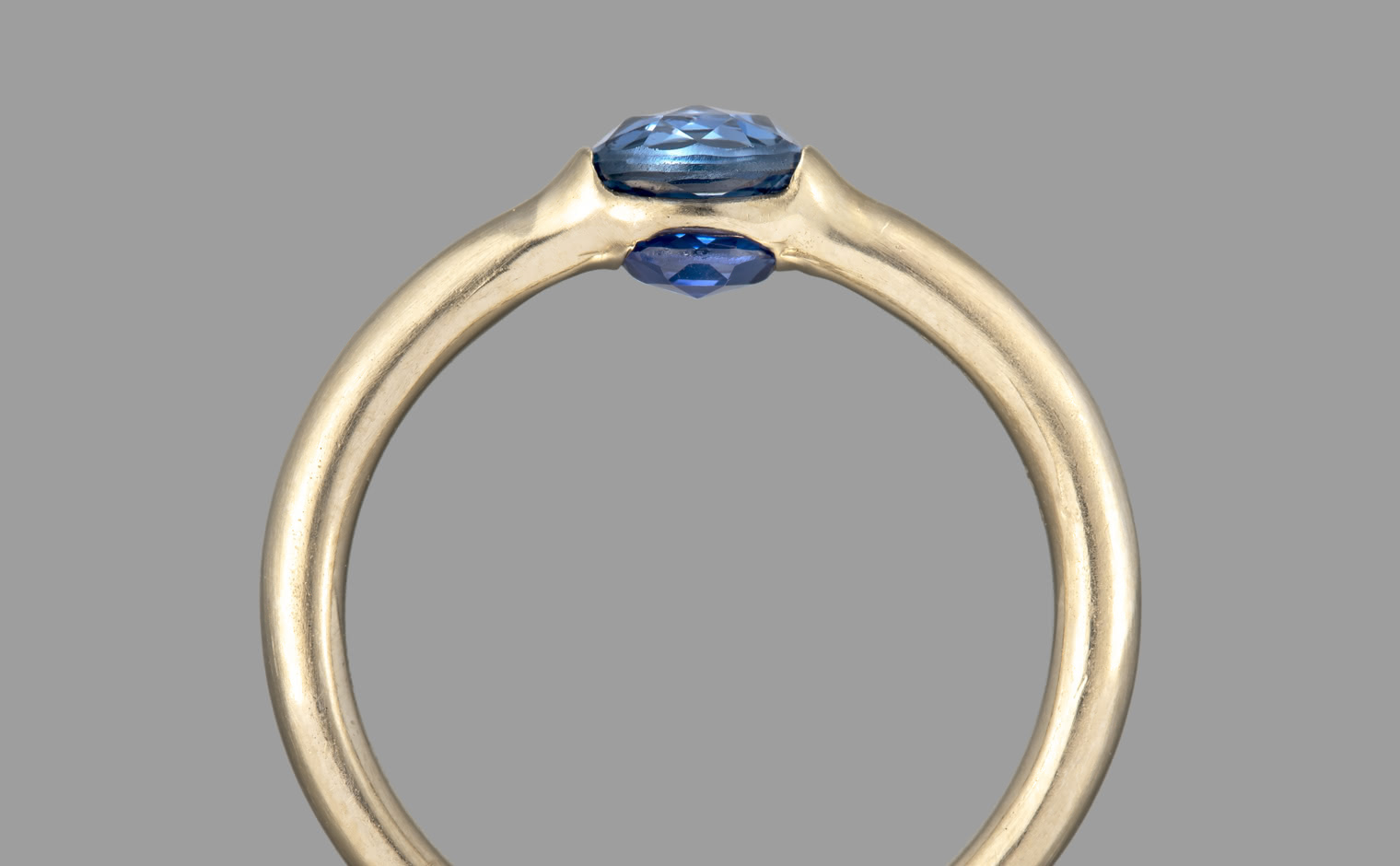Peak-a-blue. An exceptional creation of two glowing blue sapphires set back-to-back to create a subtle, playful illusion. With one breathtakingly rose-cut blue sapphire expertly set above the minimalistic, hand-polished custom-metal band and a smaller, delectable sapphire with just its culet peaking from the underside of the unique setting, the Sapphire Adamas Ring captures the true essence of understated elegance in its exposed and natural form.