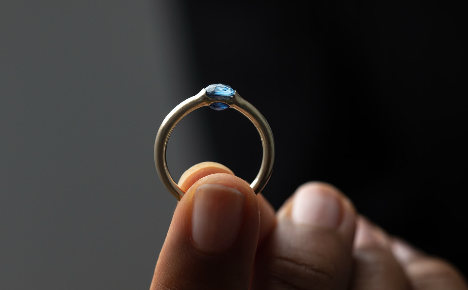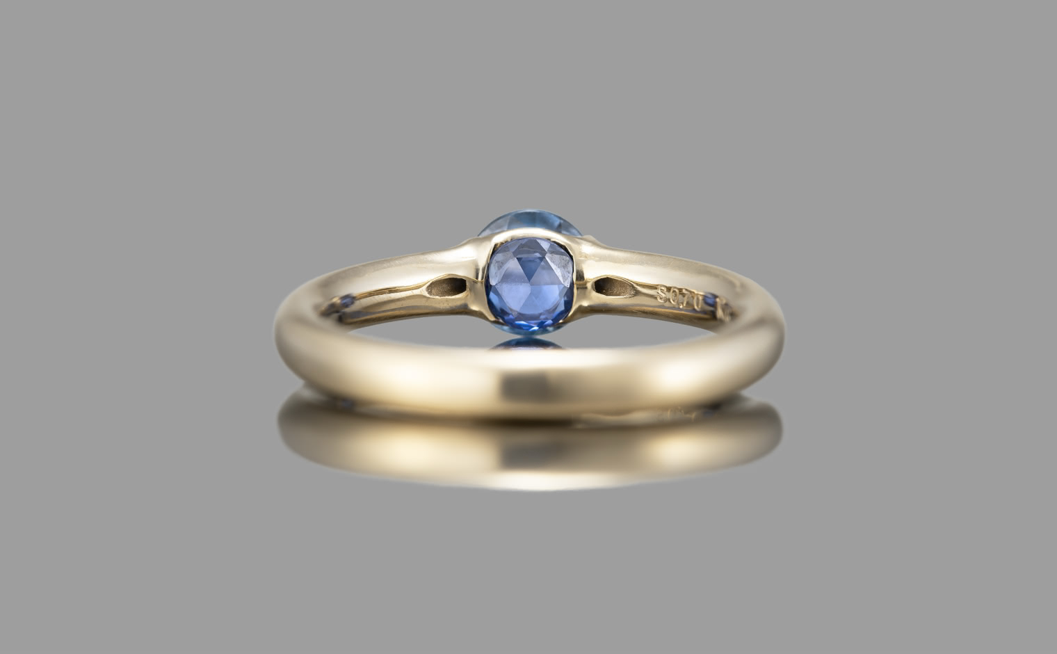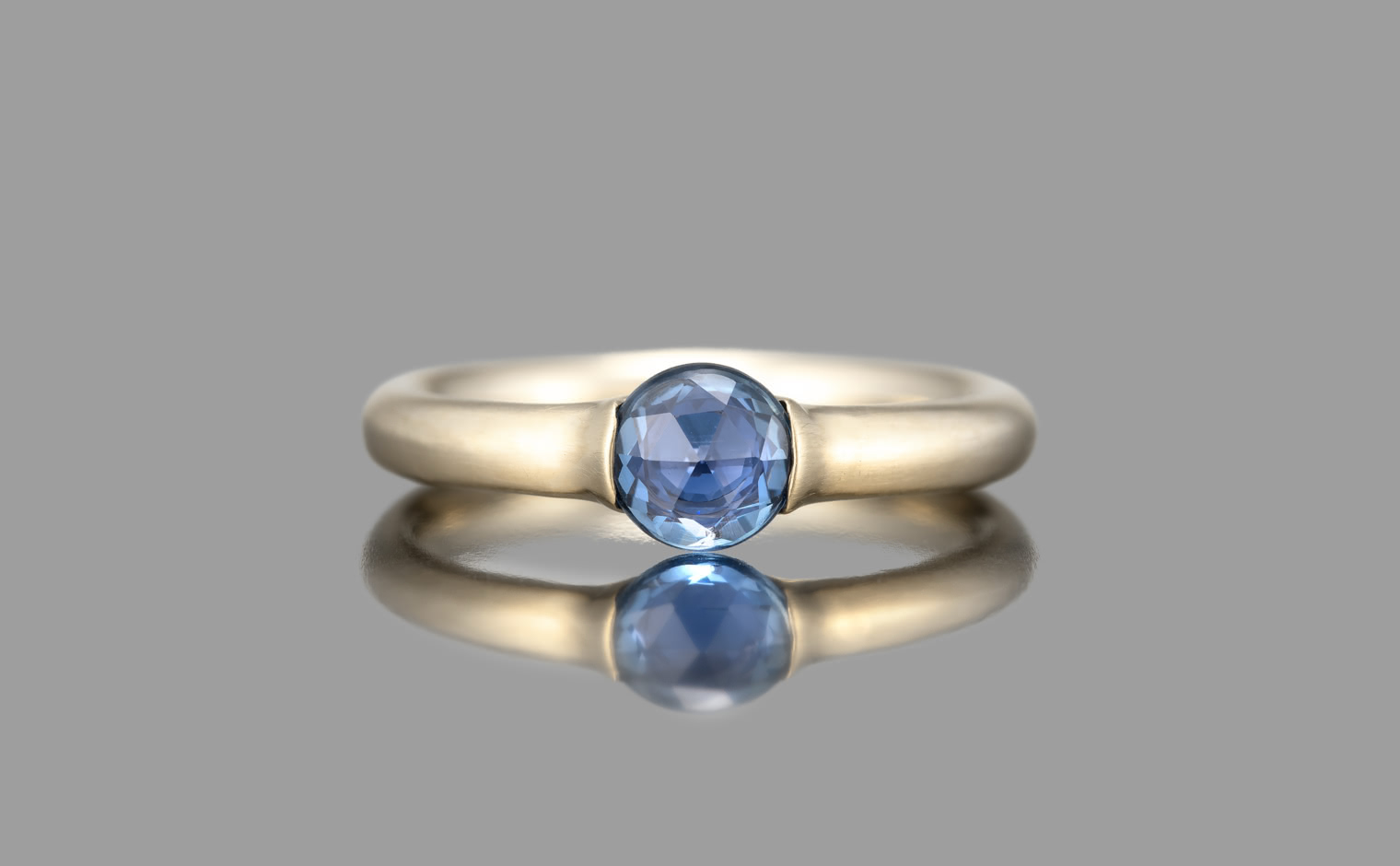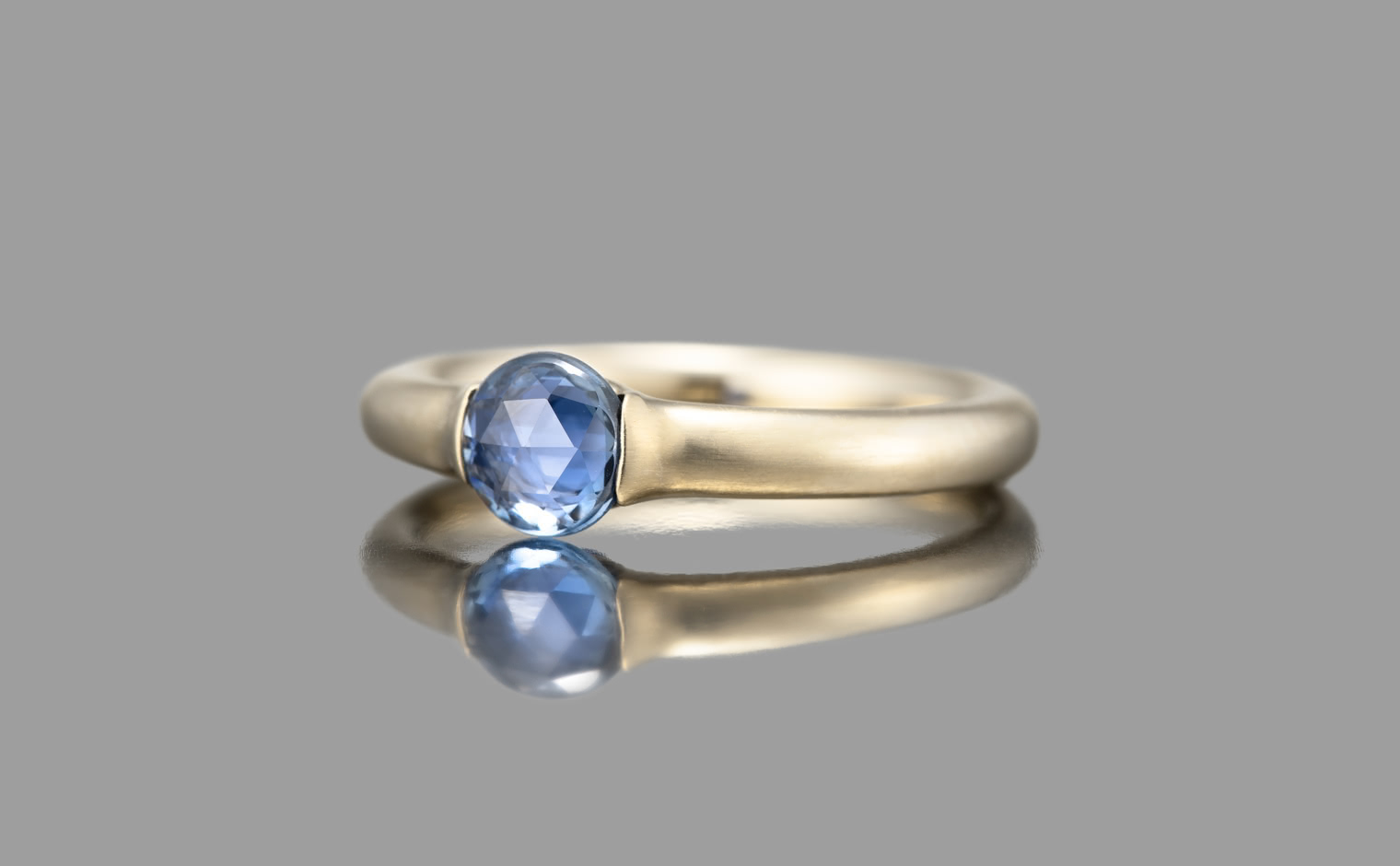 Peak-a-blue. An exceptional creation of two glowing blue sapphires set back-to-back to create a subtle, playful illusion. With one breathtakingly rose-cut blue sapphire expertly set above the minimalistic, hand-polished custom-metal band and a smaller, delectable sapphire with just its culet peaking from the underside of the unique setting, the Sapphire Adamas Ring captures the true essence of understated elegance in its exposed and natural form.