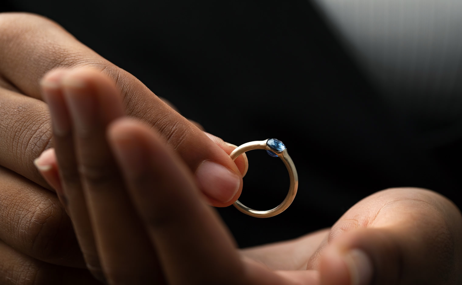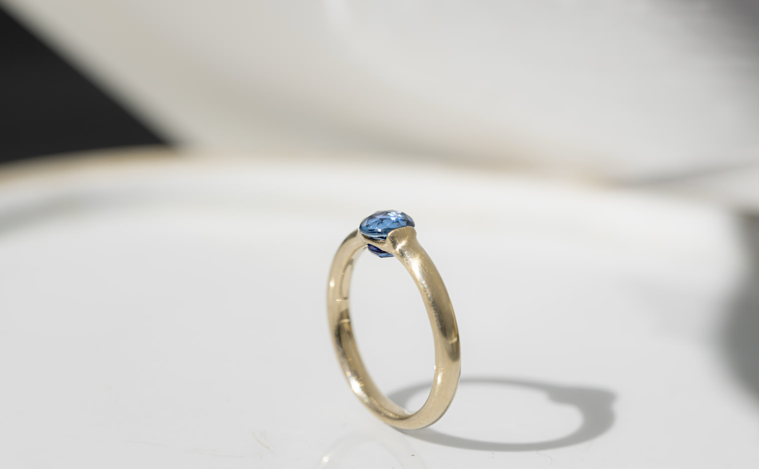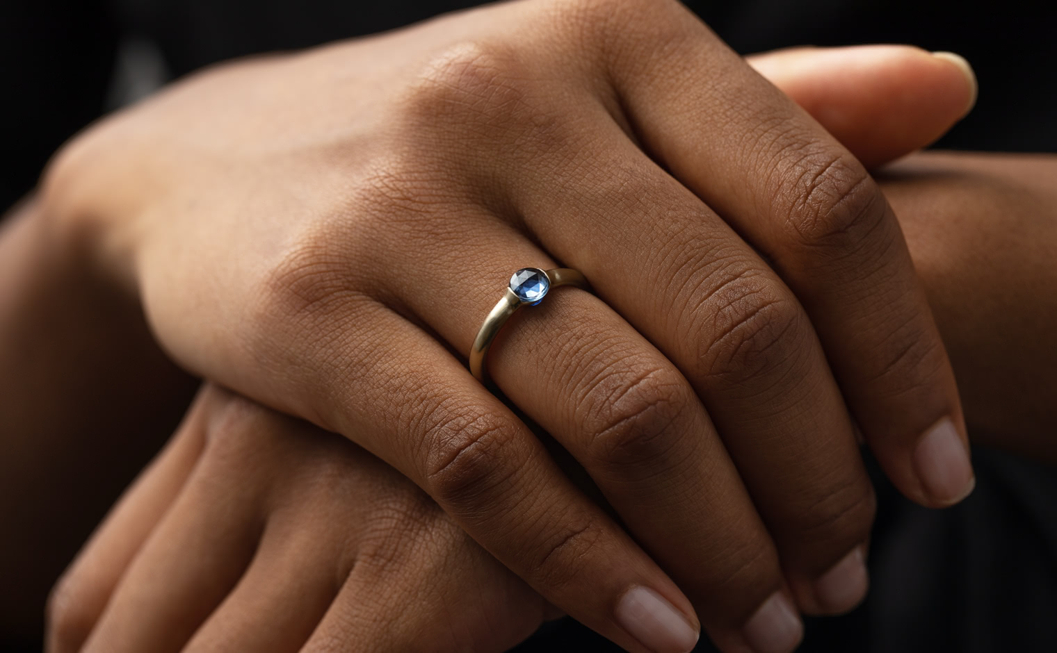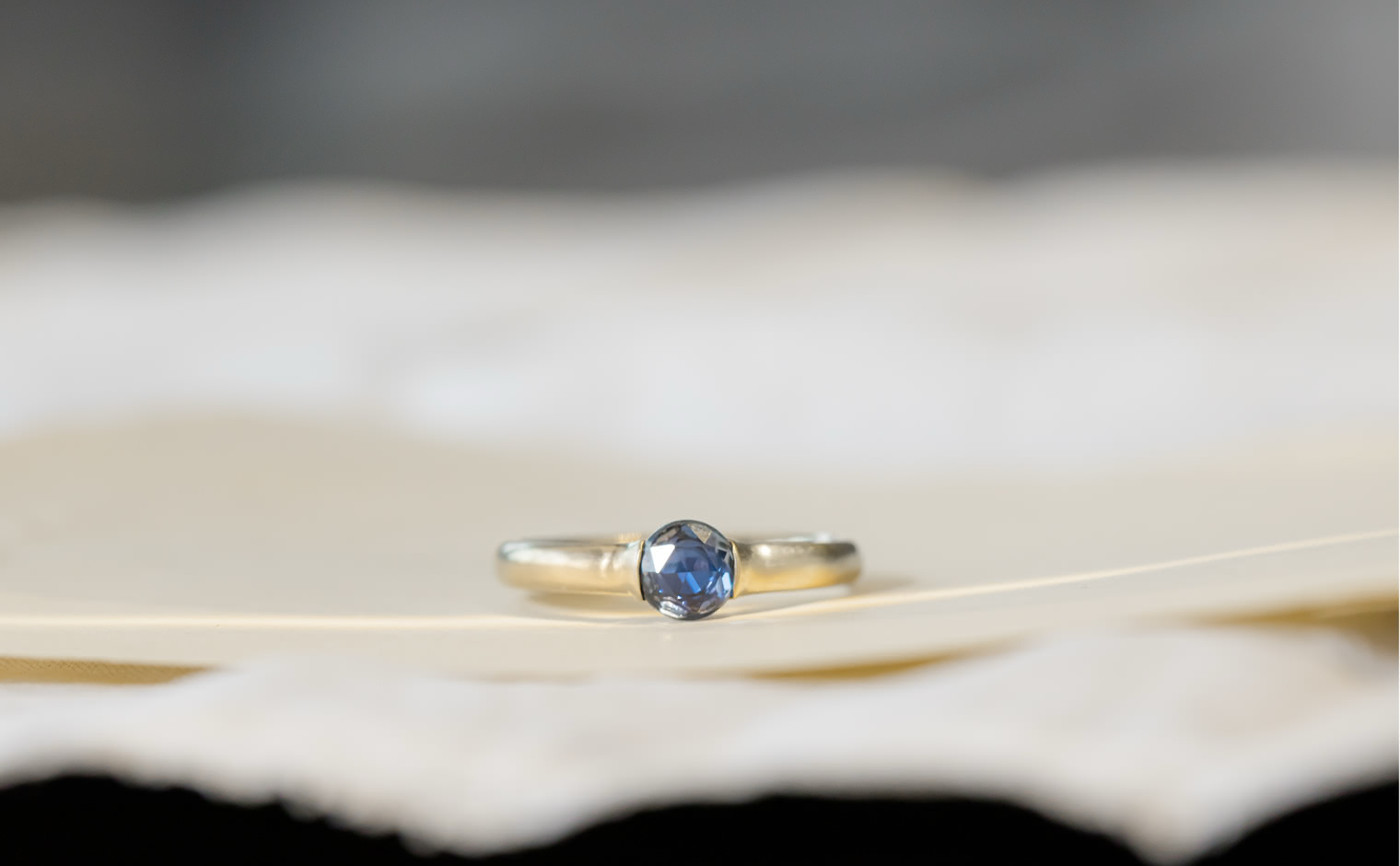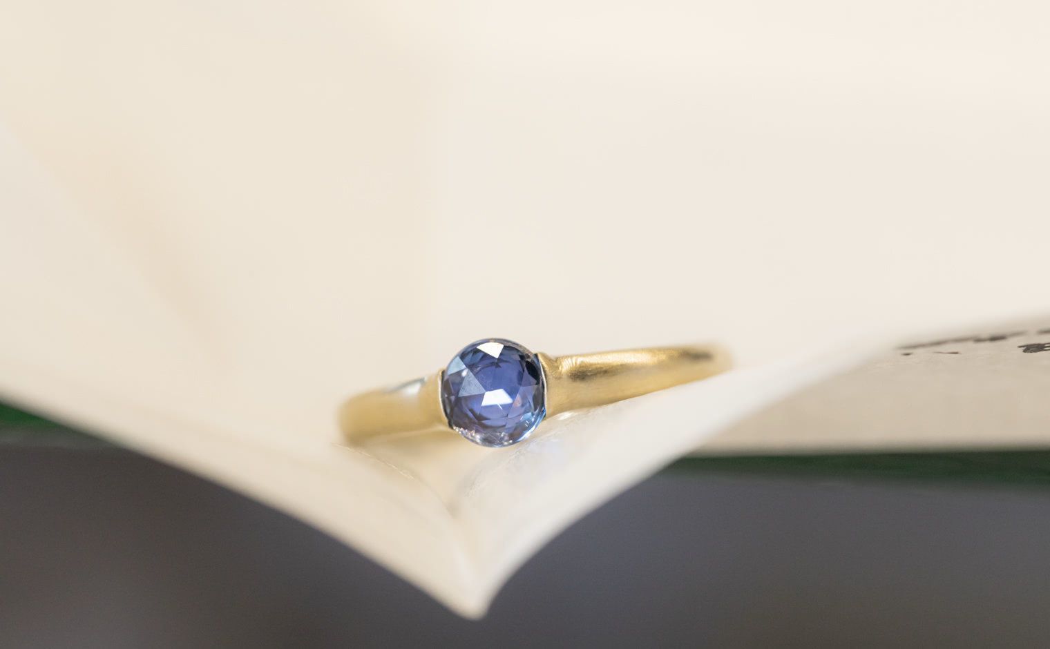 Peak-a-blue. An exceptional creation of two glowing blue sapphires set back-to-back to create a subtle, playful illusion. With one breathtakingly rose-cut blue sapphire expertly set above the minimalistic, hand-polished custom-metal band and a smaller, delectable sapphire with just its culet peaking from the underside of the unique setting, the Sapphire Adamas Ring captures the true essence of understated elegance in its exposed and natural form.