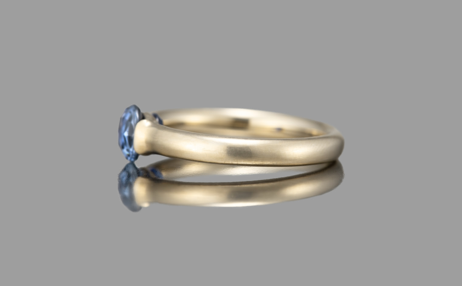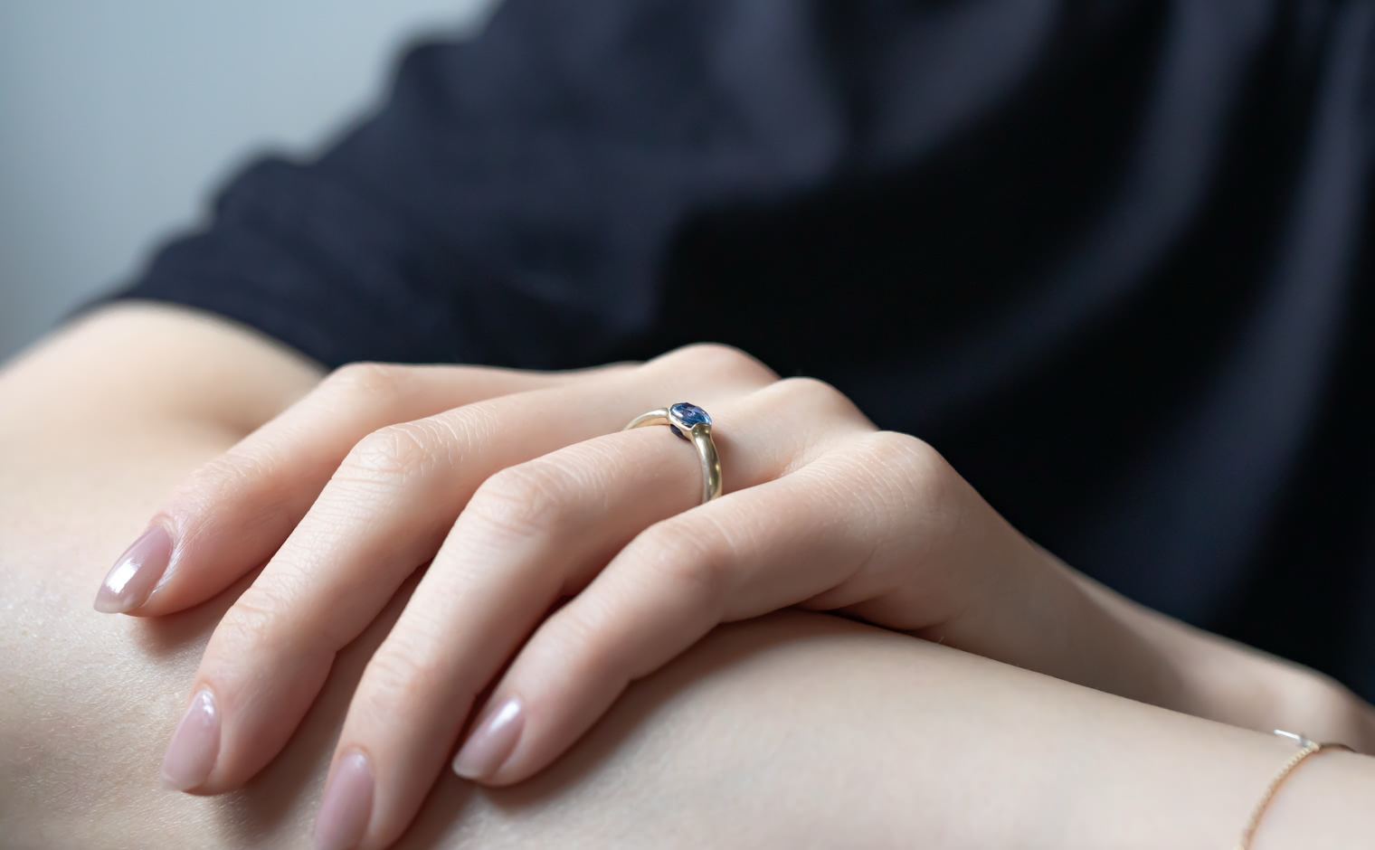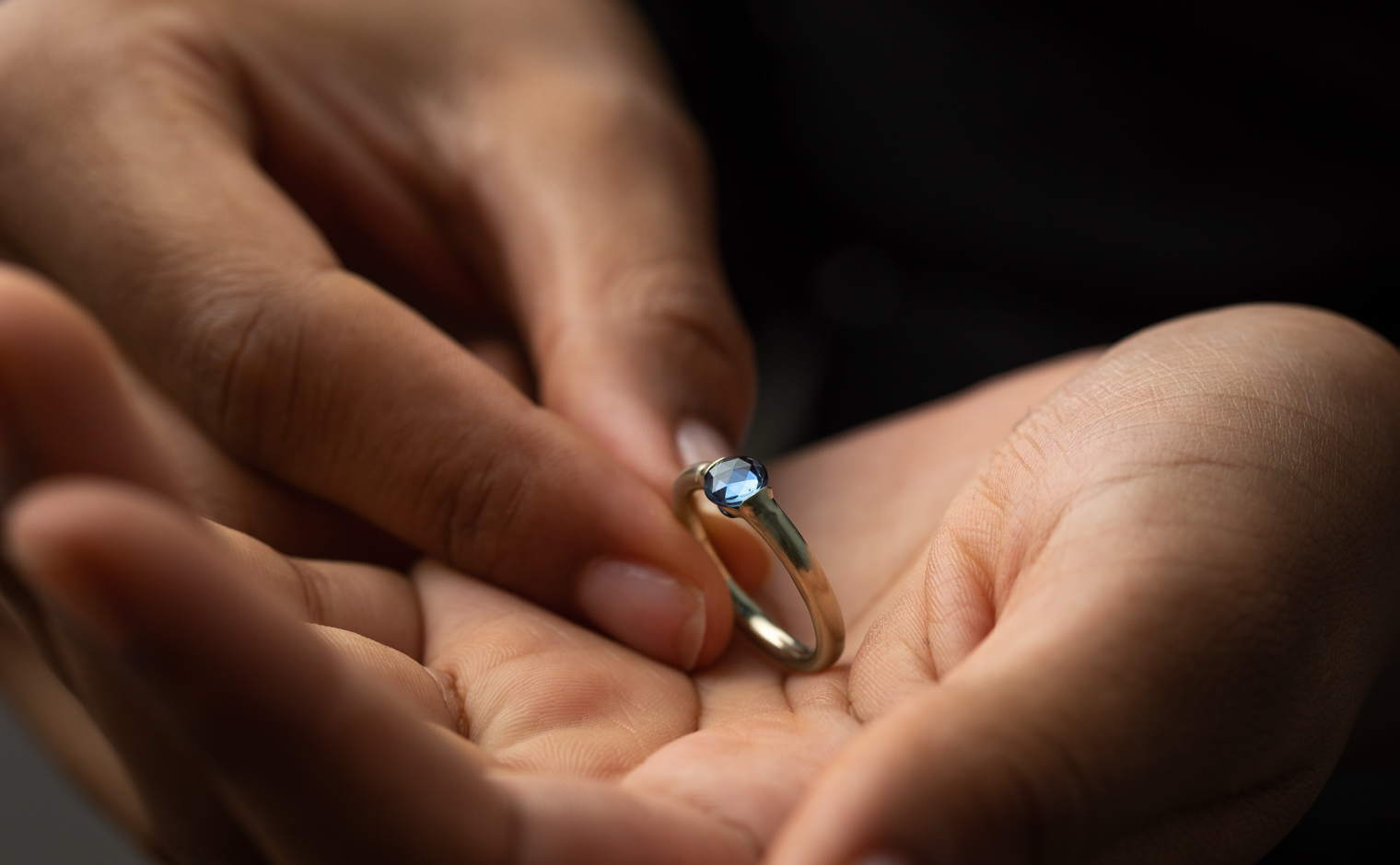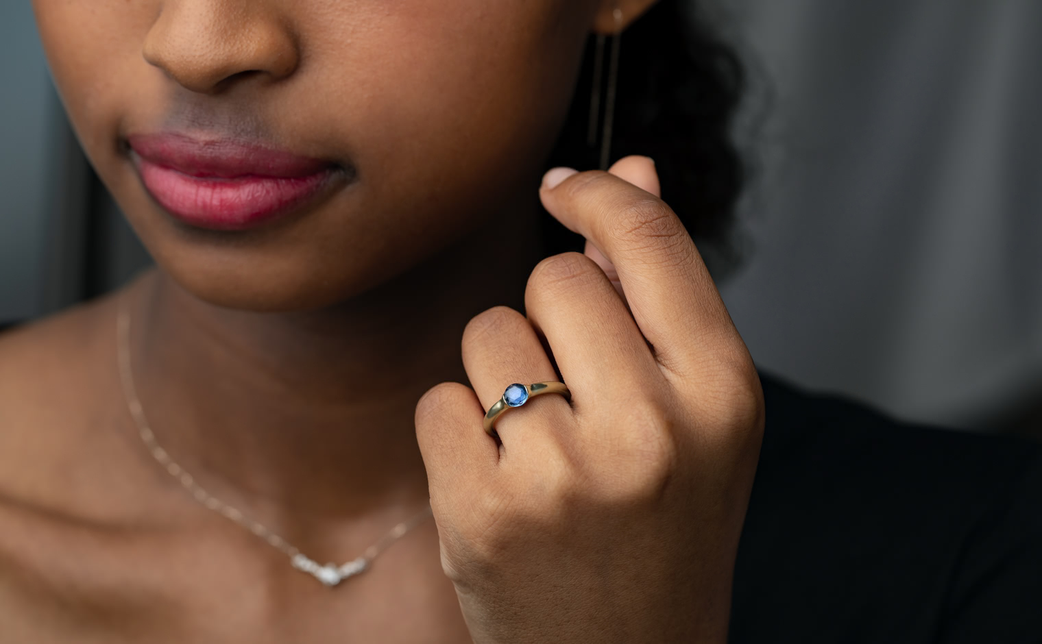 Peak-a-blue. An exceptional creation of two glowing blue sapphires set back-to-back to create a subtle, playful illusion. With one breathtakingly rose-cut blue sapphire expertly set above the minimalistic, hand-polished custom-metal band and a smaller, delectable sapphire with just its culet peaking from the underside of the unique setting, the Sapphire Adamas Ring captures the true essence of understated elegance in its exposed and natural form.