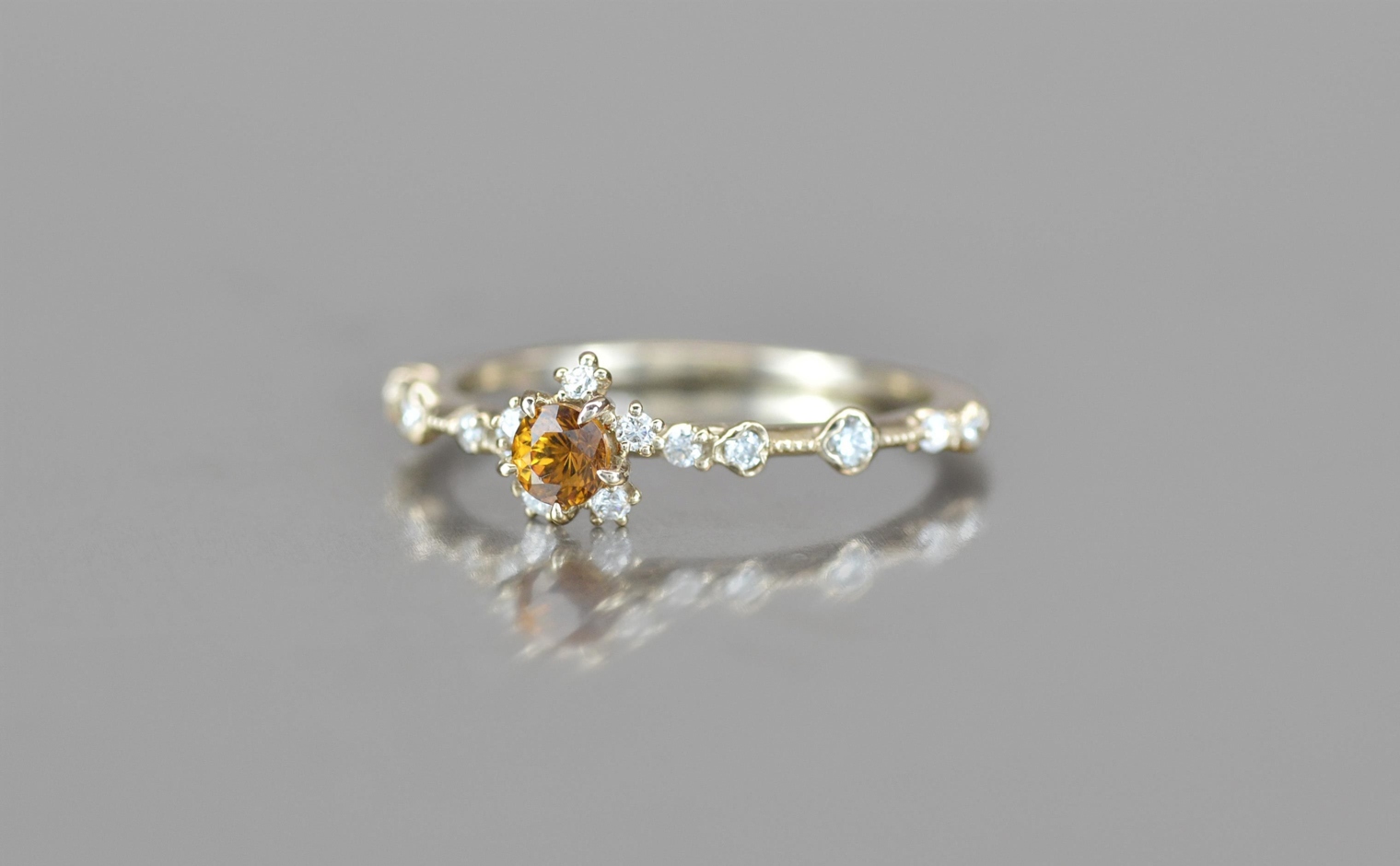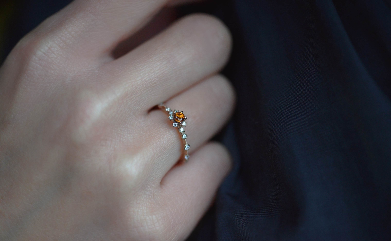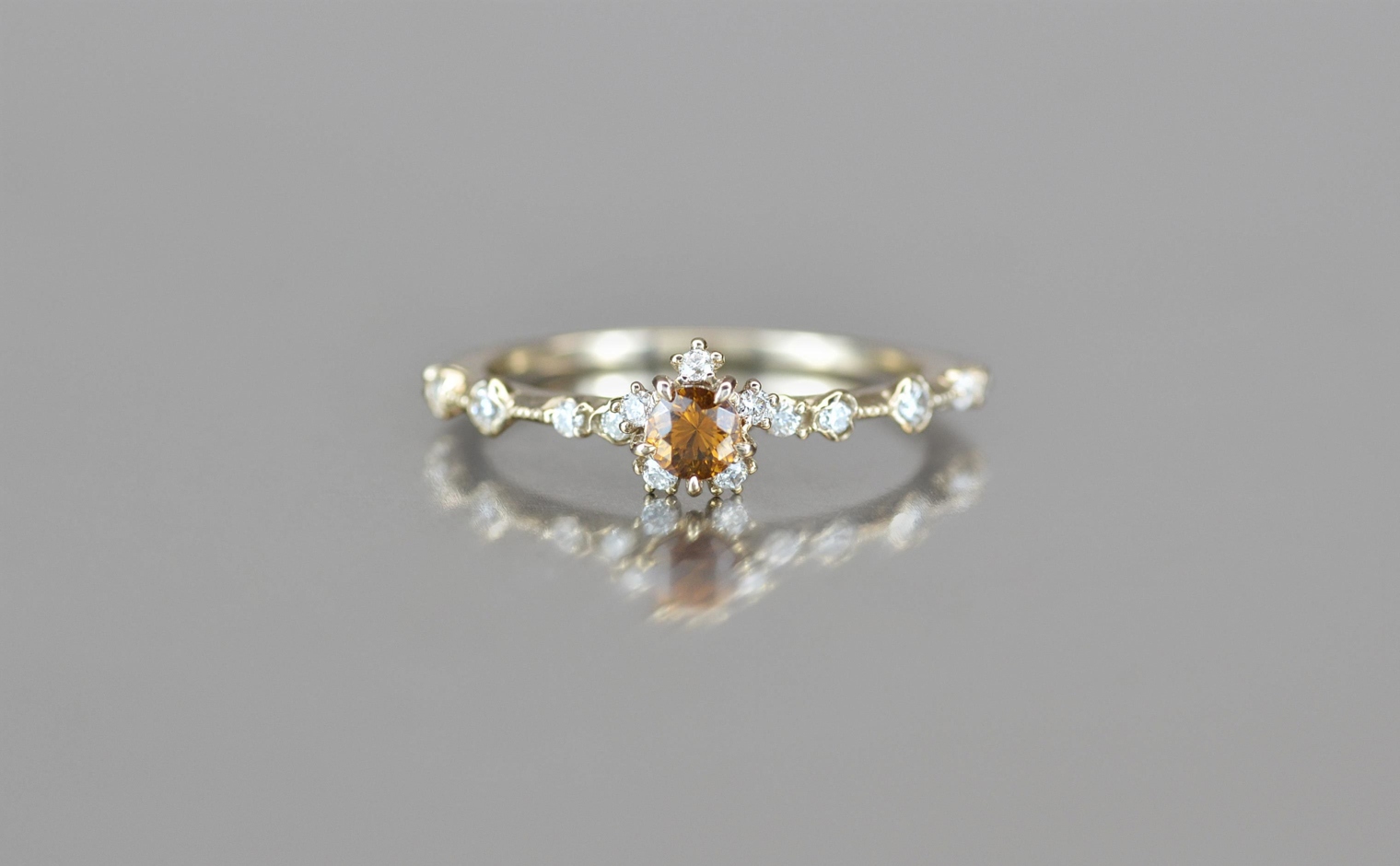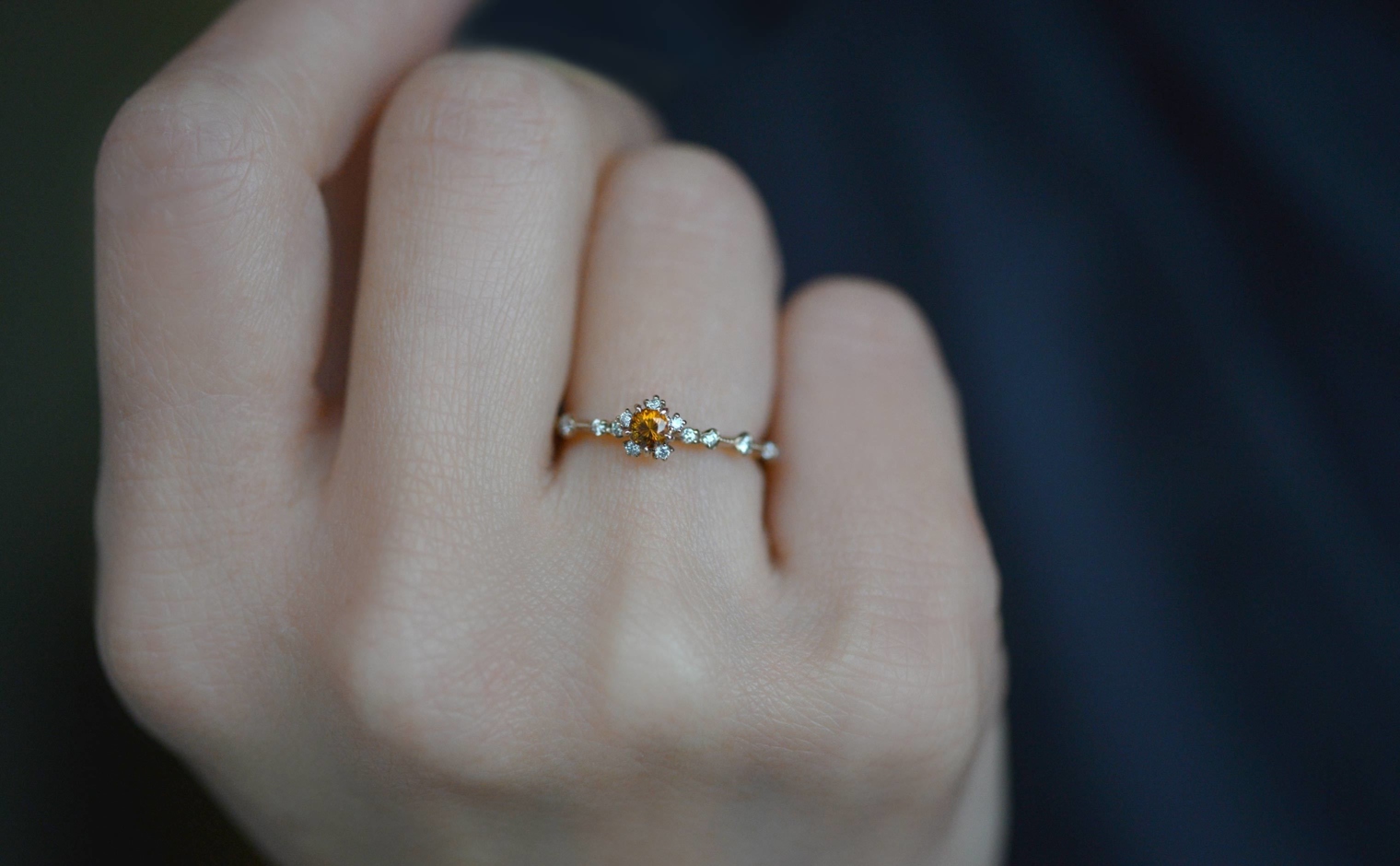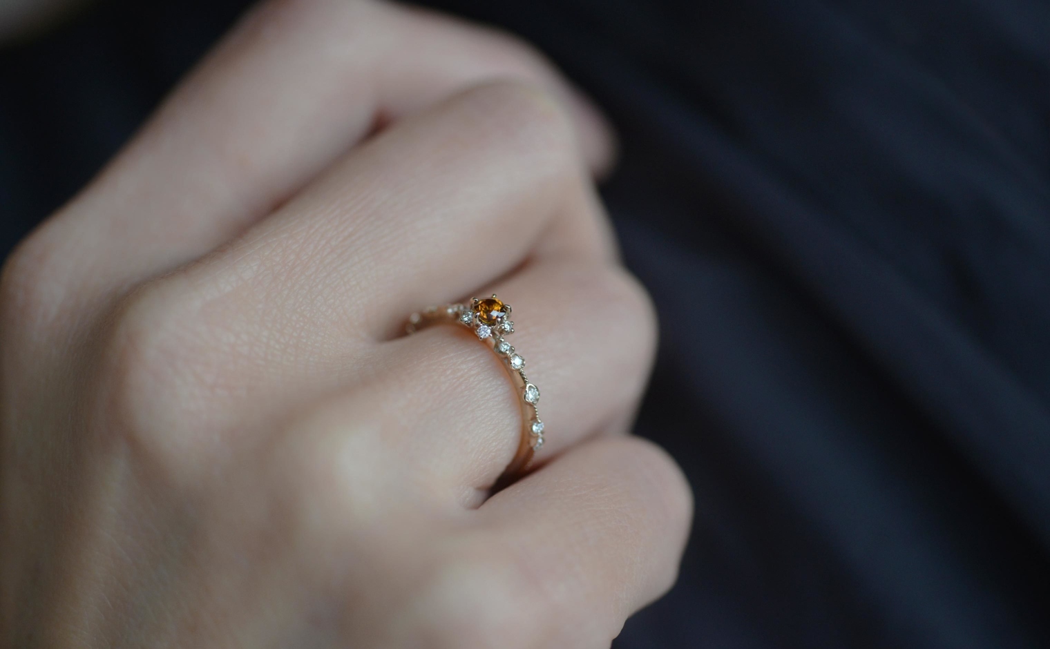 After being expertly chosen, these gems have then been cut to celebrate their natural color before being set in a ring of custom-blended gold. Accompanied with brilliantly sparkling diamonds along the thin band, this is a ring for lovers of the unique. -